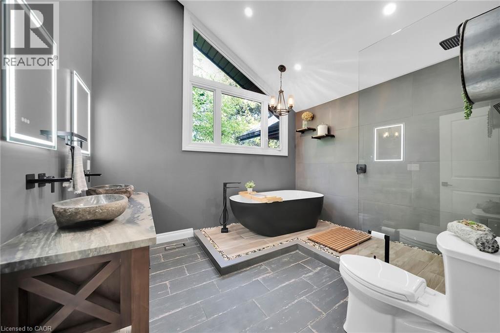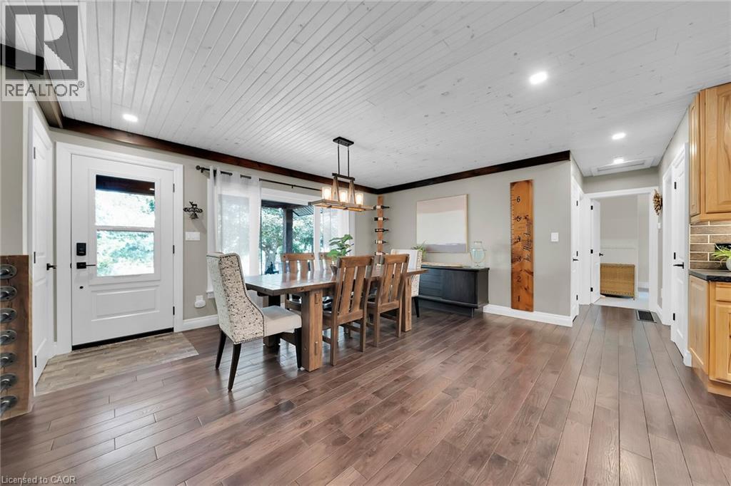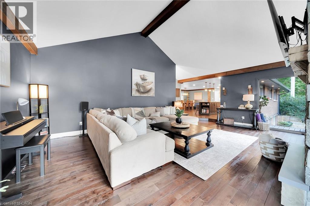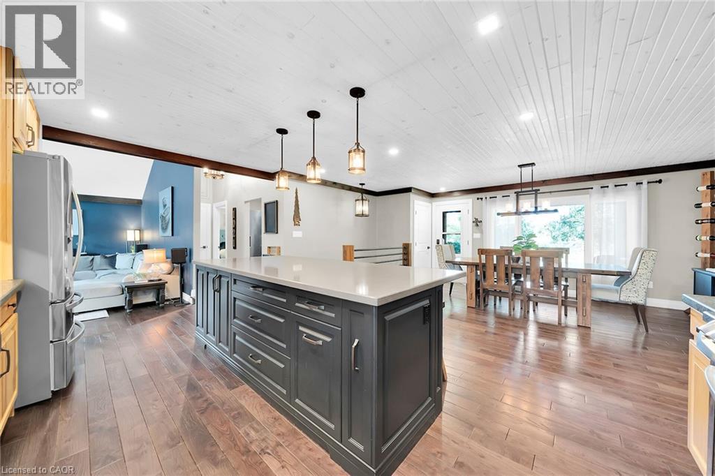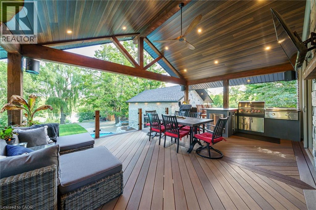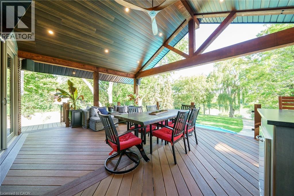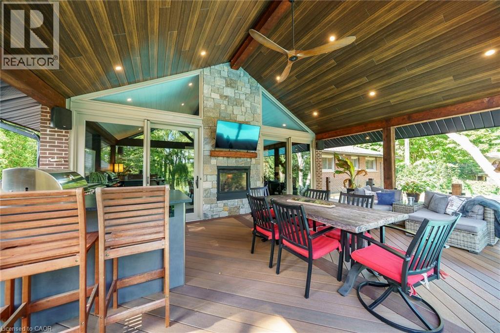 Irreplaceable Grand River Waterfront Masterpiece. A home and cottage retreat all in one with rare & sought after private dock! Exquisitely updated throughout by “Kreekside Construction” this 4 bedroom, 4 bathroom all stone & complimenting brick Bungalow with walk out basement is situated on “Muskoka” Like 100’ x 299’ lot with over 20 km of navigable water allowing you to boat, wakeboard, fish, kayak & enjoy all that Grand River Living has to offer right from your own backyard. Incredible curb appeal with detached 20’ x 30’ garage offering heat, A/C, epoxy floor, & Trusscore interior. Entertainers dream backyard Oasis complete with Douglas Fir post & beam covered porch with composite decking, TV, stone clad double-sided gas FP, outdoor kitchen w/ leathered granite, BBQ & griddle, 3 hole putting/chipping green, barrel sauna, hot tub, & 17’ x 33’ salt water heated pool. The easily accessible waterfront area includes extensive use of armour stone, entertaining area with astroturf, & steps to access your 6’ x 20’ Dock. The stunning interior features approximately 3200 sq ft of beautifully updated living space highlighted by great room with vaulted ceilings, wood beamed accents, gas fireplace set in stone floor to ceiling hearth, Pagoda hardwood flooring throughout, custom hickory kitchen cabinetry with granite countertops, contrasting island with quartz, & walk-in pantry, dining area, 3 spacious MF bedrooms including primary suite with vaulted ceilings & spa bathroom with soaker tub, walk in tile shower, & infloor heat. The finished lower-level features rec room with woodstove set in brick hearth, 4th bedroom, 2 pc bath, plus gym/living room area with 2 pc bath & separate entrance allowing for ideal inlaw set up or perfect home office. Conveniently located close to amenities & easy access to Ancaster, Caledonia, & 403. Grand River Living is more than a place to call home – It’s a Lifestyle you deserve to Experience. (id:4555)
