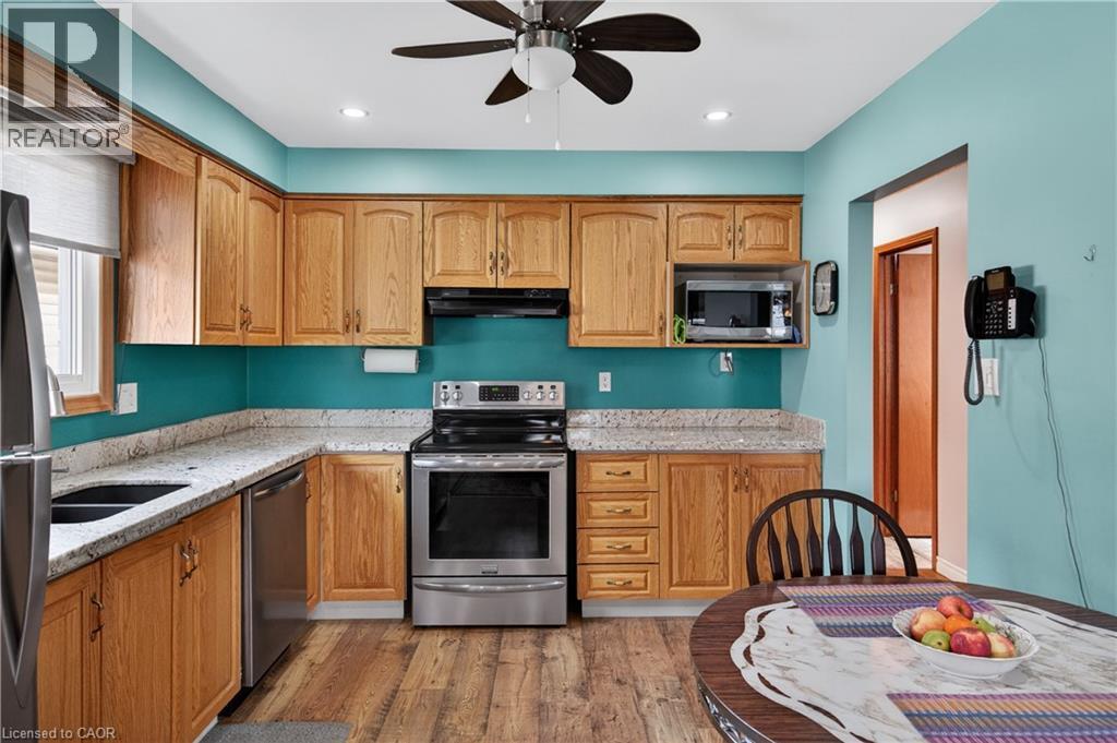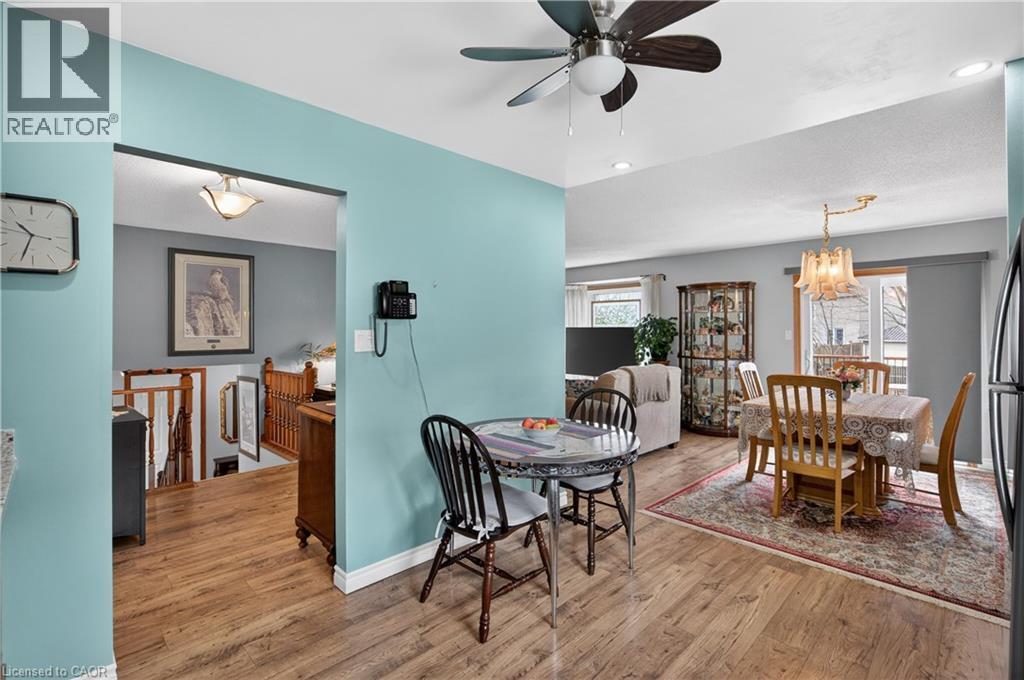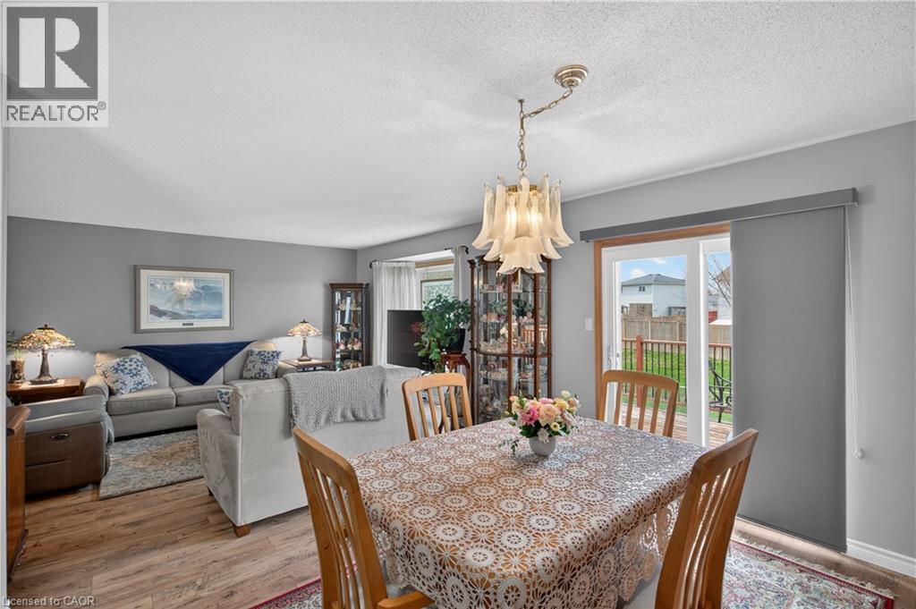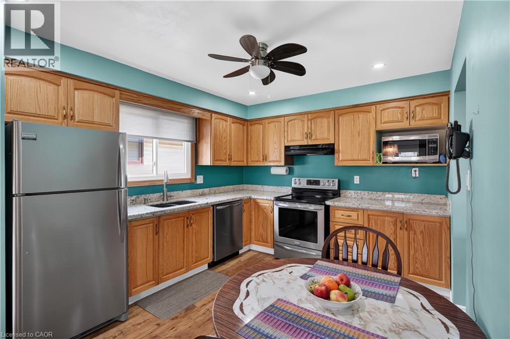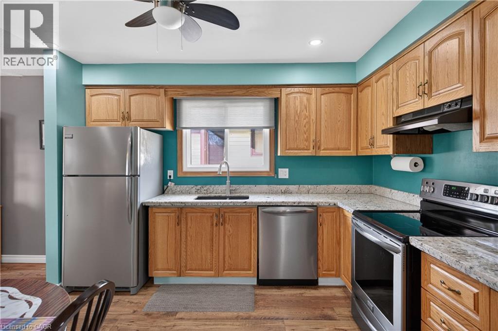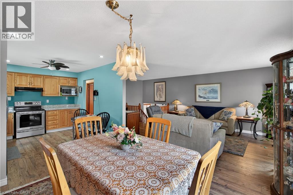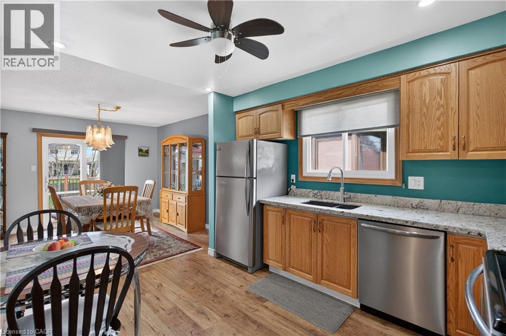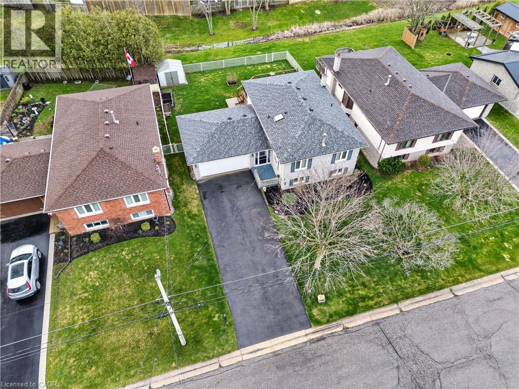 Welcome to this well-maintained 2+1 bedroom, 2 bathroom raised ranch, ideally situated on a quiet street in the charming town of Caledonia. Set on a mature 60.04’ x 104.99’ lot backing onto green space, this property offers a rare blend of privacy, functionality, and lifestyle appeal. The home features surfaced parking for 4+ vehicles along with a bonus double car garage with convenient inside entry. A large covered front porch leads into a breezeway and welcoming front door with a sidelight window, filling the spacious foyer with natural light. Just a few steps up, the main level opens into a bright, open-concept layout designed for everyday living and entertaining. Enjoy a spacious living room with a beautiful bay window, a dedicated dining area with sliding doors to an oversized rear deck, and an eat-in kitchen complete with updated countertops, stainless steel appliances, and pot lighting. The primary bedroom offers an oversized closet, complemented by an additional generously sized bedroom and a 4-piece bathroom with a skylight. The fully finished lower level adds exceptional versatility, featuring a large recreation room with gas fireplace, retro bar area, a spacious third bedroom with ample storage, and a 3-piece bathroom with a walk-in glass shower. Laundry facilities and additional storage complete the space. Step outside to a large, private backyard with a storage shed - perfect for relaxing or entertaining. Noteworthy updates include kitchen appliances (2016), many windows and the rear sliding door (2018), roof shingles (2019), and laminate flooring (2020). Located on sought-after MacCrae Drive, residents enjoy a peaceful, family-friendly setting with easy access to parks, schools, and the Grand River. Caledonia offers a strong sense of community while remaining just a short drive to Hamilton, providing convenient access to urban amenities, major routes, and commuter options. (id:4555)