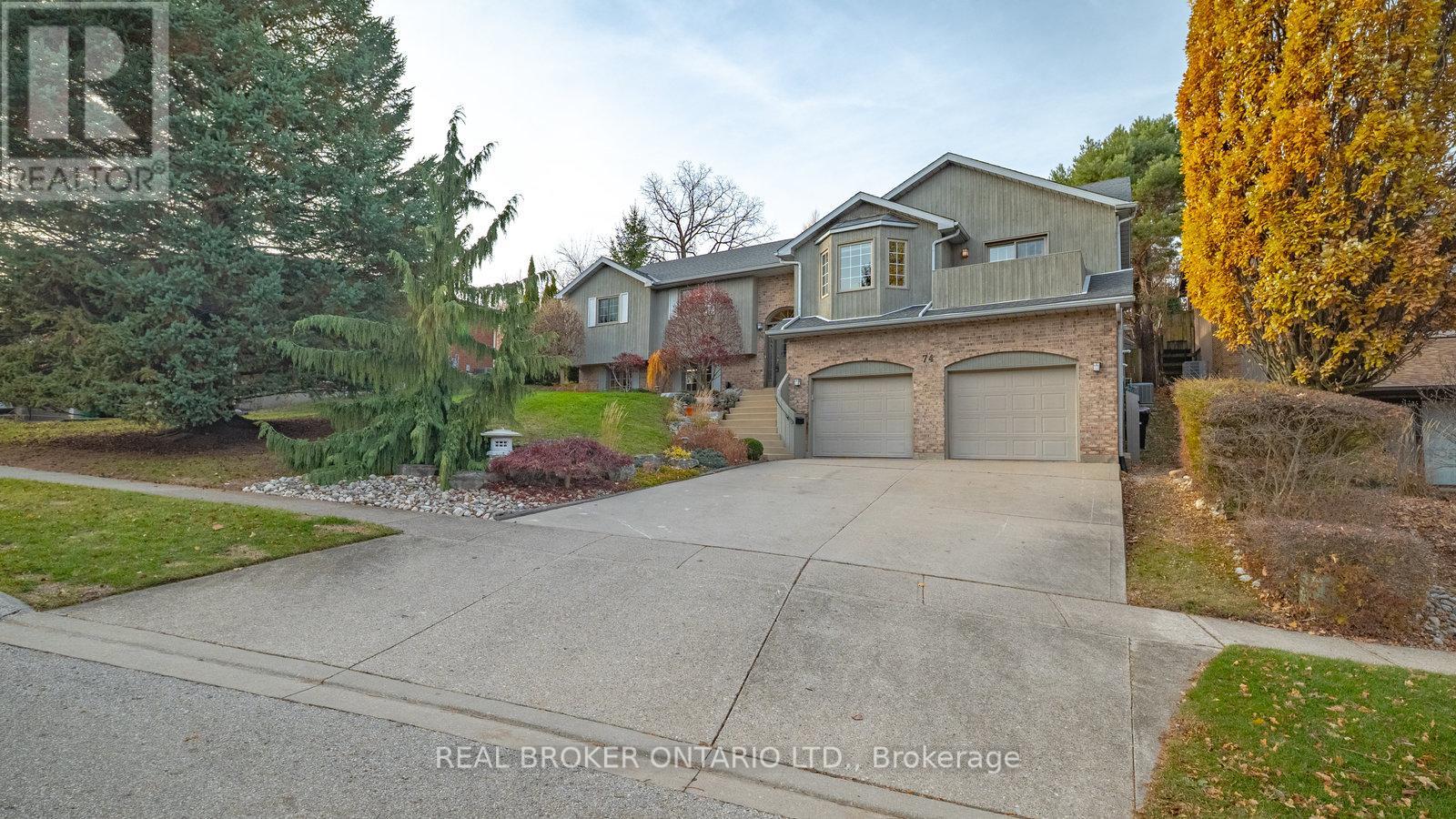 Set on a beautiful, elevated lot in West Galt, 74 Gordon Street offers the kind of space and layout that growing households look for in this sought-after area. A grand raised-ranch entry welcomes you with room to breathe, leading easily to both levels and setting the tone for how much space this home gives you. The upper level features an expansive formal living room with a bay window, a dedicated dining room, and a sunken family room anchored by a gas fireplace. The chef's eat-in kitchen has granite counters, stainless steel appliances, and direct access to the deck for easy indoor-outdoor living. Hardwood floors run throughout the main areas, and the private wing includes a generous primary suite with a walk-through closet and spa-like bathroom, along with two more large bedrooms and a second designer bath. The lower level adds even more flexibility with a massive rec room with large windows, an additional bedroom, a full bathroom, laundry room, storage, and direct access to the oversized two-car garage. Outside, the yard feels like cottage country with its terraced design, mature trees, and multiple outdoor spaces including a deck with pergola, a patio ready for a hot tub, and a private front sitting area perfect for morning coffee. This is a well-kept home in a quiet corner of West Galt with quick access to schools, parks, and everyday amenities. Come see what makes this one so special. (id:4555)