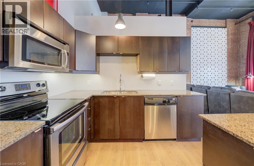 MODERN LOFT LIVING! Welcome to this stunning loft, where soaring 16ft ceilings and expansive windows create a bright, airy ambiance. Featuring polished concrete floors, exposed brick, ducts, pipes, and iron columns, this space seamlessly blends original character with modern sophistication. Set within a 1910 fabric weaving factory stylishly converted into loft-style residences, Unit #112 offers over 1,250 sqft of thoughtfully designed living space. This one-bedroom plus den unit includes two full bathrooms, with the upper primary suite featuring a private ensuite. The kitchen is a chef’s dream, boasting an eat-in island, granite countertops, under-cabinet lighting, custom cabinetry, and stainless steel appliances. Above the den, a unique loft space—currently used as a gym—offers endless possibilities, from a cozy reading nook to a creative retreat. Additional conveniences include in-suite laundry, a private front door entry, one outdoor parking space, and a storage unit. Building amenities include a gym and party room. Perfectly located just steps from downtown, enjoy locally roasted coffee, boutique shops, the library, and a leisurely walk across the Grand River Pedestrian Bridge. You’ll also find Gaslight and Spruce Park mere minutes away. Experience the perfect blend of history, charm, and modern living—this loft is truly one of a kind! (id:4555)