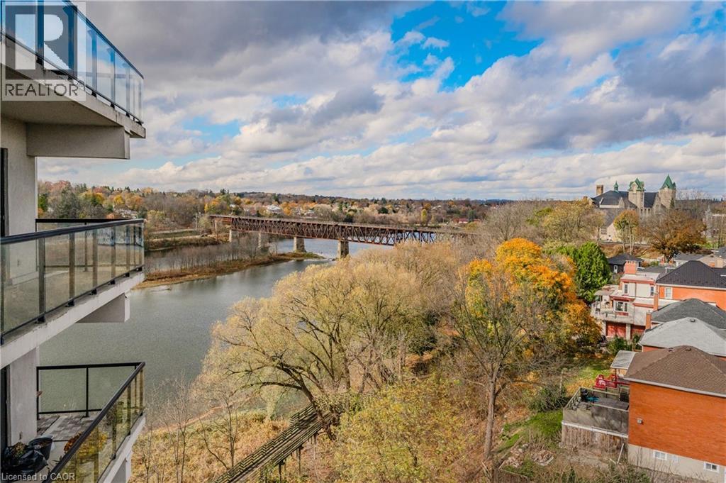 Welcome to this beautiful 2-bedroom, 2-bathroom condo in the heart of Galt, offering stunning views of the Grand River. This spacious unit features a large balcony where you can enjoy peaceful river views, ideal for relaxing or entertaining. With two dedicated parking spots—one underground and one on the surface—you’ll have both convenience and flexibility. Inside, enjoy an open layout with ample natural light, modern finishes, and comfortable living spaces. This condo perfectly blends scenic charm with urban convenience, making it an ideal home for those seeking a balance of comfort, style, and a picturesque location. The condo has many amenities including a roof top deck, gym, guest suites and social room! The condo fee also includes a locker, heat, air conditioning and water! Book your viewing today and be ready to call this condo Home! (id:4555)