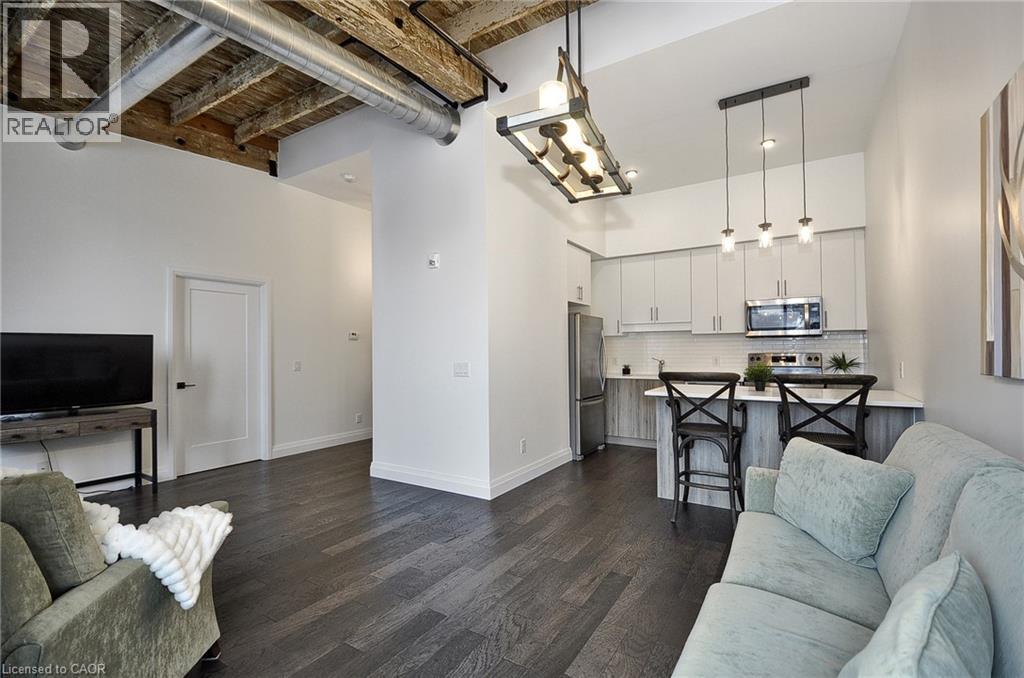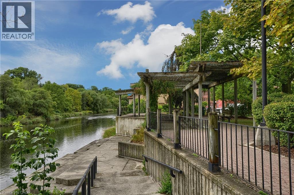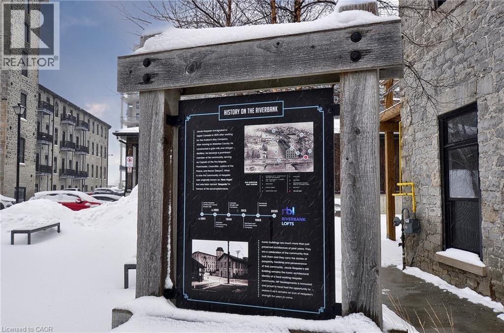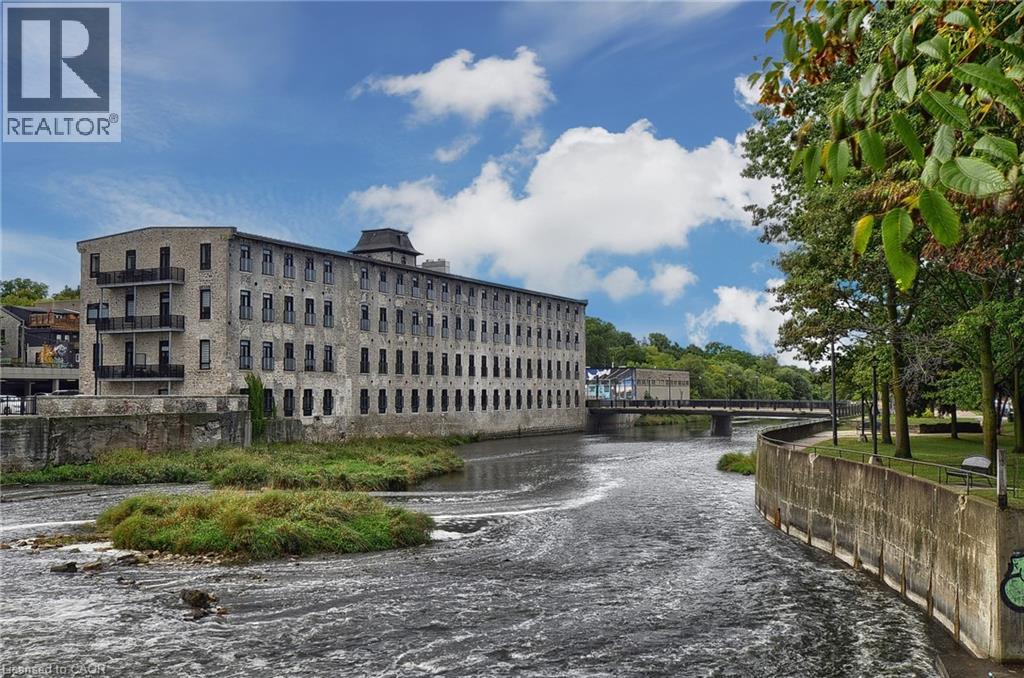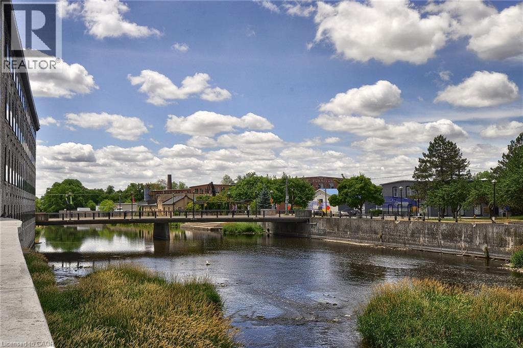 Experience boutique living at Riverbank Lofts, a landmark conversion in the heart of historic downtown Hespeler. This iconic riverside building blends heritage charm with modern sophistication along the banks of the Speed River. This bright one-bedroom condo features soaring ceilings, oversized windows, and exposed wood beams that highlight the building’s character. The open-concept living space flows into a contemporary kitchen with quartz countertops and a breakfast bar, perfect for entertaining. Step out onto your private balcony to unwind. The spacious bedroom includes a large walk-in closet, in-suite laundry, and high ceilings throughout. Includes one parking space and access to premium amenities such as three resident lounges, a fitness centre, bike storage, and a dog wash station. Just steps to cafés, shops, parks, and scenic river trails, this is boutique urban living at its finest. (id:4555)