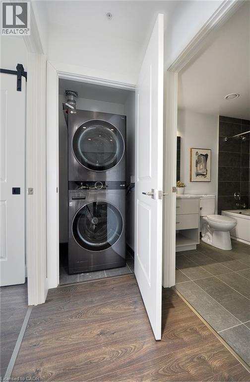This elegant and spacious condo has 2-bedrooms, 2-bathrooms and TWO parking spaces and is completely move in ready, located in the Gaslight District. A beautifully designed suite offering a bright open-concept kitchen and living area, enhanced by custom built-ins and expansive windows that flood the space with natural light. Upgraded appliances, pull out cabinetry in the pantry, and other closet built ins. Both bedrooms and the living room feature direct walkout to the expansive balcony, creating an inviting indoor-outdoor living experience. The primary ensuite is complete with double sinks, while in-suite stacked laundry adds everyday convenience. Both bathrooms are 4 piece. Reverse osmosis system, and one out of the two parking spaces is equipped with EV plug for an electrical car. Residents enjoy access to premium amenities, including a fully equipped fitness centre, outdoor terrace, and stylish event spaces. Ideally located just moments from downtown Galt’s renowned restaurants, cafés, markets, and more. And did you catch the part about 2 parking spots? Don't need two? Sell one. They're always in demand. (id:4555)