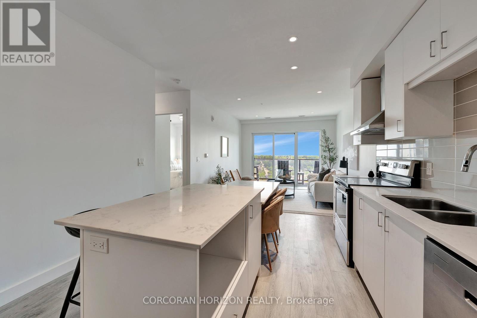 Modern and refined, this 2-bedroom, 2-bathroom condo offers 1,007 sq ft of well-designed living space in Cambridge's highly sought-after Gaslight District-the city's premier hub for dining, entertainment, and culture. The bright, open-concept layout features 9-foot ceilings, a contemporary kitchen, and expansive windows that fill the space with natural light. The primary bedroom includes a walk-in closet, while in-suite laundry adds everyday convenience. Enjoy a generous private balcony, accessible from both the living room and bedroom, showcasing panoramic views of the Grand River, Gaslight Square, and the surrounding cityscape. This unit also includes two underground parking spaces. Residents of Gaslight Condos have access to an exceptional array of amenities, including a state-of-the-art fitness centre, games room, study and library area, and an outdoor terrace with pergolas, fire pits, and BBQ areas overlooking the vibrant square below. Ideally located in one of Cambridge's most dynamic communities, this condo offers a perfect balance of modern comfort and urban living. (id:4555)