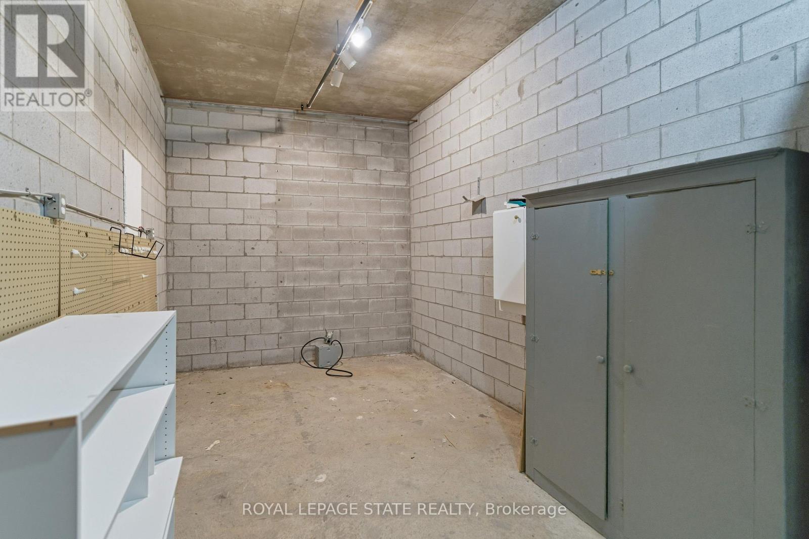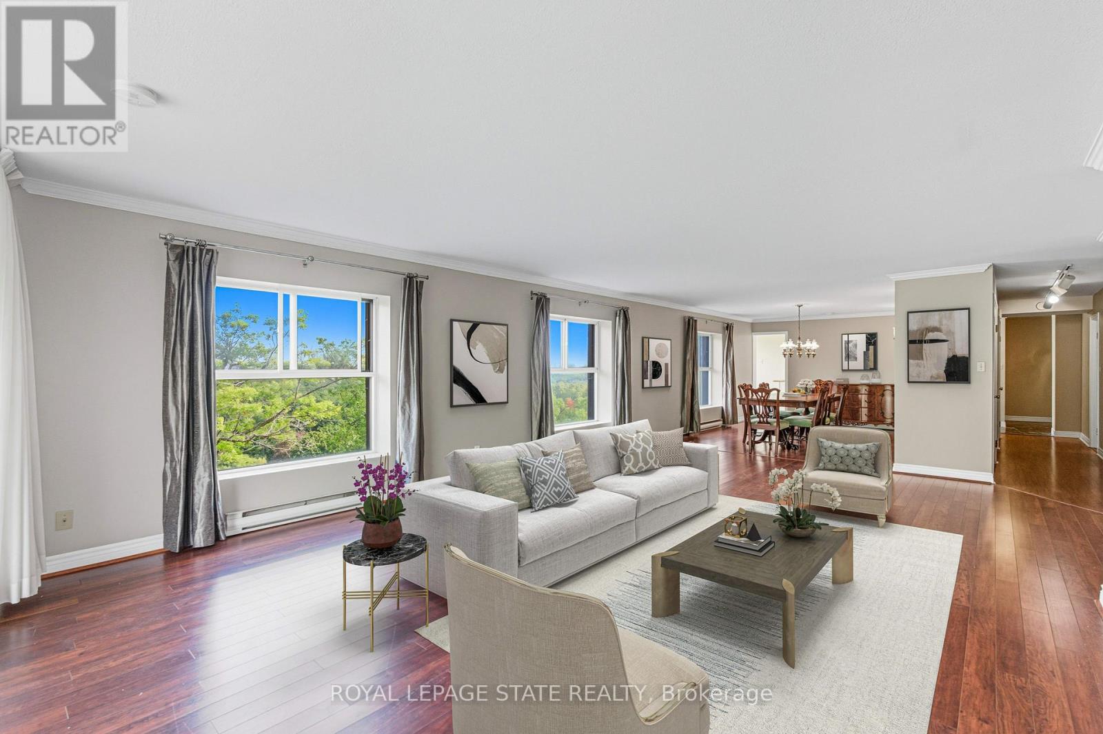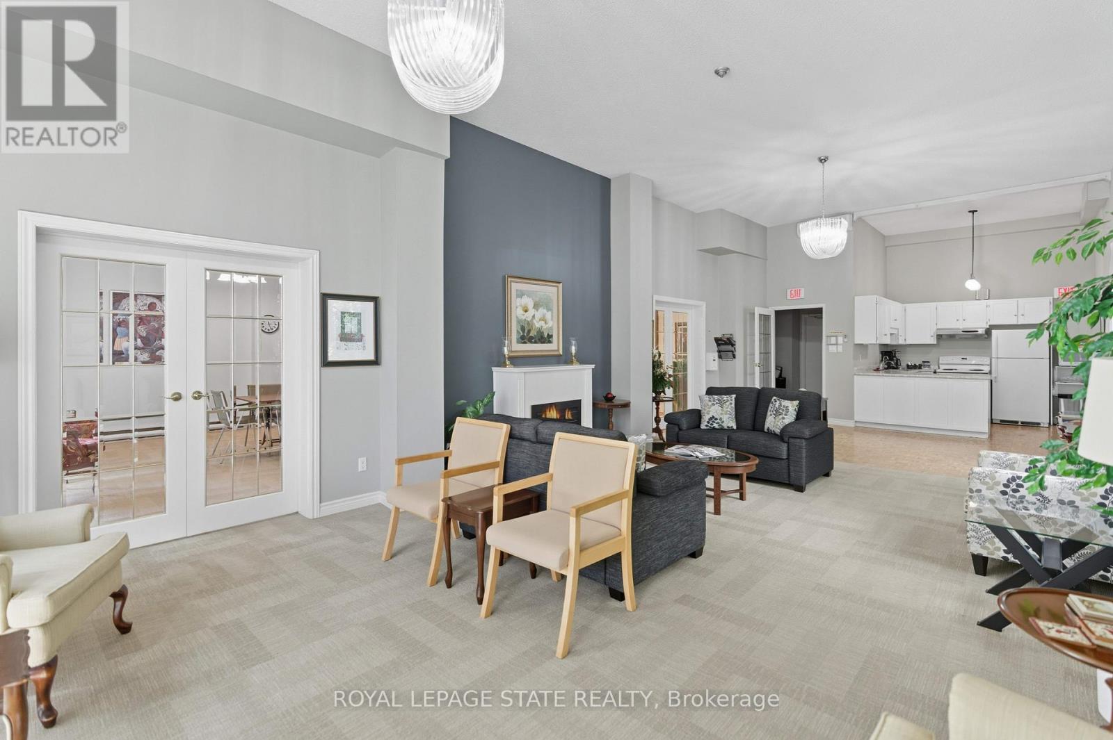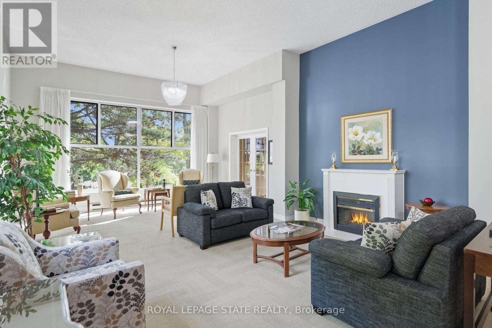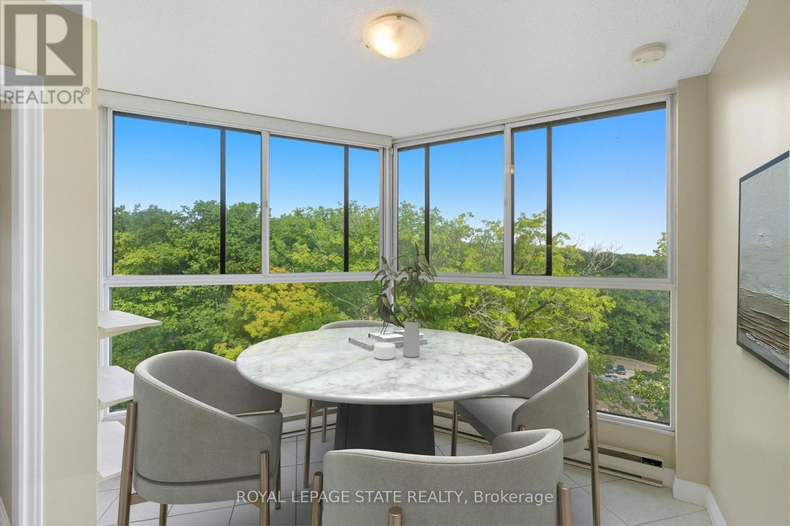 Welcome to The Highlands by the Park; 20 Berkley Road. Nestled atop a hill at the end of a quiet cul-de-sac in historic West Galt, this prestigious condominium offers tranquility, privacy, and sweeping views of nature and the city skyline. Overlooking a majestic woodlot, Victoria Park, and beyond, this building is one of Cambridge's hidden gems. This spacious 2,418 square foot, carpet-free unit offers a rare combination of size, layout, and natural light. With 3 generously sized bedrooms, 2 full bathrooms, and a thoughtfully designed floor plan, it's ideal for those seeking a blend of comfort and functionality. Step into an impressive foyer with mirrored walls and a large closet before entering the bright eat-in kitchen, complete with ceramic tile, crisp white cabinetry, built-in range top, track lighting and a cozy breakfast nook that looks out over lush greenery. The kitchen opens into a formal dining room with laminate flooring and elegant wall sconces; perfect for entertaining. The adjacent oversized living room features a wood-burning fireplace (sold in as-is condition) and leads to a bright all-season solarium with floor-to-ceiling windows, perfect as a den, office, or creative space. Down the hallway, you'll find three spacious bedrooms, including a large primary suite with two large windows, an expansive walk-in closet, and a 5-piece ensuite. A second 4-piece guest bath serves the remaining bedrooms. The in-suite laundry closet is conveniently tucked away off the main hallway. Building amenities include a rooftop terrace with panoramic views, ample seating, and barbecue, a party room with full kitchen and lounge area, meeting room, exercise room, and beautifully maintained common spaces. This unit includes one underground parking spot with a tandem storage locker. Don't miss this rare opportunity to live in a peaceful, elevated community surrounded by nature, just minutes from the charm and culture of West Galt. (id:4555)