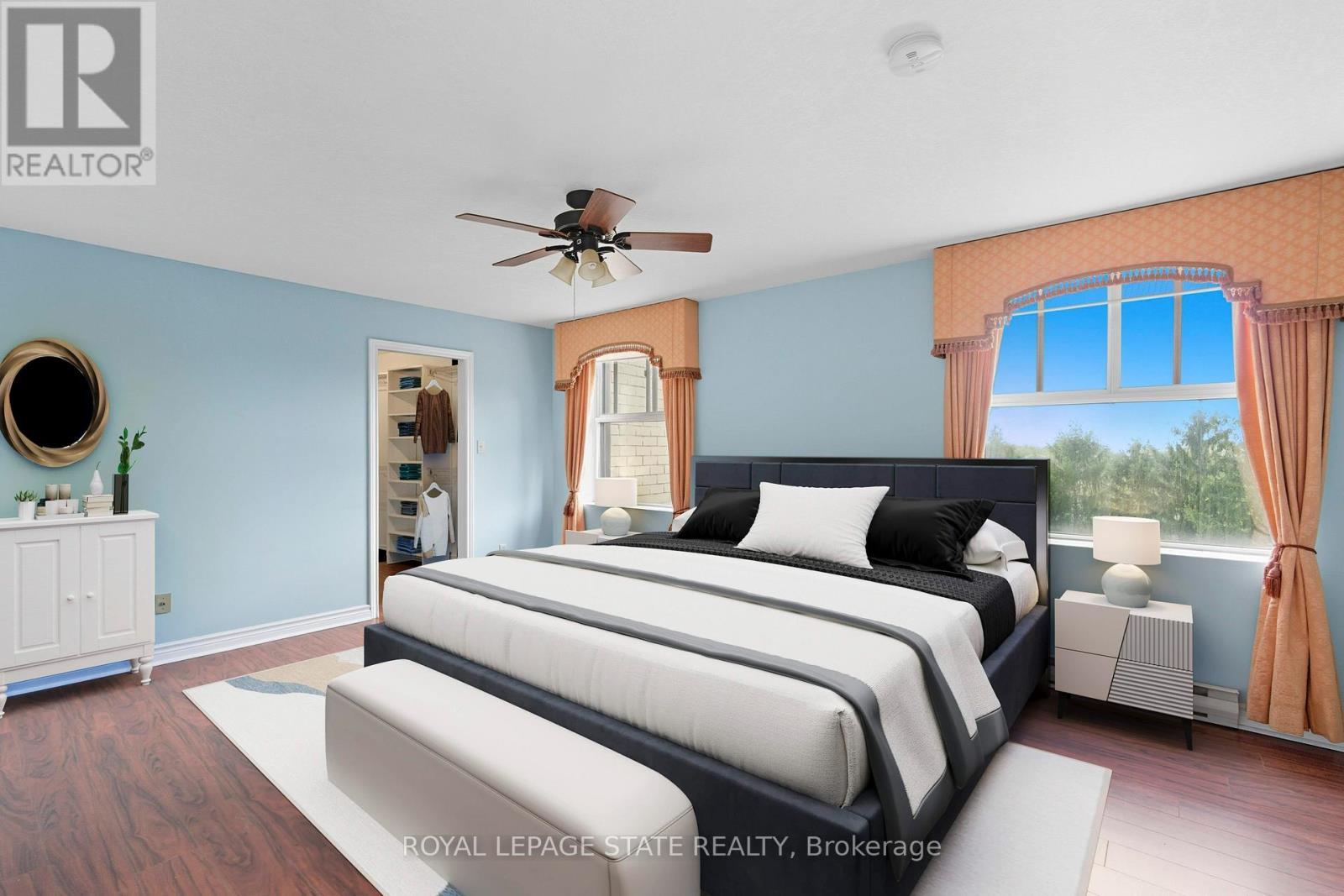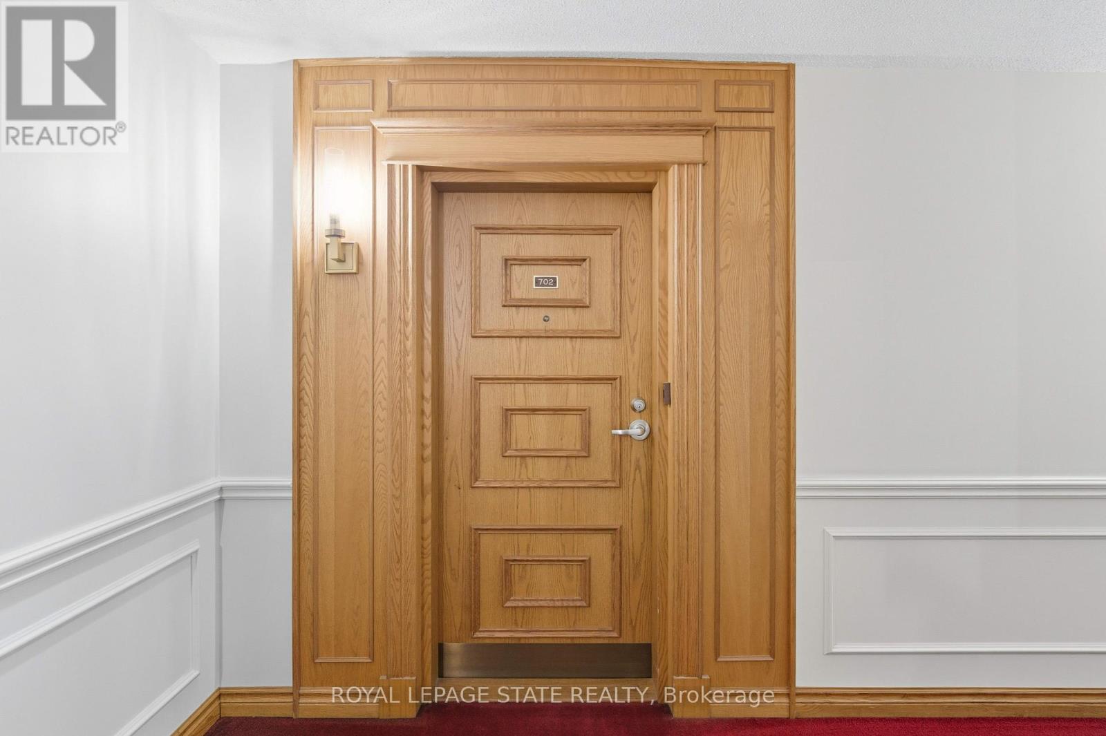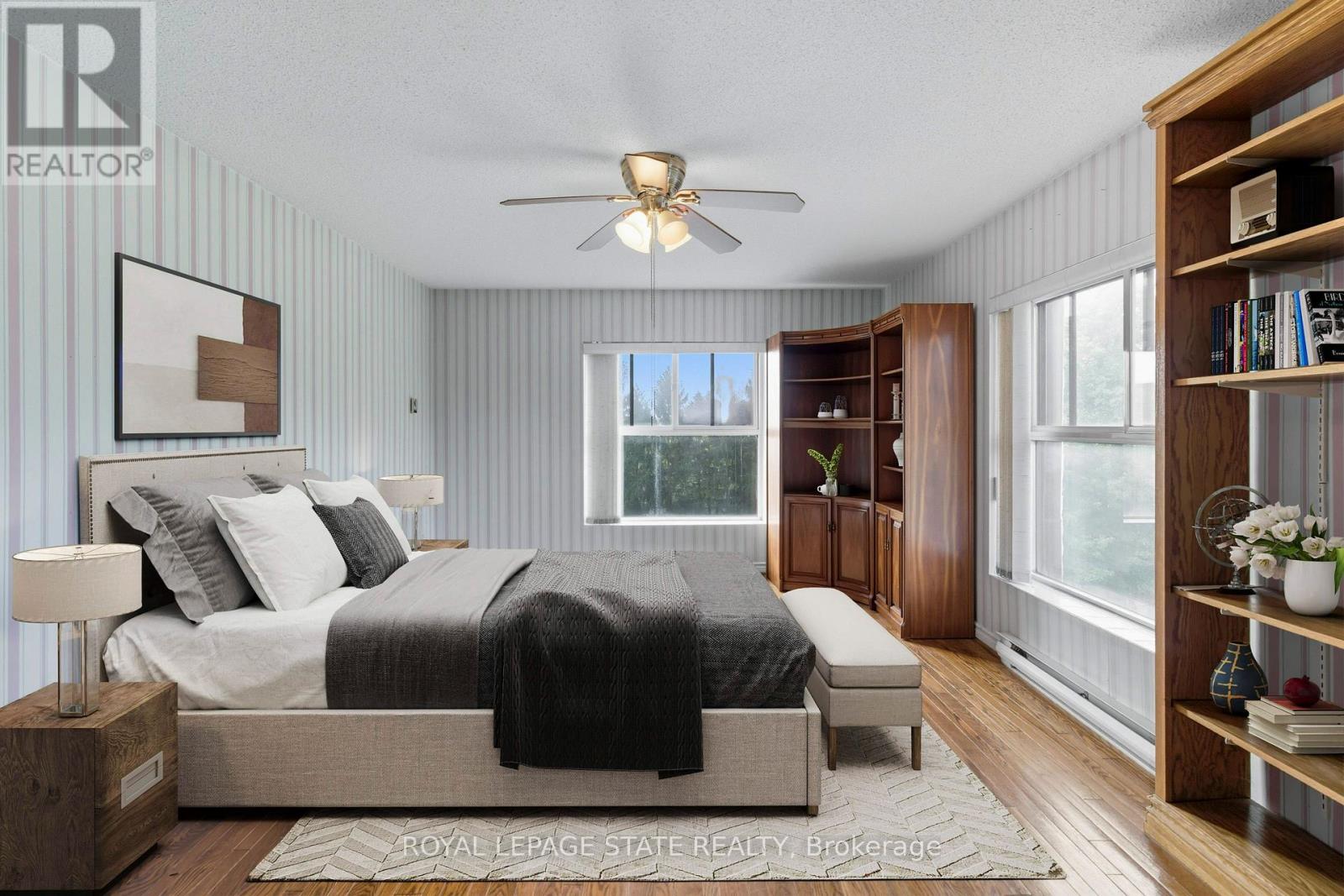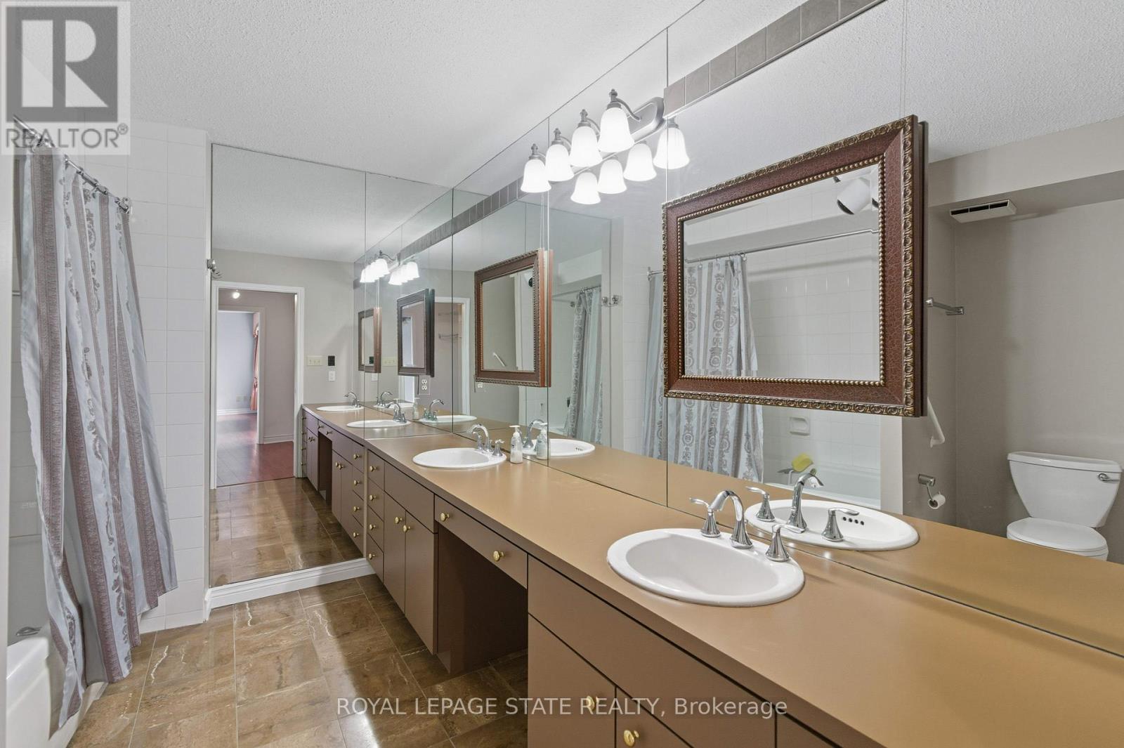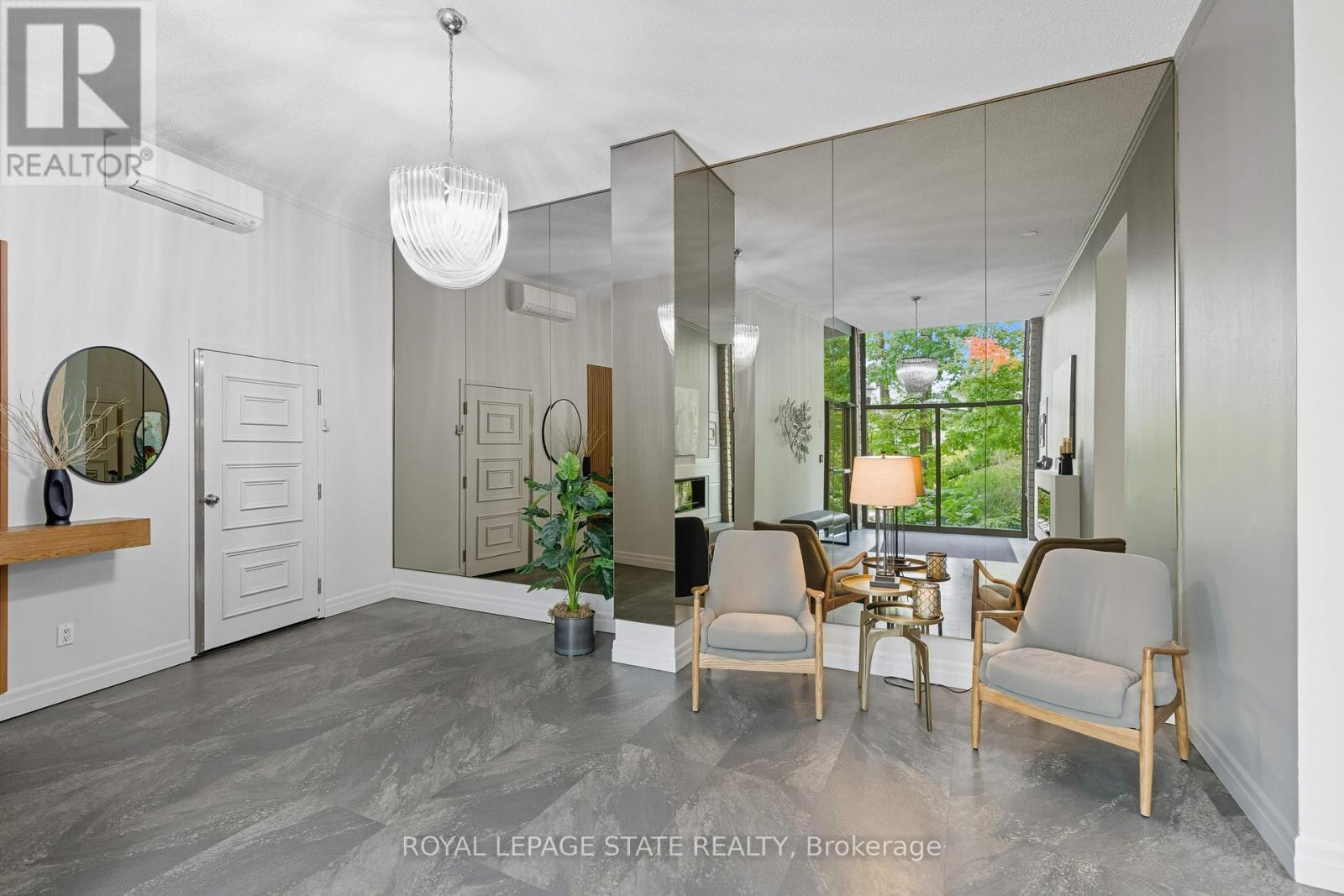 Welcome to The Highlands by the Park; 20 Berkley Road. Nestled atop a hill at the end of a quiet cul-de-sac in historic West Galt, this prestigious condominium offers tranquility, privacy, and sweeping views of nature and the city skyline. Overlooking a majestic woodlot, Victoria Park, and beyond, this building is one of Cambridge's hidden gems. This spacious 2,418 square foot, carpet-free unit offers a rare combination of size, layout, and natural light. With 3 generously sized bedrooms, 2 full bathrooms, and a thoughtfully designed floor plan, it's ideal for those seeking a blend of comfort and functionality. Step into an impressive foyer with mirrored walls and a large closet before entering the bright eat-in kitchen, complete with ceramic tile, crisp white cabinetry, built-in range top, track lighting and a cozy breakfast nook that looks out over lush greenery. The kitchen opens into a formal dining room with laminate flooring and elegant wall sconces; perfect for entertaining. The adjacent oversized living room features a wood-burning fireplace (sold in as-is condition) and leads to a bright all-season solarium with floor-to-ceiling windows, perfect as a den, office, or creative space. Down the hallway, you'll find three spacious bedrooms, including a large primary suite with two large windows, an expansive walk-in closet, and a 5-piece ensuite. A second 4-piece guest bath serves the remaining bedrooms. The in-suite laundry closet is conveniently tucked away off the main hallway. Building amenities include a rooftop terrace with panoramic views, ample seating, and barbecue, a party room with full kitchen and lounge area, meeting room, exercise room, and beautifully maintained common spaces. This unit includes one underground parking spot with a tandem storage locker. Don't miss this rare opportunity to live in a peaceful, elevated community surrounded by nature, just minutes from the charm and culture of West Galt. (id:4555)
