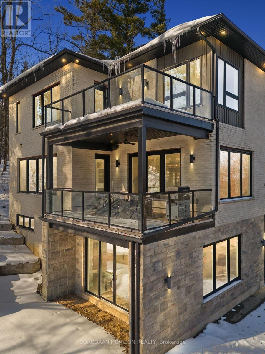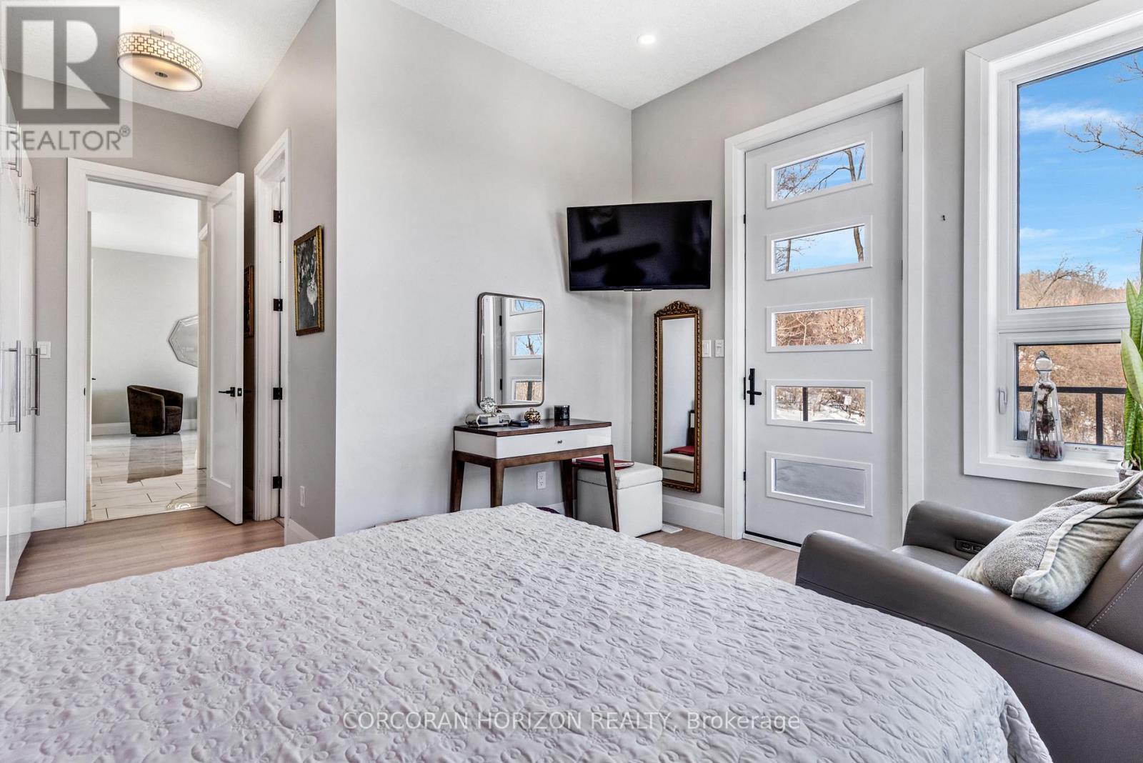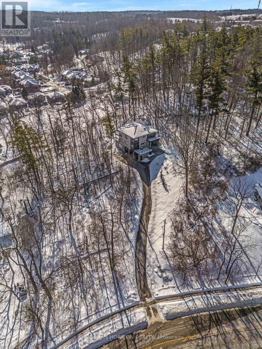 Welcome to 111 Grand Ridge Drive, an extraordinary 4,600 sq ft estate residence set on 3 acres of protected Carolinian forest, offering a rare combination of refined design and natural seclusion just minutes from the downtown core and highway access. This south-facing home is filled with natural light and elevated by 10-foot ceilings on every level, a fully carpet-free interior, and a private elevator providing effortless access throughout. The main level presents an elegant open concept layout designed for both grand entertaining and comfortable daily living. The chef inspired kitchen is a true focal point, featuring a striking granite waterfall island sourced via Latia Brazil, quartz surfaces, premium appliances, an expansive servery, and a generous butler's pantry. A private main floor bedroom with its own ensuite offers ideal accommodations for guests or extended family. Two large decks extend the principal living areas outdoors, creating a seamless connection to the surrounding forest. Upstairs, four spacious bedrooms include a luxurious primary retreat complete with European windows, a substantial walk-in closet, a spa-like ensuite bath, and a private deck overlooking the treed landscape. The fully finished walk-out lower level adds exceptional versatility with an additional bedroom, full bath, and recreation space anchored by an impressive 12-foot sliding door leading to the landscaped grounds. Constructed with attention to quality and performance, this home features full spray foam insulation, 400 amp service with generator rough-in, an owned hot water heater with recirculating pump, owned soft water system, interior sprinkler system, hard-wired interior and exterior speaker system, and soffit lighting on a timer. The approximately 1,000 sq ft triple car garage offers oversized 10 ft wide by 9 ft high doors, EV rough-in, and Wi-Fi enabled openers, ideal for collectors or hobby enthusiasts. (id:4555)