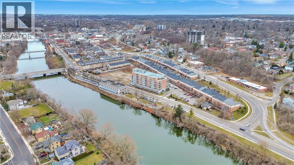 Exceptional Condo in Stunning, Historic Downtown Galt Seize the opportunity to own a pristine, move-in ready condo overlooking the picturesque historic downtown Galt. Built in 2016, the prestigious Riverfront Condos are renowned for their superior design and quality craftsmanship. This solid concrete mid-rise, featuring a striking brick and stone exterior, stands seven stories tall and offers something for everyone. Unit 503 boasts a spacious, open-concept floor plan with 2 bedrooms and 2 full bathrooms—highlighted by a luxurious walk-in closet and ensuite in the primary bedroom. The upgraded kitchen shines with elegant countertops and black appliances, perfect for both everyday living and entertaining. With just under 900 square feet of thoughtfully designed interior space, step out onto your private balcony to savour breathtaking sunrises and western views of the Grand River from the shared rooftop patio and charming downtown Galt. Convenience is key — this unit includes one owned parking spot along with ample visitor parking. Enjoy being just minutes from all your favourite amenities: the vibrant new Gaslight District, upscale coffee shops, fine dining, scenic hiking trails, water activities, boutique shopping, theatres, and bustling local markets. Galt is a community that beautifully blends its historic charm with a modern, forward-thinking spirit. Exciting developments are underway, including the upcoming second phase of the Light Rail Transit connecting Galt to KW, as well as new condos and the entertaining gaslight district just steps away, expanding residential and commercial spaces along the Grand River. With quick access to Highway 401 (just 15 minutes away) and Highway 8 towards Hamilton, this location offers incredible connectivity without sacrificing tranquility. Discover why Galt Cambridge is quickly becoming one of the most sought-after places to live — embrace this exceptional lifestyle today! (id:4555)