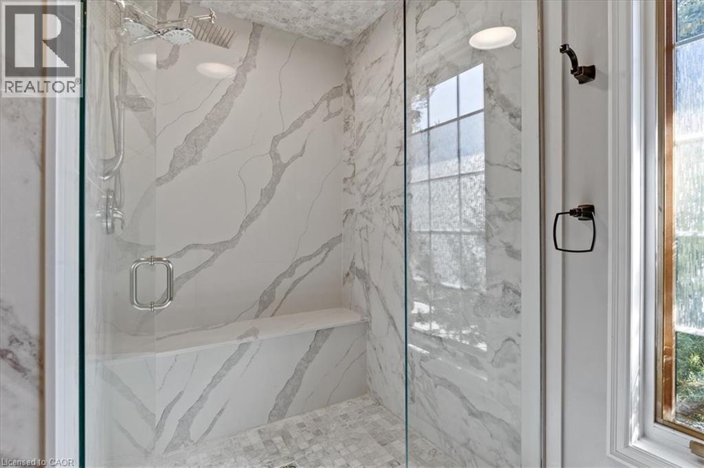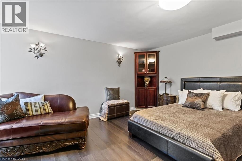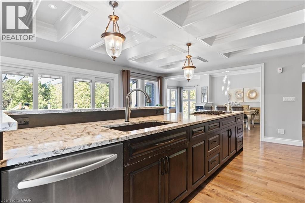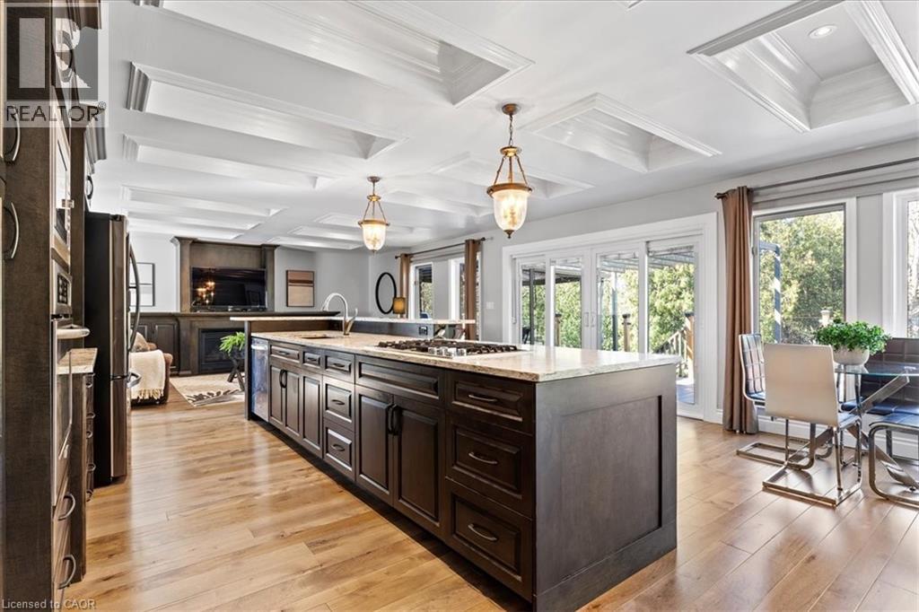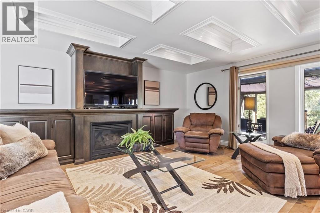 RARE OPPORTUNITY! Custom built raised bungalow on a 1.04-acre lot, offering court location surrounded by protected greenspace. This exclusive, 10 estate court rarely has homes come up for sale and 20 Grandy lane is one that takes full advantage of the natural features, completely backing onto mature forest with direct access to Millcreek conservation land. The home features a stunning all stone exterior with a beautiful retaining wall and carefully set natural stone steps, leading to the front door. The main level layout is wide open with large windows, designed to overlook the backyard from anywhere within the open space and providing access to the elevated multi-level deck completed with composite decking and glass rails. A rich, maple raised panel kitchen sits central with an oversized quartz countertop and raised bar sitting area; elegant crown molding finishes the cabinets to the ceiling with built-in stainless-steel appliances, gas cooktop. Equal in elegance is the built-in family room wall unit featuring gas fireplace insert. A three-sided fireplace separates the dining room from a sunken sitting area providing for an elevated view of the backyard; coffered ceiling accents and hardwood flooring span the space. Completing the space is a large bedroom, laundry, 2-piece bathroom, and the primary suite, complete with walk in closet and recently renovated(2023) 5-piece spa like ensuite. A hardwood staircase leads to the lower level which is still completely above grade; the home was strategically placed to take full advantage of the walkout. Lower level gives access to the oversized, staggered double car garage. Perfectly suited as a multi-generational home, offering three bedrooms, a recently renovated (2023) 4-piece bathroom, recreation room with gas fireplace, and kitchenette along with wet bar. Roof(2024), Additional oversized garden shed for equipment storage. Minutes from the 401, amenities, and schools. Don’t miss this truly beautiful property! (id:4555)