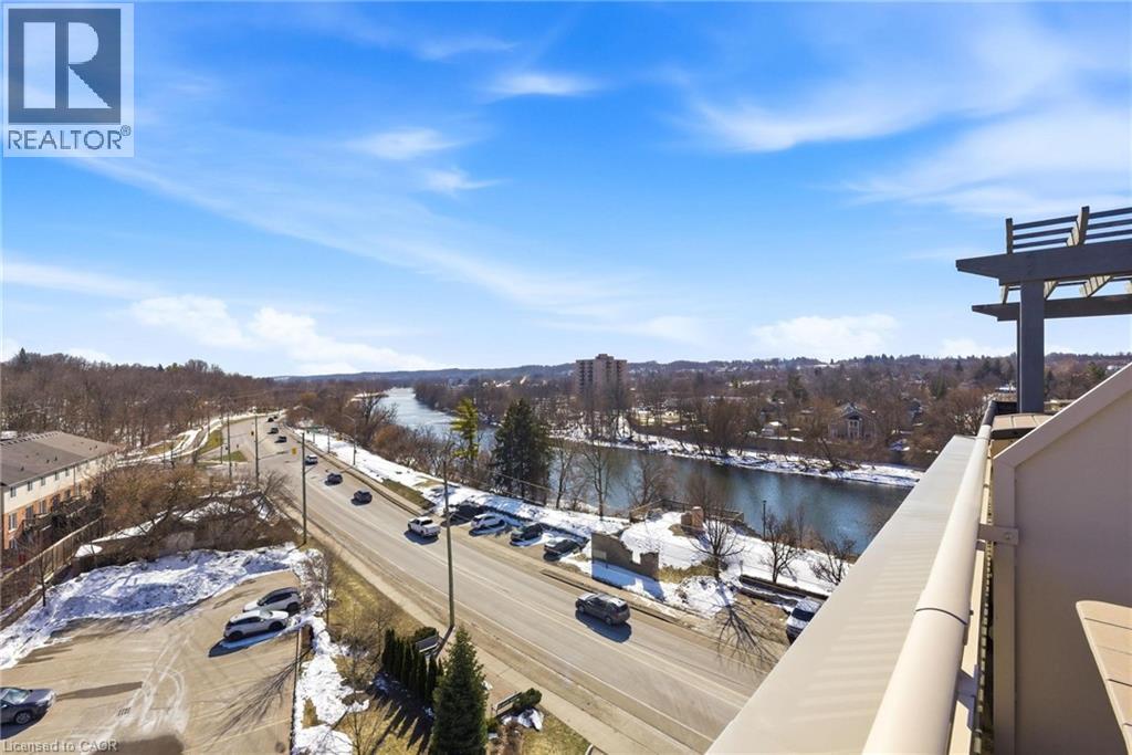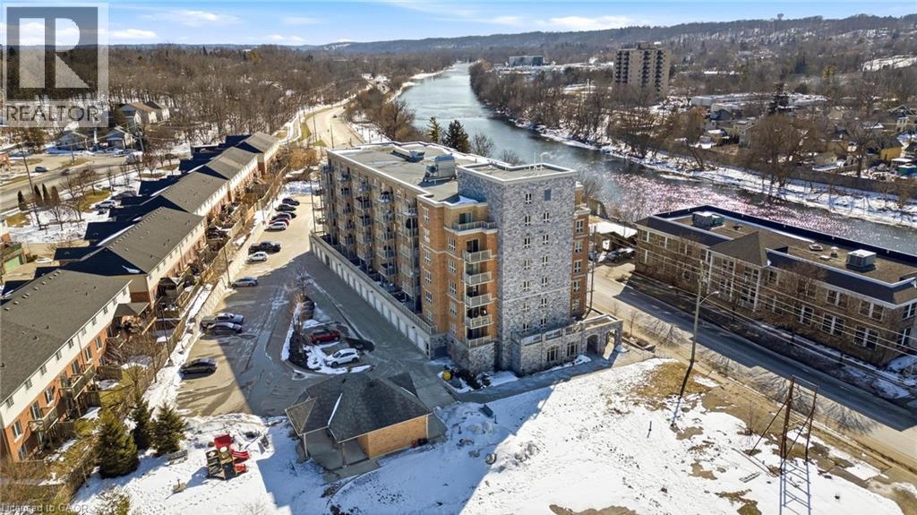 Welcome to RiverFront Condominiums, ideally located along the Grand River and steps from scenic walking trails while remaining close to historic downtown Galt, amenities, shopping, dining, and transit. This bright and functional one-bedroom suite offers an open-concept kitchen and living area with modern flooring throughout. The kitchen features ample cabinetry, full-sized appliances, and a movable central island for additional prep space and seating. The living area provides access to a private balcony, perfect for morning coffee or evening relaxation. The spacious bedroom includes double closets and large windows for natural light. The four-piece bathroom is well maintained with a full tub and shower combination. Additional features include in-suite laundry with a newer washer and dryer (2024). Building amenities include bike storage, a rooftop patio with south-facing river views and a BBQ area, and a playground for children. This suite is an excellent opportunity for first-time buyers, professionals, downsizers, or investors seeking a low-maintenance property alongside the Grand River. (id:4555)