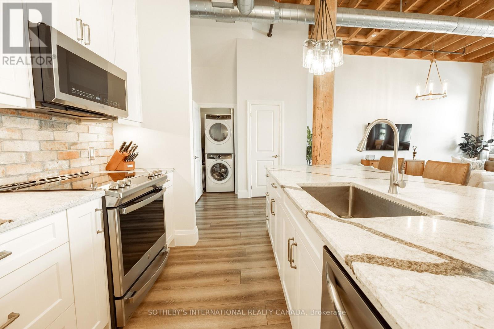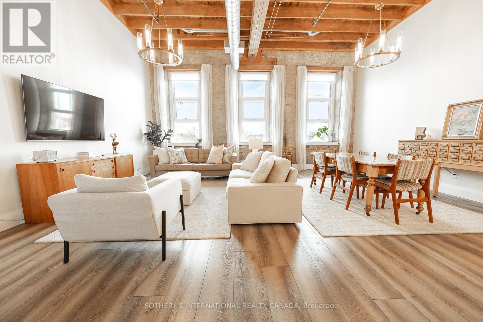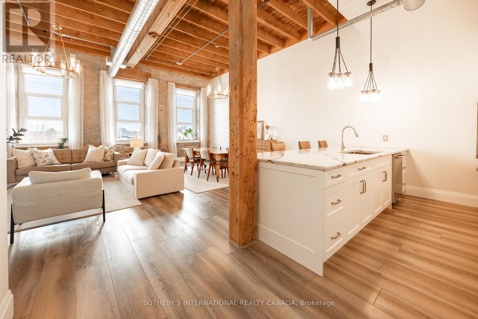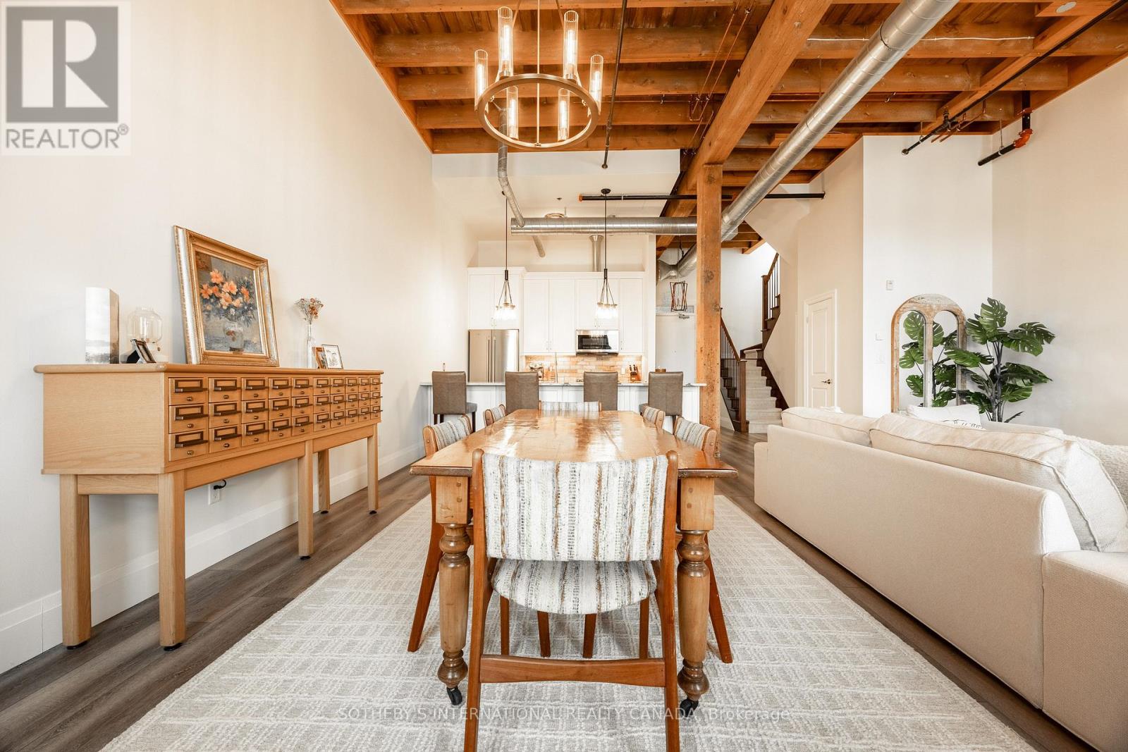 Welcome to 25 Concession Street, Suite 215 in historic Galt of Cambridge. This stunning 1,599 sq. ft. two storey penthouse suite features beautiful large windows, high ceilings, original wood beams, stone walls and exceptional views of the downtown core and riverfront. The open concept main level creates a grand space for the kitchen, dining and living room- perfect entertaining and hosting areas to enjoy with family and friends. The kitchen features Quartz counters, loads of cabinetry for storage and a walk-in pantry. You will also find a two piece powder room and in-suite laundry for your added convenience. The upper level boasts a spacious primary bedroom with extra space for a reading nook and a walk-in closet. Find a secondary bedroom, a full four piece bathroom and den that could work well for an office space or additional living area to complete this floor. This suite offers two side-by-side outdoor parking spaces for you to park your vehicles and walk downtown to the Gaslight District, the Grand River Pedestrian Bridge, and Hamilton Family Theatre, along with the farmers market and charming restaurants and boutiques. Picture perfect views from all rooms, loads of natural light, within a highly desirable location, this suite is completely move-in ready for those who love nearby city amenities. (id:4555)