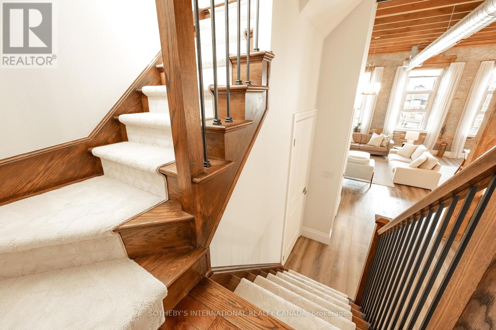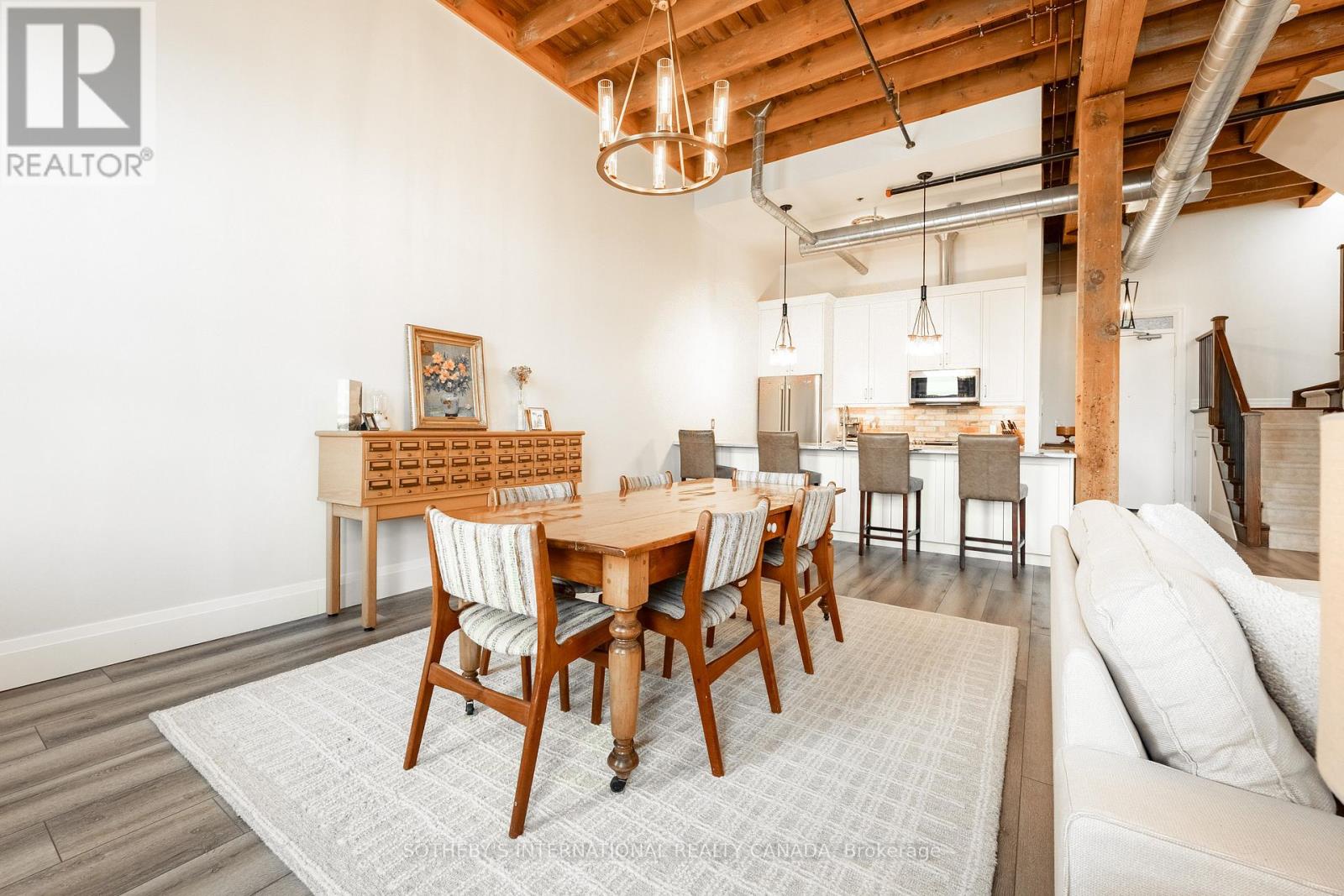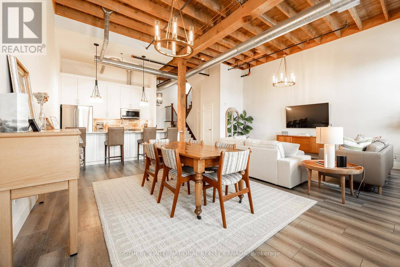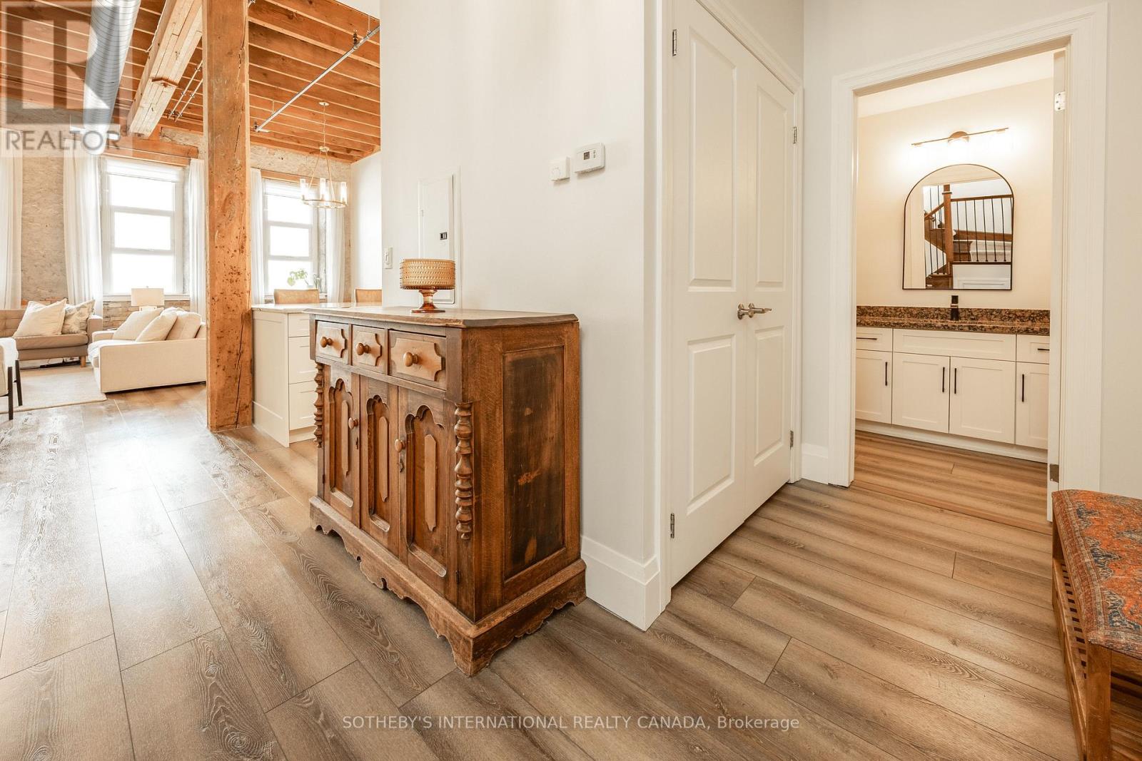 Welcome to 25 Concession Street, Suite 215 in historic Galt of Cambridge. This stunning 1,599 sq. ft. two storey penthouse suite features beautiful large windows, high ceilings, original wood beams, stone walls and exceptional views of the downtown core and riverfront. The open concept main level creates a grand space for the kitchen, dining and living room- perfect entertaining and hosting areas to enjoy with family and friends. The kitchen features Quartz counters, loads of cabinetry for storage and a walk-in pantry. You will also find a two piece powder room and in-suite laundry for your added convenience. The upper level boasts a spacious primary bedroom with extra space for a reading nook and a walk-in closet. Find a secondary bedroom, a full four piece bathroom and den that could work well for an office space or additional living area to complete this floor. This suite offers two side-by-side outdoor parking spaces for you to park your vehicles and walk downtown to the Gaslight District, the Grand River Pedestrian Bridge, and Hamilton Family Theatre, along with the farmers market and charming restaurants and boutiques. Picture perfect views from all rooms, loads of natural light, within a highly desirable location, this suite is completely move-in ready for those who love nearby city amenities. (id:4555)