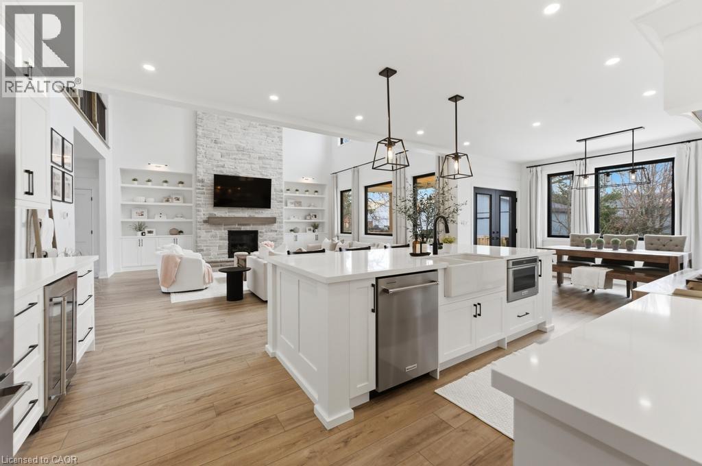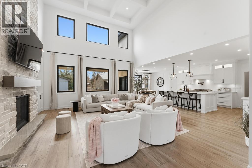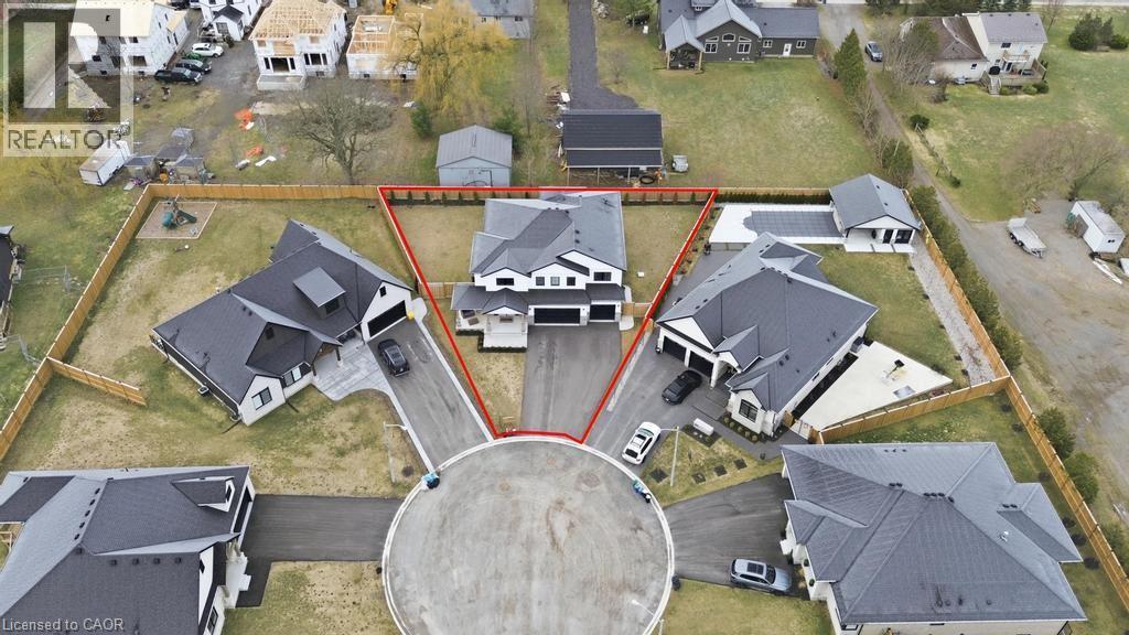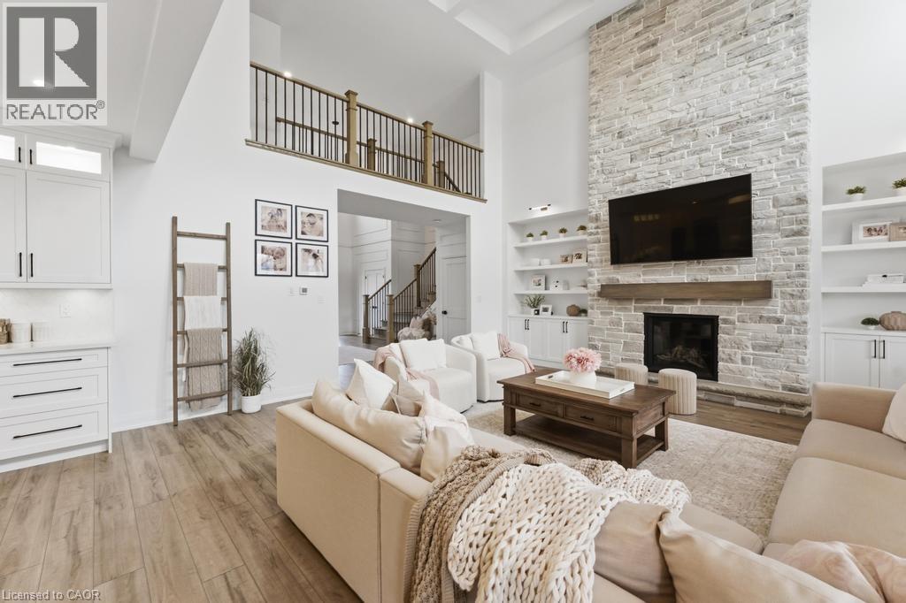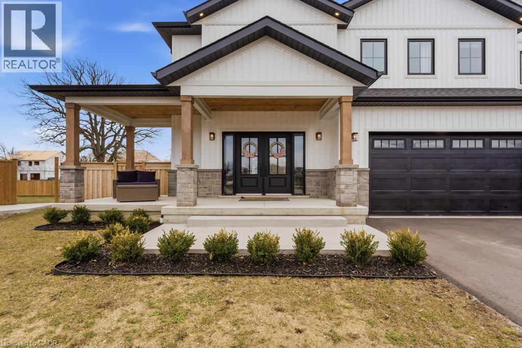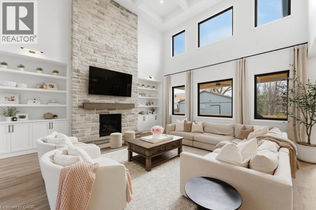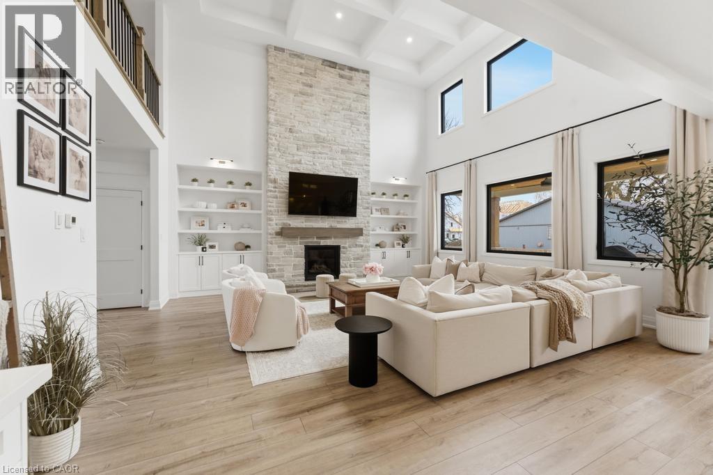 Welcome to this exceptional modern farmhouse masterpiece nestled on a quiet cul-de-sac in one of Campden Estates’ most desirable communities. Thoughtfully designed with luxury finishes and timeless architectural details, this stunning home offers the perfect blend of elegance, comfort, and everyday functionality. Step inside to an impressive open-concept layout where natural light pours through expansive windows, highlighting coffered ceilings, custom millwork, and a soaring stone fireplace that anchors the main living space. The designer kitchen is truly the heart of the home, featuring a large centre island, sleek appliances, walk-in pantry, and abundant cabinetry—ideal for both entertaining and busy family living. The seamless flow into the dining area creates the perfect setting for gatherings, with direct access to the outdoor patio for effortless indoor-outdoor living. Upstairs, a striking catwalk overlooks the main level and leads to spacious bedrooms, each complete with built-in closets. The primary retreat feels like a private escape, featuring French door entry, a spa-inspired ensuite, and generous walk-in closet space designed for comfort and relaxation. Convenient upper-level laundry with additional storage and utility sink adds everyday practicality. Outside, the beautifully landscaped yard offers multiple spaces to relax or entertain—from lively gatherings on the finished patio to peaceful evenings in a private setting. A triple garage and ample parking complete this impressive property. Offering over 3,000 sq ft of thoughtfully crafted living space with luxury finishes throughout, this home delivers refined living in a family-friendly neighbourhood just minutes from local amenities, wineries, and scenic Niagara countryside. Experience the perfect balance of modern design and timeless charm welcome home. (id:4555)