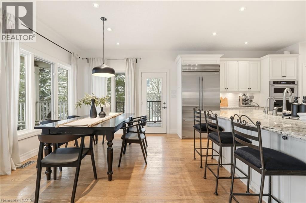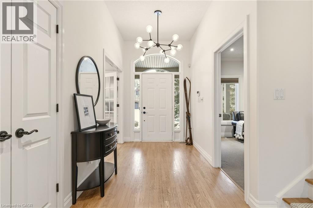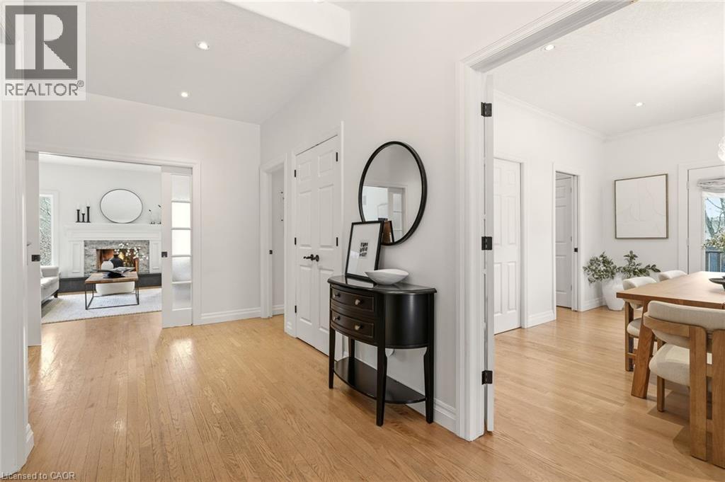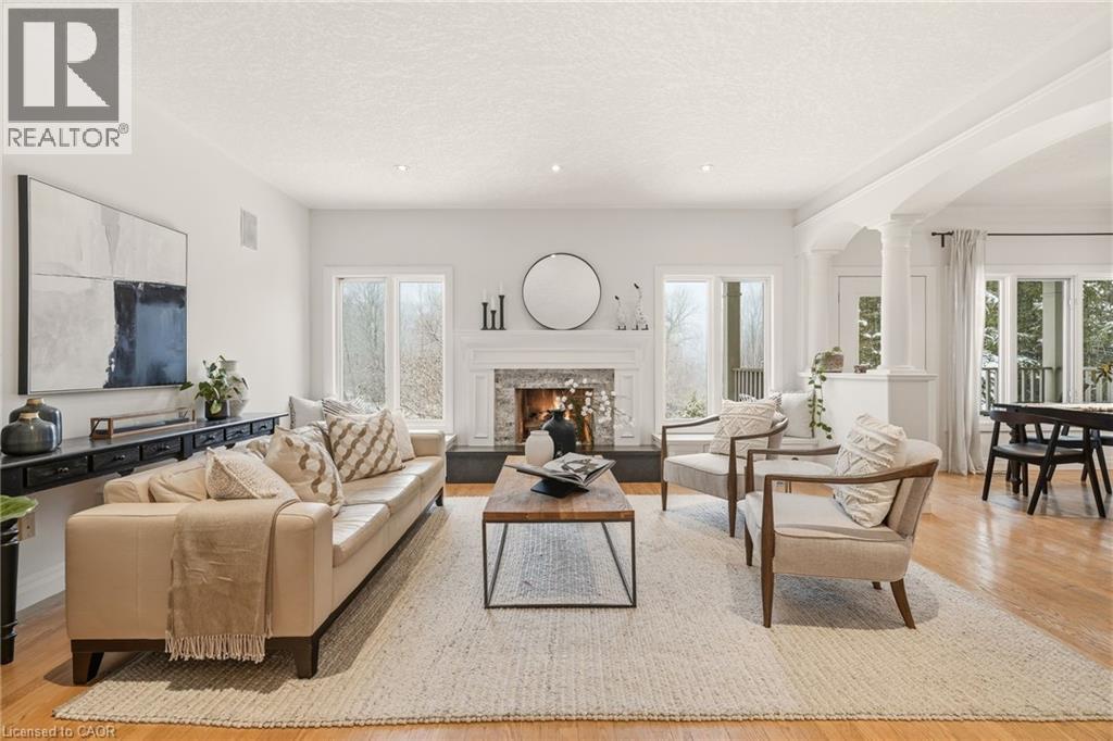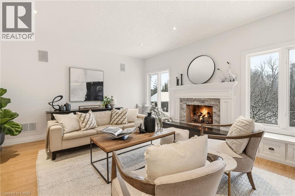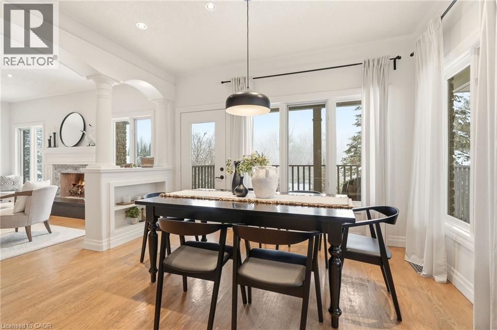 Stately bungaloft located at the end of a quiet cul-de-sac in sought-after Palomino Estates. This well-designed home offers a main-floor primary suite, a bright family room with a fireplace, and a kitchen and dining area overlooking the wrap-around porch and private natural surroundings. Large windows throughout provide excellent light and views of the property. The full walkout lower level adds valuable living space with a self-contained nanny/in-law suite, an additional bedroom, a full bathroom, and a dedicated theatre room. Ideal for multi-generational living or extended stays. The backyard is a standout feature, designed for both relaxation and entertaining. Enjoy a saltwater pool, hot tub, covered pavilion with a gas fireplace and TV, outdoor kitchen, fire pit area, and generous green space. Backing onto conservation land, the setting offers exceptional privacy and a peaceful connection to nature. Located minutes from Waterdown, Burlington, schools, golf courses, hiking trails, Glen Eden, and major highways. A rare opportunity to enjoy country living with convenient access to nearby amenities and recreation. Let's get you home! (id:4555)