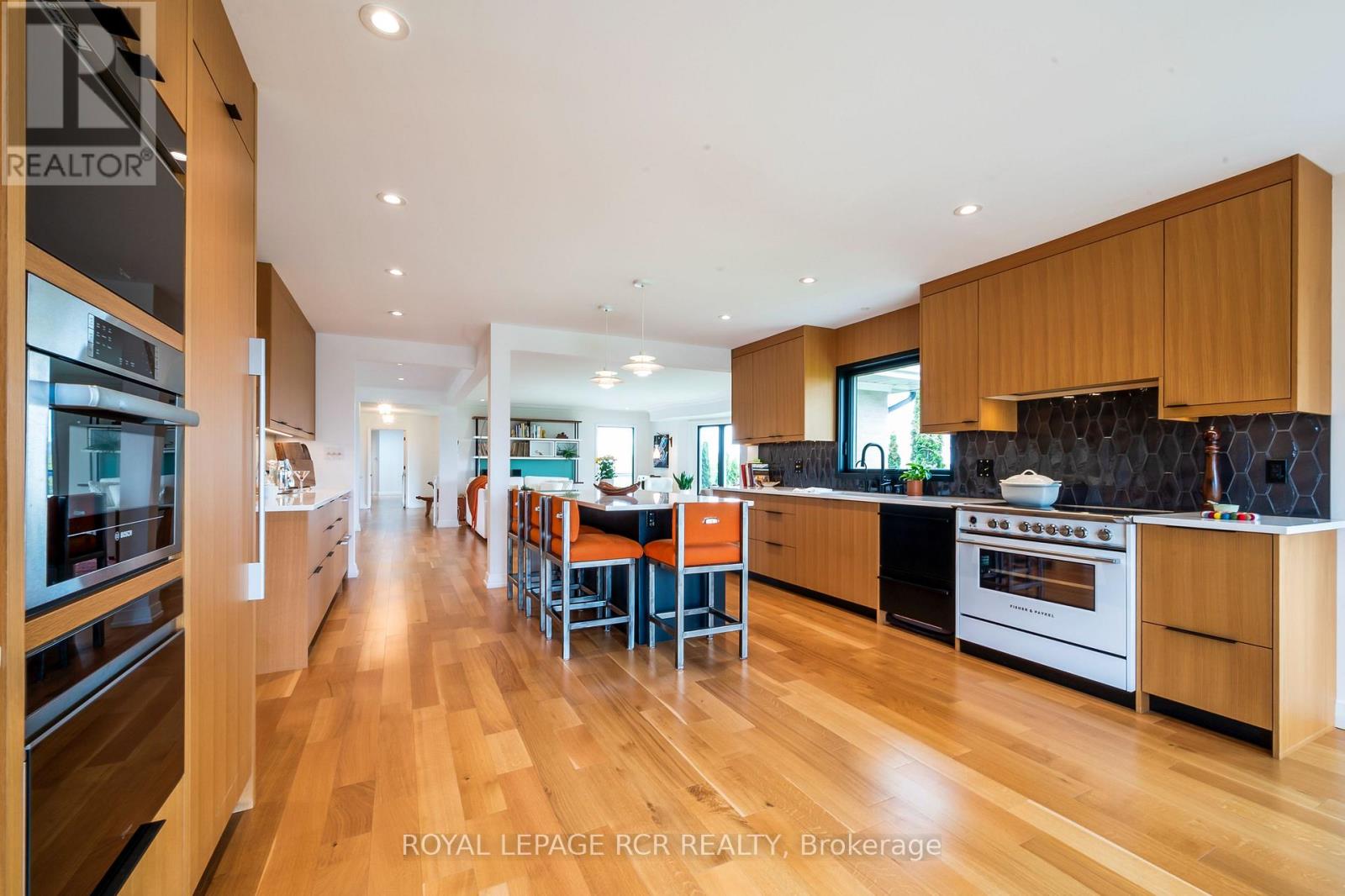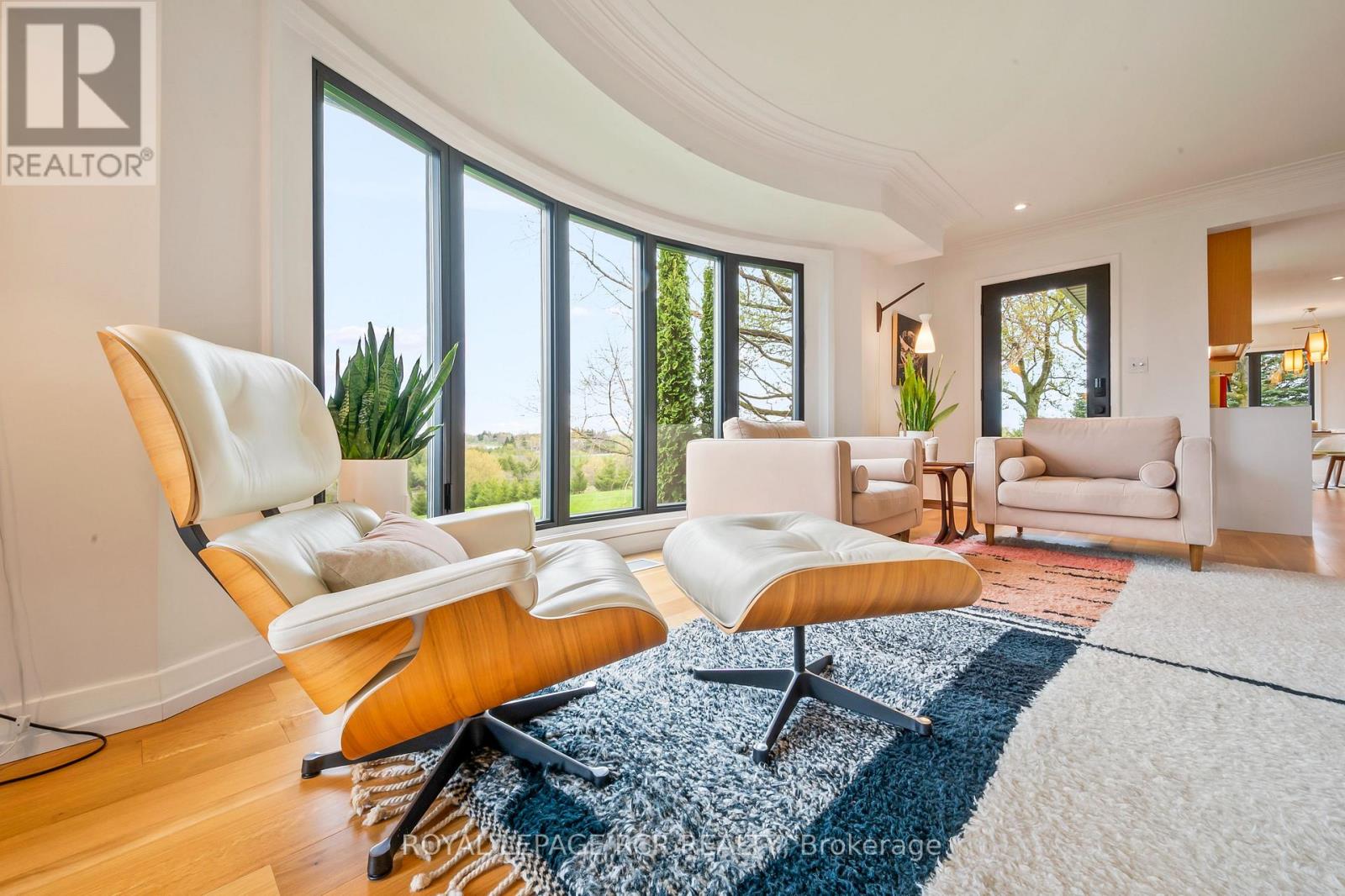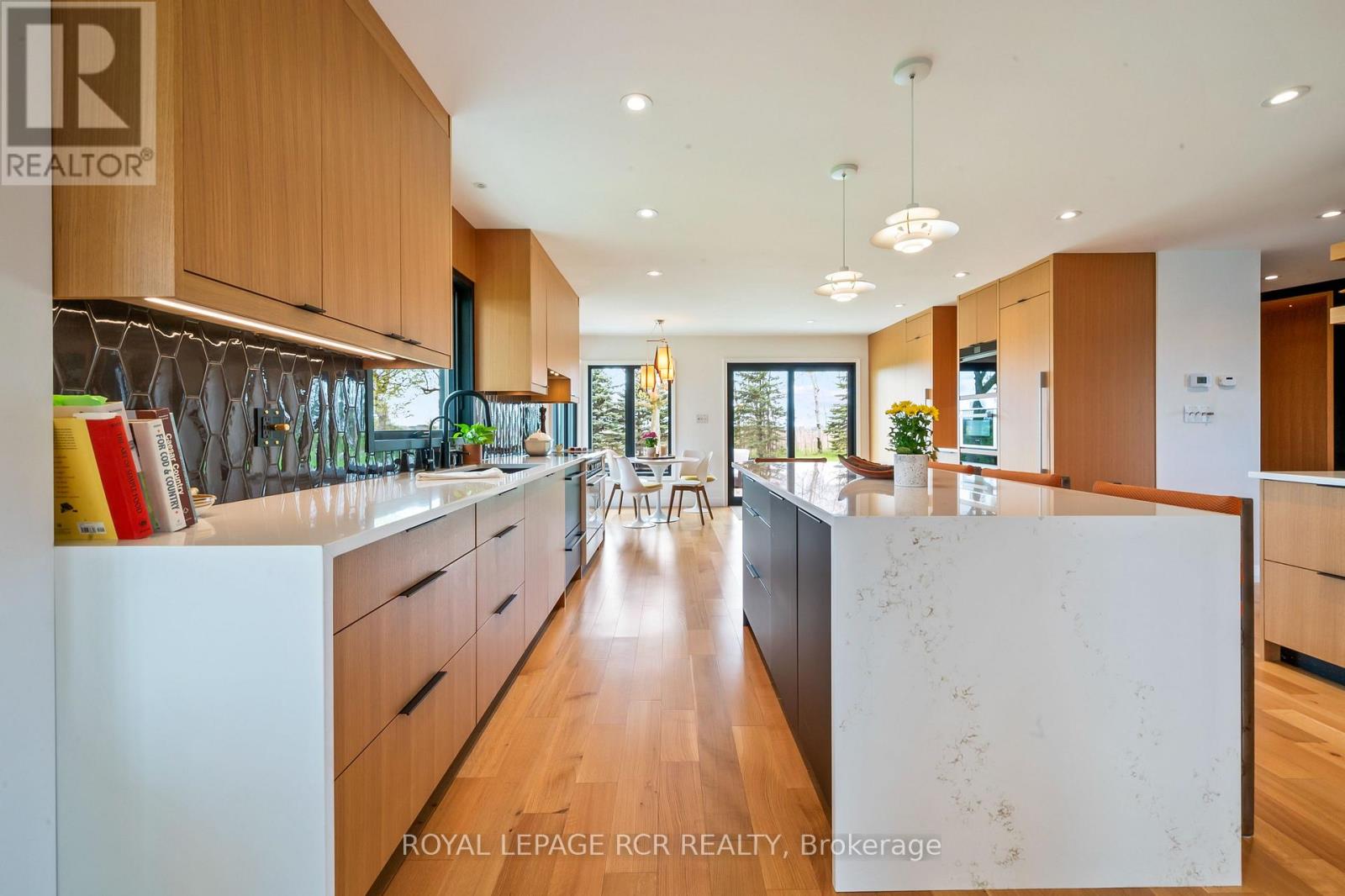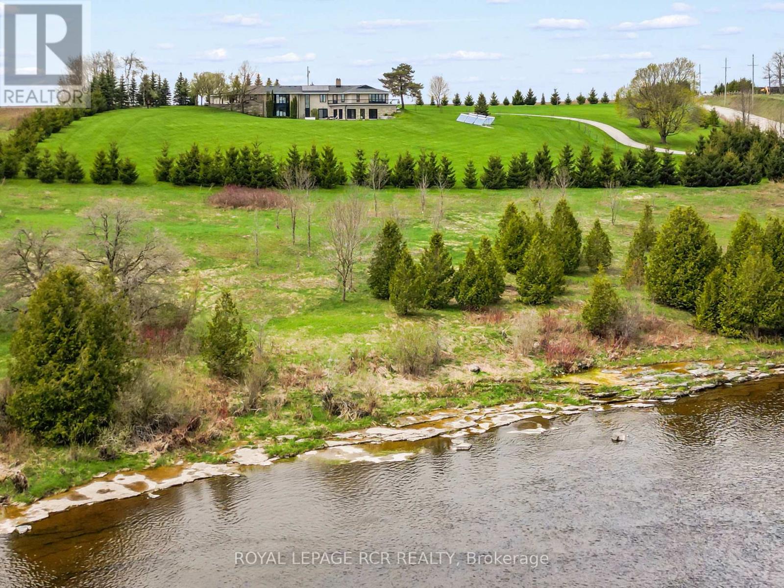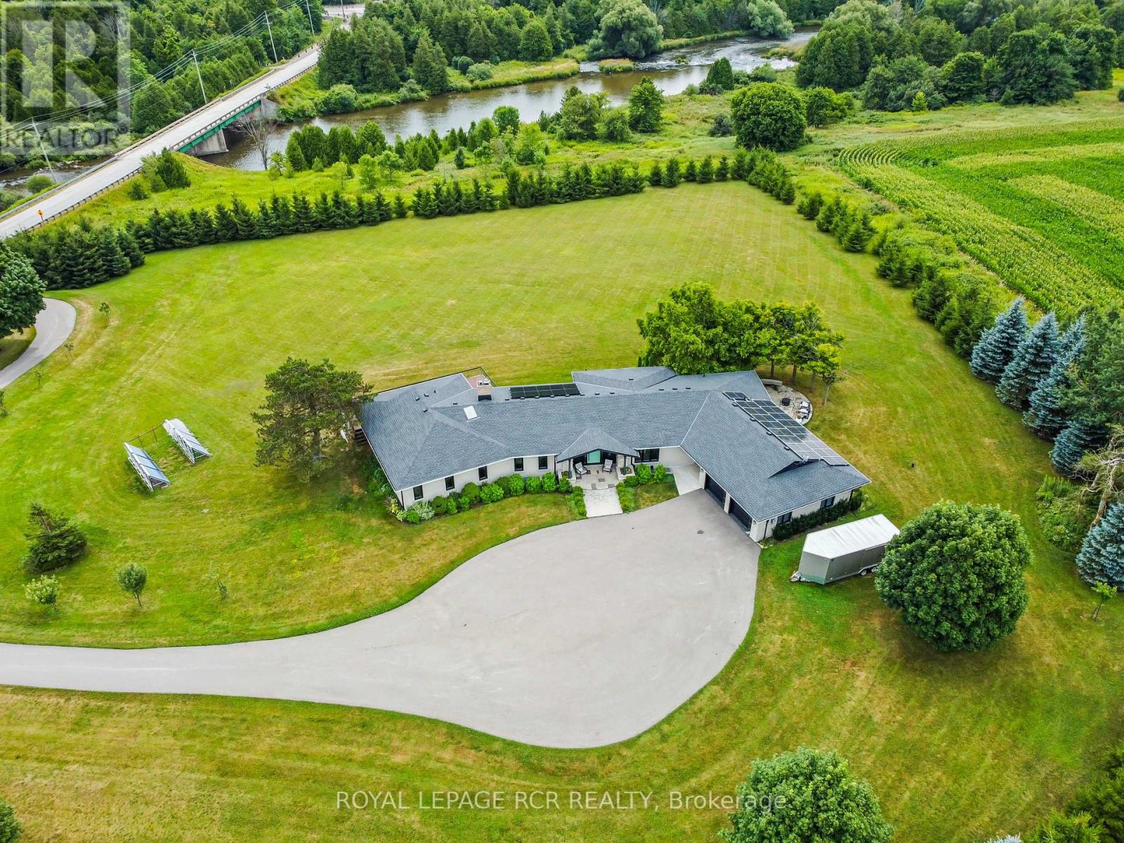 A winding driveway draws you toward The Riverlands, a spectacular top-of-the-line modern estate offering over 7,000 sq ft of total space. Nestled on 3.67 acres with commanding views of the Grand River, this architectural gem underwent an extraordinary full-scale renovation from '20 to '22. Today, it stands as a seamless fusion of timeless design and forward-thinking sustainability, boasting carbon- neutral, net-zero-ready systems. The main level features a stunning chef-inspired kitchen with quartz countertops, custom cabinetry, and an impressive suite of appliances. Sliding doors lead to a stone patio with a fireplace and BBQ, perfectly positioned to enjoy the sights and sounds of one of Ontario's premier fly fishing destinations. The open-concept living and dining area is enhanced by natural light, bespoke walnut built-ins, and sweeping river views. The primary suite is a private retreat, complete with a five-piece ensuite, custom dressing room with integrated laundry, and access to a versatile den or office with a wood-burning fireplace and access to the rooftop terrace. Two more bedrooms offer walk-in closets and share a beautifully updated bath. A curved staircase leads to the lower level featuring a second kitchen with an indoor charcoal grill, a family room with fireplace, a billiards room, a guest suite, a wine room, and a walk-in fridge. Thoughtfully designed to function seamlessly as a multi-generational home, this level offers independent yet connected living spaces ideal for extended family or guests. The showstopping indoor saltwater pool has dedicated HVAC and solar-powered heating, plus a sauna, change room, and adjoining sunroom with walkout to the backyard. Rooftop solar panels, geothermal systems, upgraded electrical, smart home features, and plans for a detached 3-car garage complete this one-of-a-kind package. Just minutes from Belwood Lake and downtown Elora, The Riverlands is a rare blend of modern luxury, natural beauty, and sustainable living (id:4555)