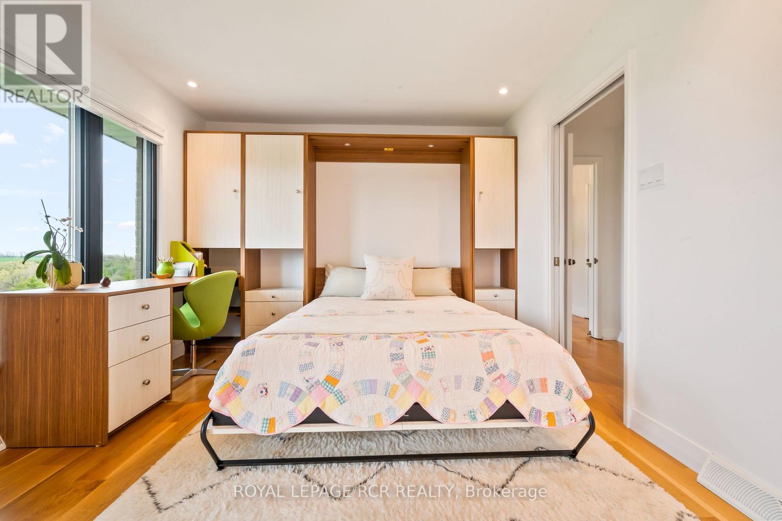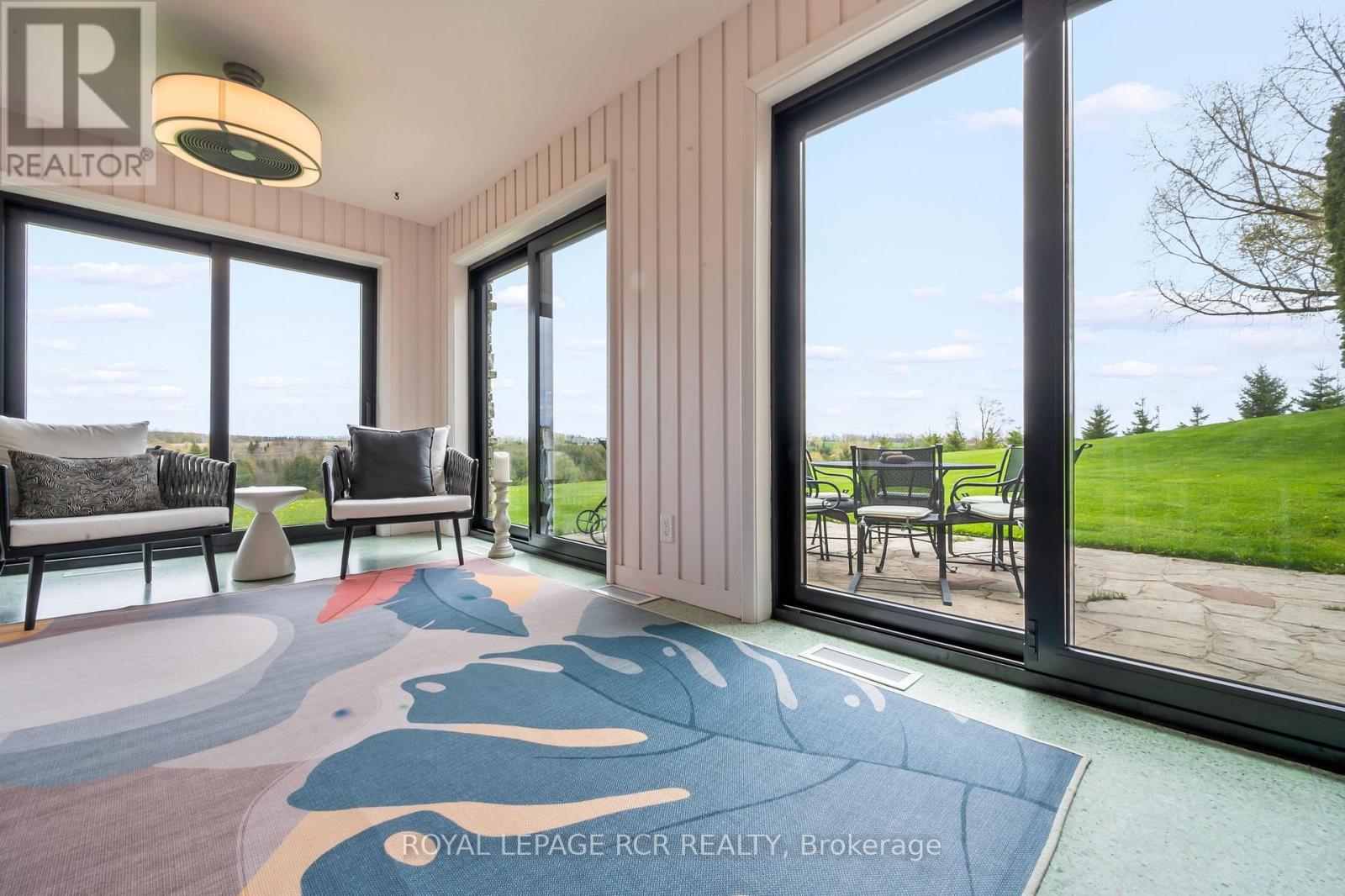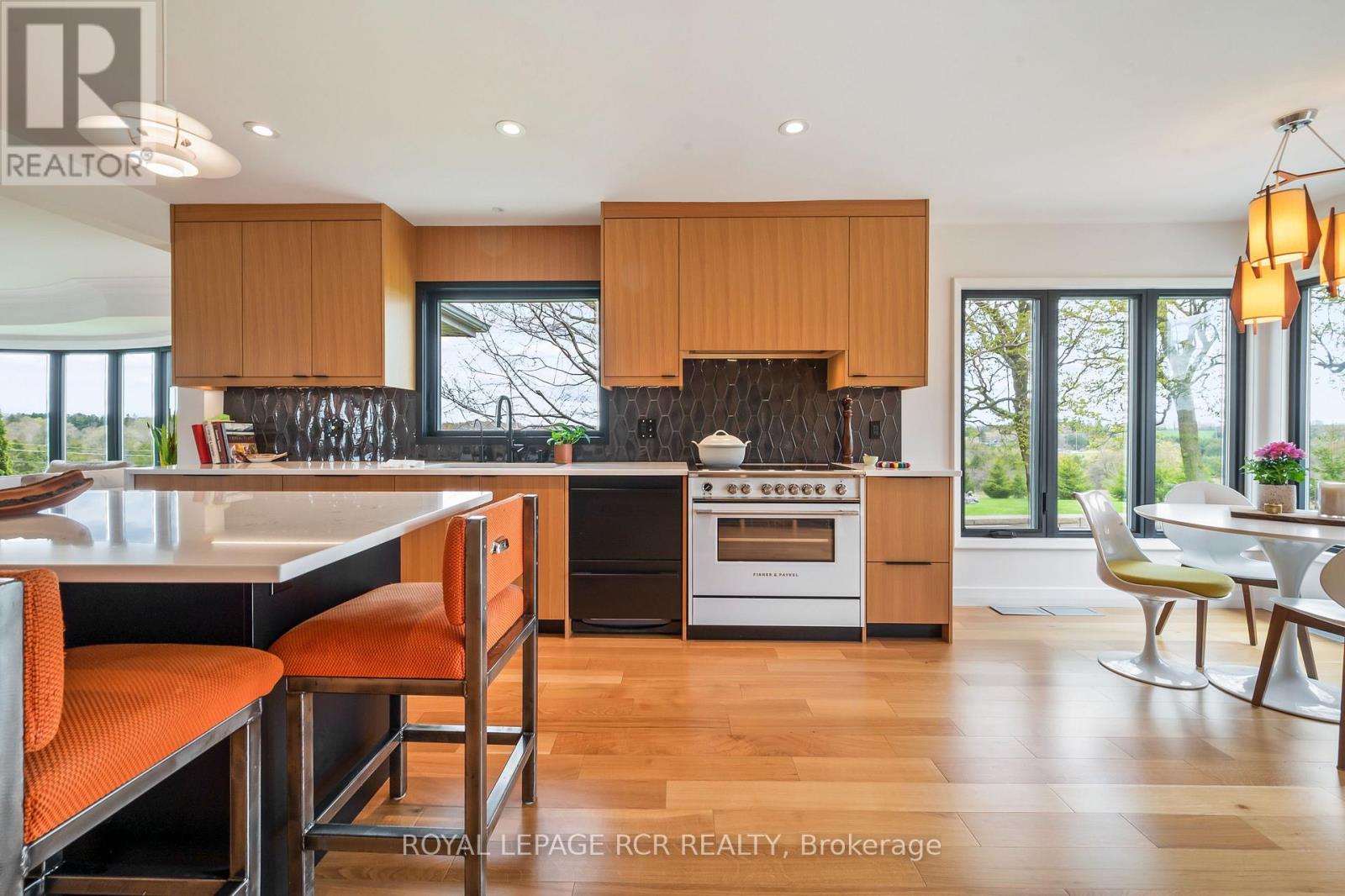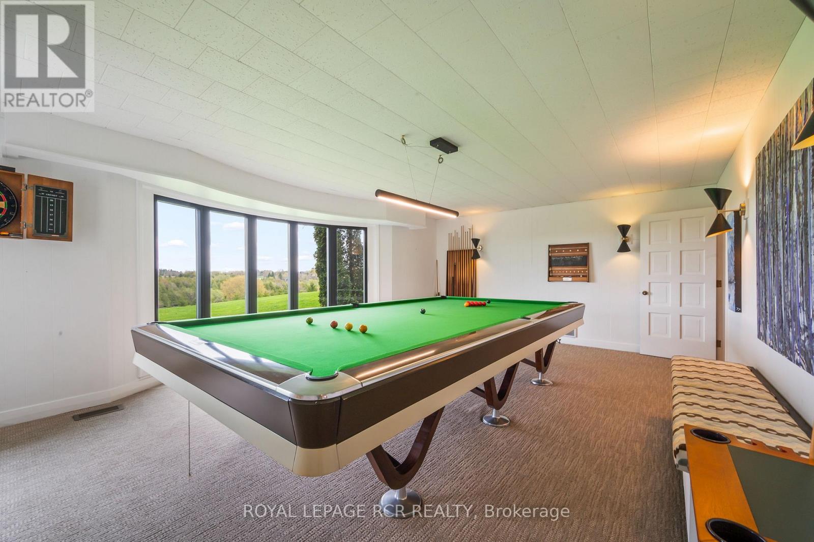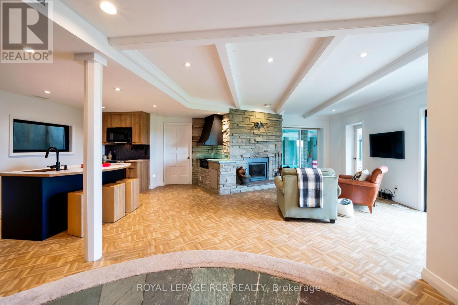 A winding driveway draws you toward The Riverlands, a spectacular top-of-the-line modern estate offering over 7,000 sq ft of total space. Nestled on 3.67 acres with commanding views of the Grand River, this architectural gem underwent an extraordinary full-scale renovation from '20 to '22. Today, it stands as a seamless fusion of timeless design and forward-thinking sustainability, boasting carbon- neutral, net-zero-ready systems. The main level features a stunning chef-inspired kitchen with quartz countertops, custom cabinetry, and an impressive suite of appliances. Sliding doors lead to a stone patio with a fireplace and BBQ, perfectly positioned to enjoy the sights and sounds of one of Ontario's premier fly fishing destinations. The open-concept living and dining area is enhanced by natural light, bespoke walnut built-ins, and sweeping river views. The primary suite is a private retreat, complete with a five-piece ensuite, custom dressing room with integrated laundry, and access to a versatile den or office with a wood-burning fireplace and access to the rooftop terrace. Two more bedrooms offer walk-in closets and share a beautifully updated bath. A curved staircase leads to the lower level featuring a second kitchen with an indoor charcoal grill, a family room with fireplace, a billiards room, a guest suite, a wine room, and a walk-in fridge. Thoughtfully designed to function seamlessly as a multi-generational home, this level offers independent yet connected living spaces ideal for extended family or guests. The showstopping indoor saltwater pool has dedicated HVAC and solar-powered heating, plus a sauna, change room, and adjoining sunroom with walkout to the backyard. Rooftop solar panels, geothermal systems, upgraded electrical, smart home features, and plans for a detached 3-car garage complete this one-of-a-kind package. Just minutes from Belwood Lake and downtown Elora, The Riverlands is a rare blend of modern luxury, natural beauty, and sustainable living (id:4555)