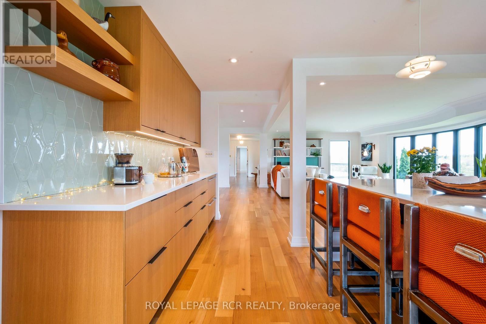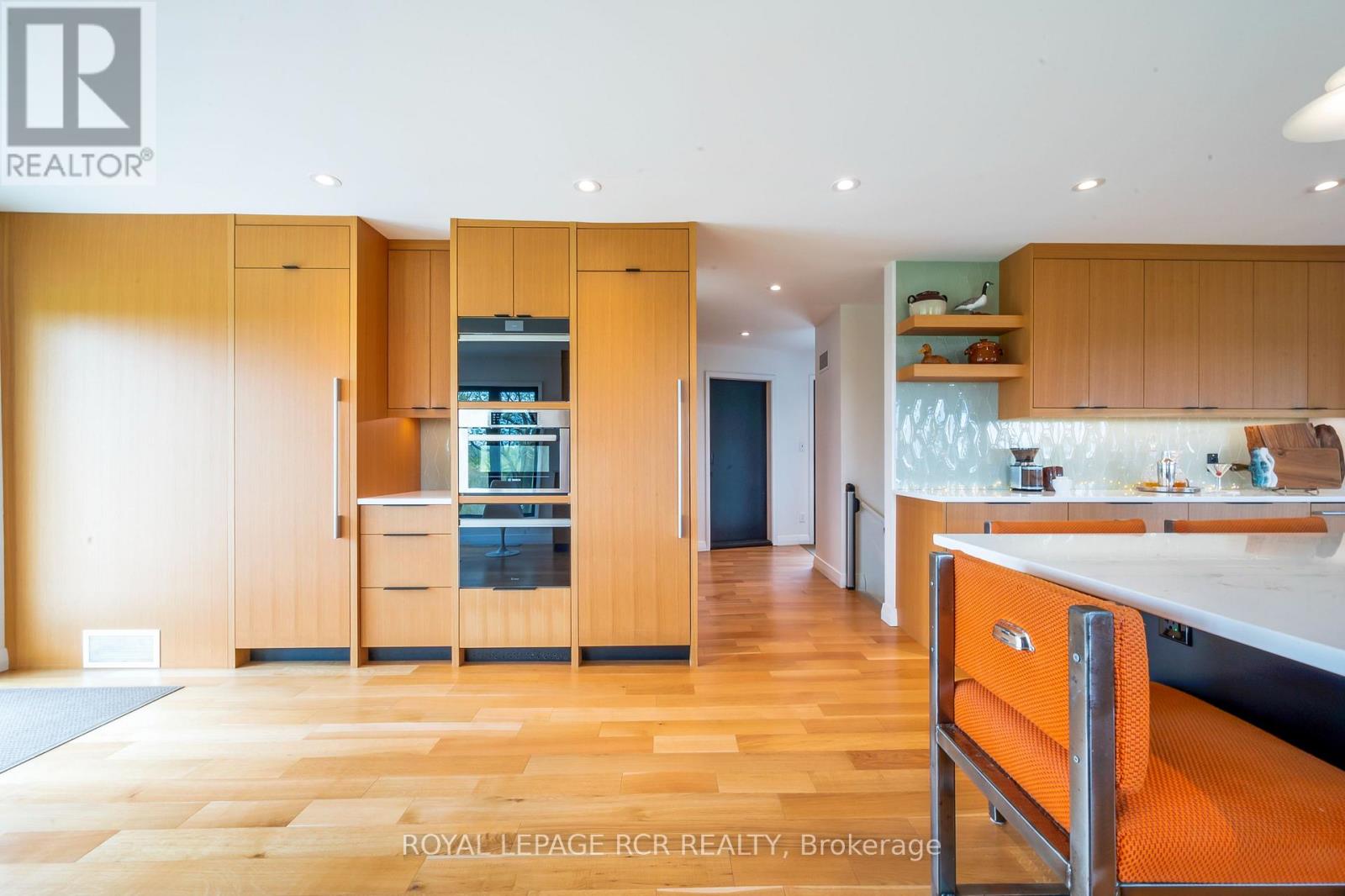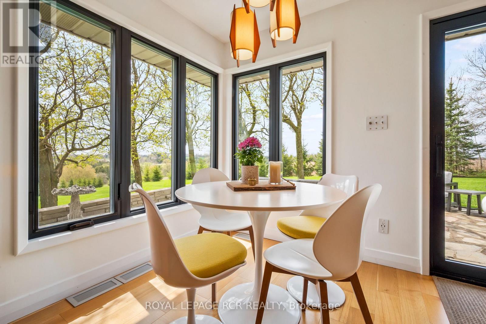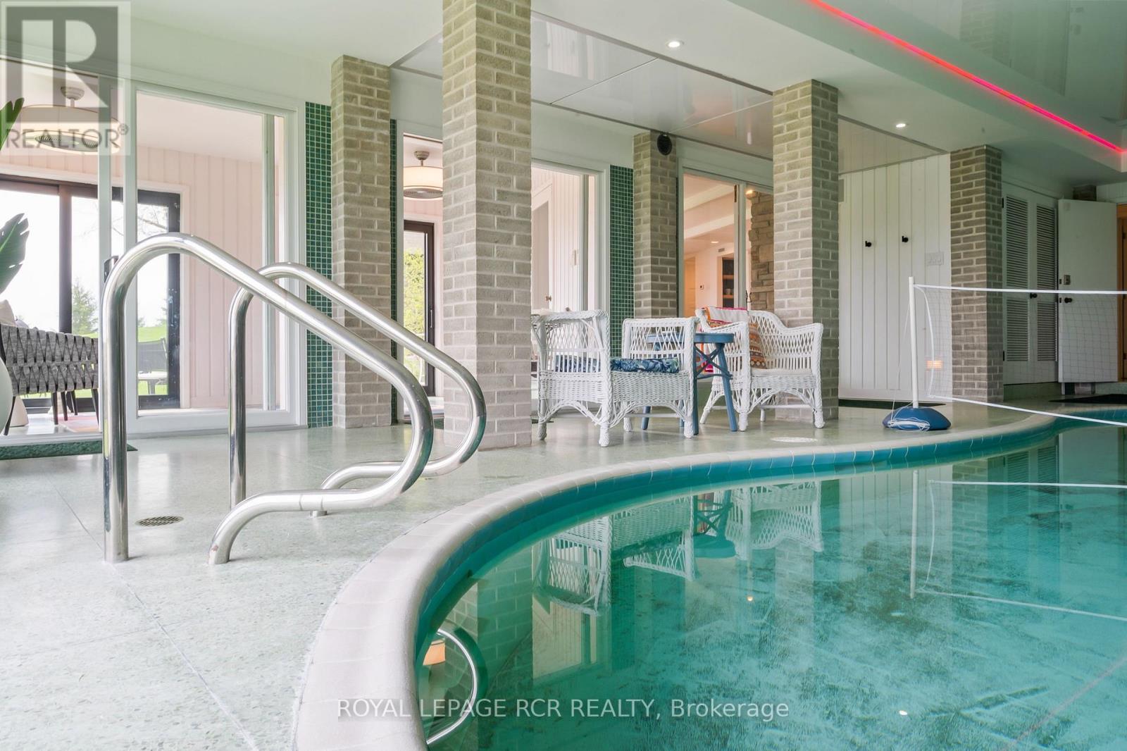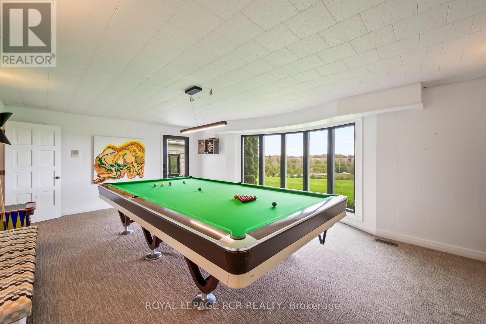 A winding driveway draws you toward The Riverlands, a spectacular top-of-the-line modern estate offering over 7,000 sq ft of total space. Nestled on 3.67 acres with commanding views of the Grand River, this architectural gem underwent an extraordinary full-scale renovation from '20 to '22. Today, it stands as a seamless fusion of timeless design and forward-thinking sustainability, boasting carbon- neutral, net-zero-ready systems. The main level features a stunning chef-inspired kitchen with quartz countertops, custom cabinetry, and an impressive suite of appliances. Sliding doors lead to a stone patio with a fireplace and BBQ, perfectly positioned to enjoy the sights and sounds of one of Ontario's premier fly fishing destinations. The open-concept living and dining area is enhanced by natural light, bespoke walnut built-ins, and sweeping river views. The primary suite is a private retreat, complete with a five-piece ensuite, custom dressing room with integrated laundry, and access to a versatile den or office with a wood-burning fireplace and access to the rooftop terrace. Two more bedrooms offer walk-in closets and share a beautifully updated bath. A curved staircase leads to the lower level featuring a second kitchen with an indoor charcoal grill, a family room with fireplace, a billiards room, a guest suite, a wine room, and a walk-in fridge. Thoughtfully designed to function seamlessly as a multi-generational home, this level offers independent yet connected living spaces ideal for extended family or guests. The showstopping indoor saltwater pool has dedicated HVAC and solar-powered heating, plus a sauna, change room, and adjoining sunroom with walkout to the backyard. Rooftop solar panels, geothermal systems, upgraded electrical, smart home features, and plans for a detached 3-car garage complete this one-of-a-kind package. Just minutes from Belwood Lake and downtown Elora, The Riverlands is a rare blend of modern luxury, natural beauty, and sustainable living (id:4555)