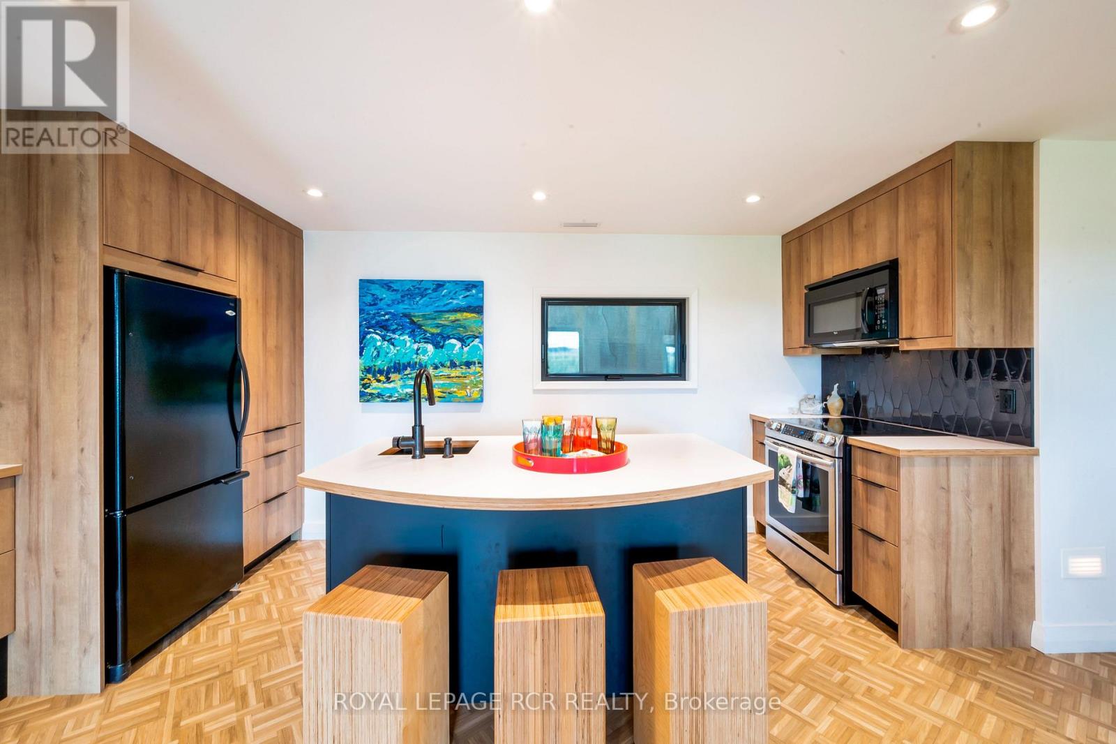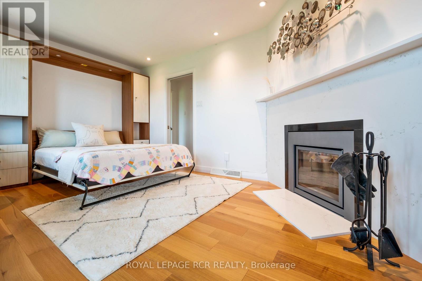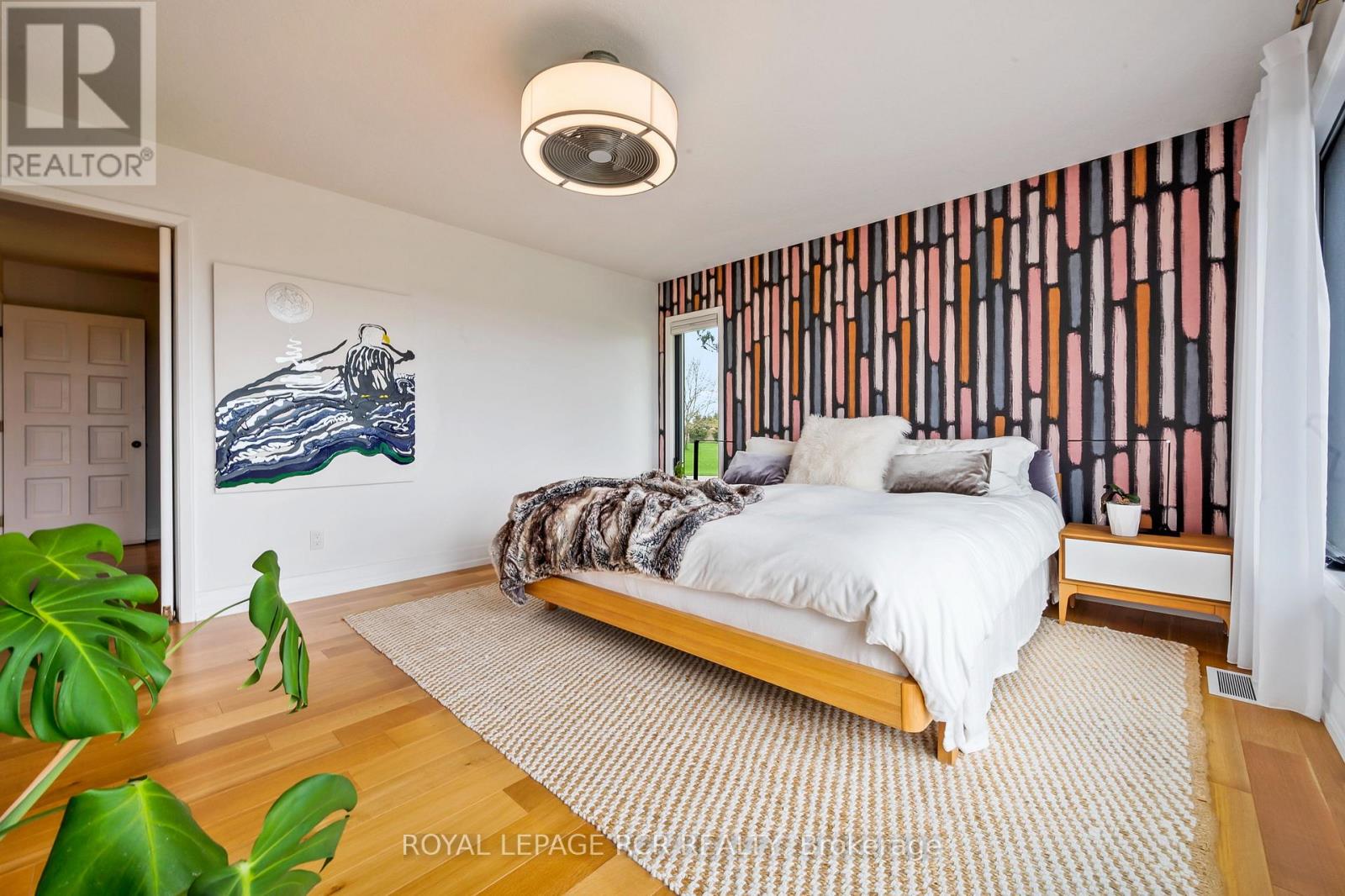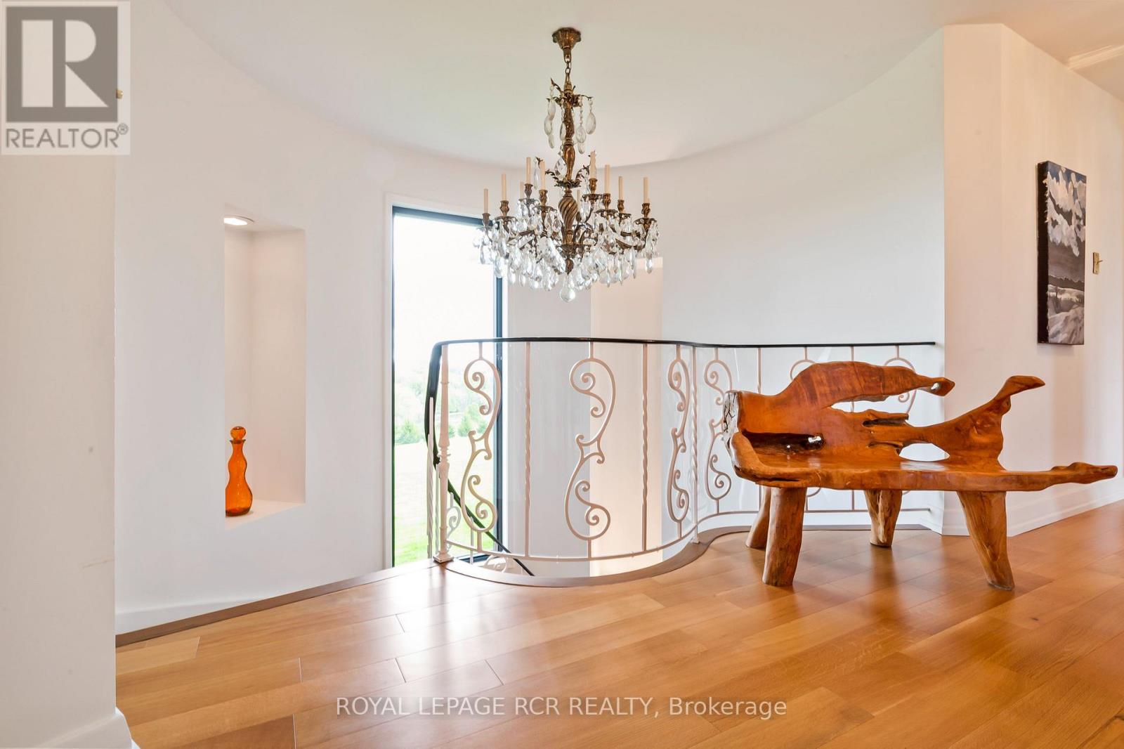 A winding driveway draws you toward The Riverlands, a spectacular top-of-the-line modern estate offering over 7,000 sq ft of total space. Nestled on 3.67 acres with commanding views of the Grand River, this architectural gem underwent an extraordinary full-scale renovation from '20 to '22. Today, it stands as a seamless fusion of timeless design and forward-thinking sustainability, boasting carbon- neutral, net-zero-ready systems. The main level features a stunning chef-inspired kitchen with quartz countertops, custom cabinetry, and an impressive suite of appliances. Sliding doors lead to a stone patio with a fireplace and BBQ, perfectly positioned to enjoy the sights and sounds of one of Ontario's premier fly fishing destinations. The open-concept living and dining area is enhanced by natural light, bespoke walnut built-ins, and sweeping river views. The primary suite is a private retreat, complete with a five-piece ensuite, custom dressing room with integrated laundry, and access to a versatile den or office with a wood-burning fireplace and access to the rooftop terrace. Two more bedrooms offer walk-in closets and share a beautifully updated bath. A curved staircase leads to the lower level featuring a second kitchen with an indoor charcoal grill, a family room with fireplace, a billiards room, a guest suite, a wine room, and a walk-in fridge. Thoughtfully designed to function seamlessly as a multi-generational home, this level offers independent yet connected living spaces ideal for extended family or guests. The showstopping indoor saltwater pool has dedicated HVAC and solar-powered heating, plus a sauna, change room, and adjoining sunroom with walkout to the backyard. Rooftop solar panels, geothermal systems, upgraded electrical, smart home features, and plans for a detached 3-car garage complete this one-of-a-kind package. Just minutes from Belwood Lake and downtown Elora, The Riverlands is a rare blend of modern luxury, natural beauty, and sustainable living (id:4555)