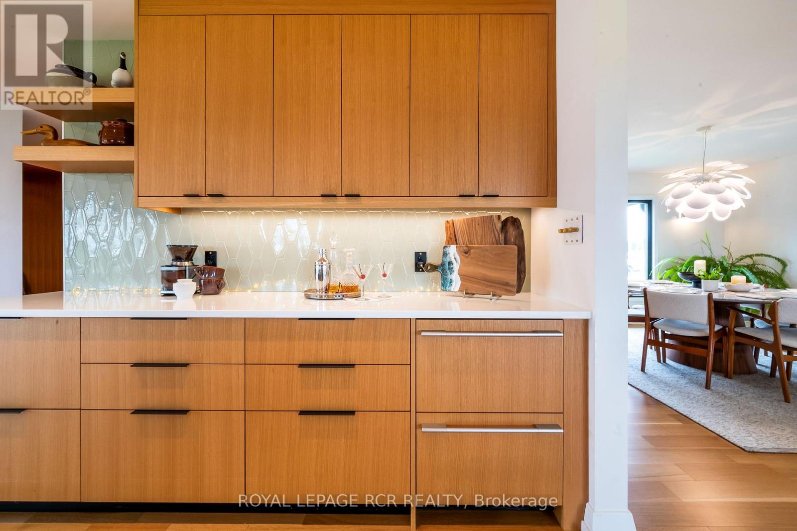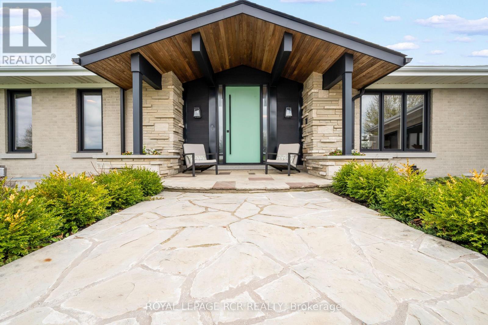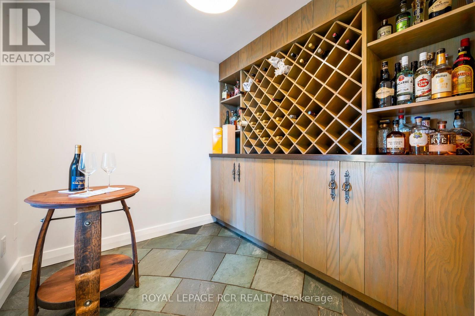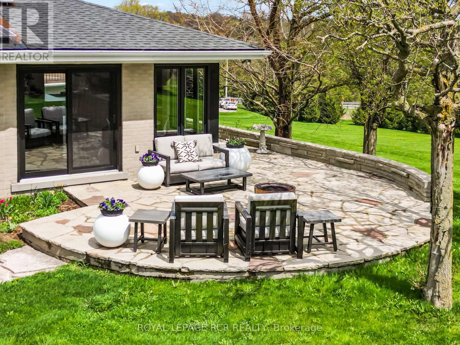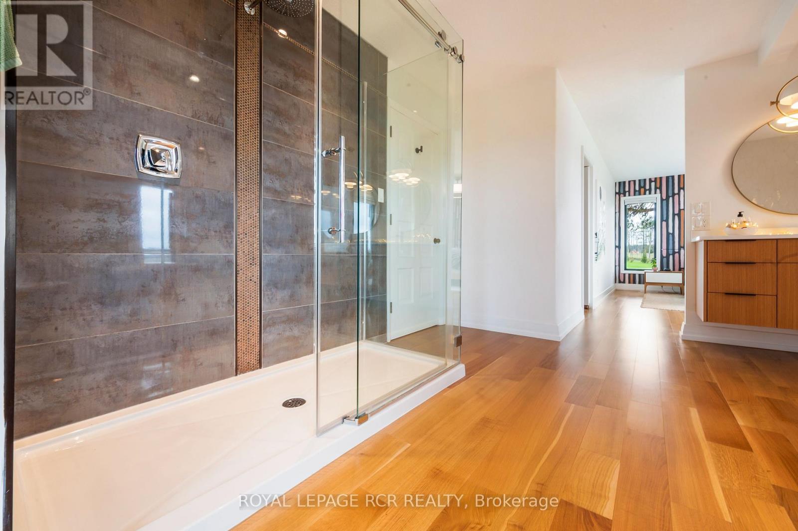 A winding driveway draws you toward The Riverlands, a spectacular top-of-the-line modern estate offering over 7,000 sq ft of total space. Nestled on 3.67 acres with commanding views of the Grand River, this architectural gem underwent an extraordinary full-scale renovation from '20 to '22. Today, it stands as a seamless fusion of timeless design and forward-thinking sustainability, boasting carbon- neutral, net-zero-ready systems. The main level features a stunning chef-inspired kitchen with quartz countertops, custom cabinetry, and an impressive suite of appliances. Sliding doors lead to a stone patio with a fireplace and BBQ, perfectly positioned to enjoy the sights and sounds of one of Ontario's premier fly fishing destinations. The open-concept living and dining area is enhanced by natural light, bespoke walnut built-ins, and sweeping river views. The primary suite is a private retreat, complete with a five-piece ensuite, custom dressing room with integrated laundry, and access to a versatile den or office with a wood-burning fireplace and access to the rooftop terrace. Two more bedrooms offer walk-in closets and share a beautifully updated bath. A curved staircase leads to the lower level featuring a second kitchen with an indoor charcoal grill, a family room with fireplace, a billiards room, a guest suite, a wine room, and a walk-in fridge. Thoughtfully designed to function seamlessly as a multi-generational home, this level offers independent yet connected living spaces ideal for extended family or guests. The showstopping indoor saltwater pool has dedicated HVAC and solar-powered heating, plus a sauna, change room, and adjoining sunroom with walkout to the backyard. Rooftop solar panels, geothermal systems, upgraded electrical, smart home features, and plans for a detached 3-car garage complete this one-of-a-kind package. Just minutes from Belwood Lake and downtown Elora, The Riverlands is a rare blend of modern luxury, natural beauty, and sustainable living (id:4555)