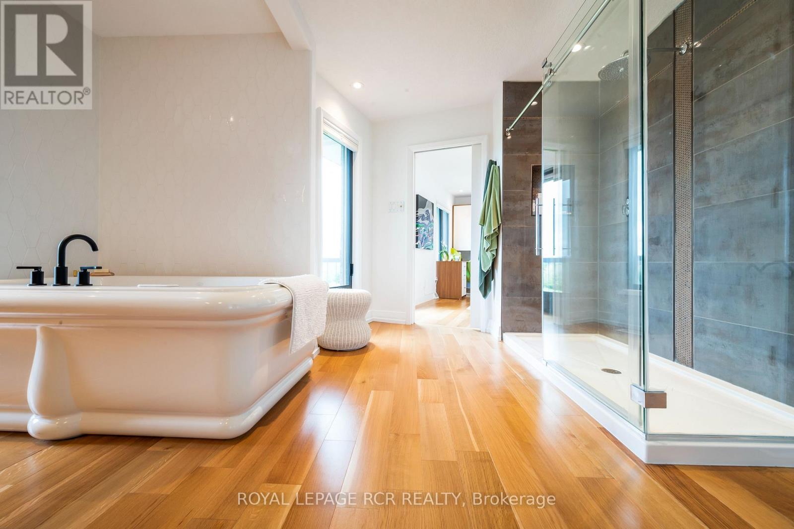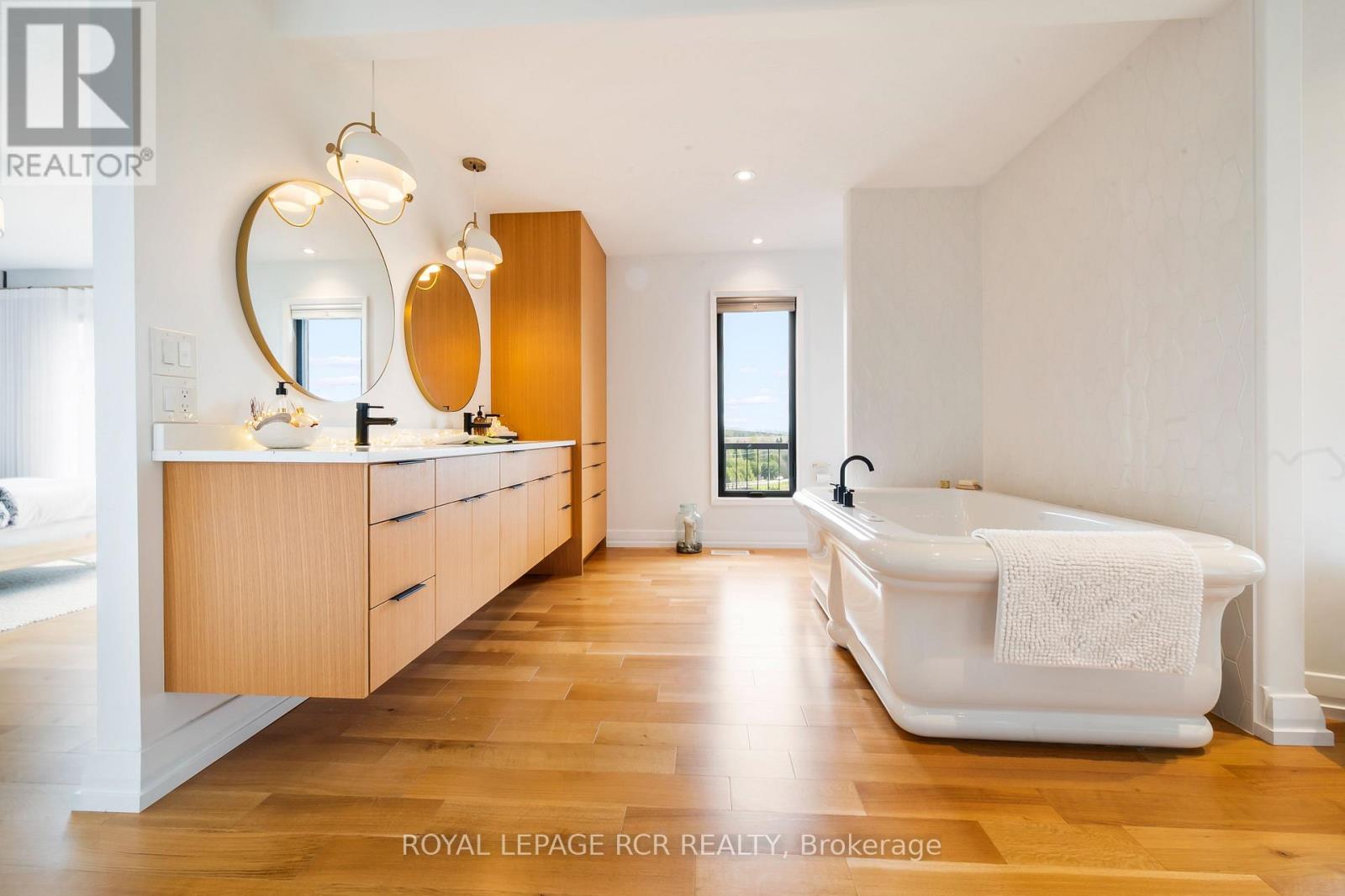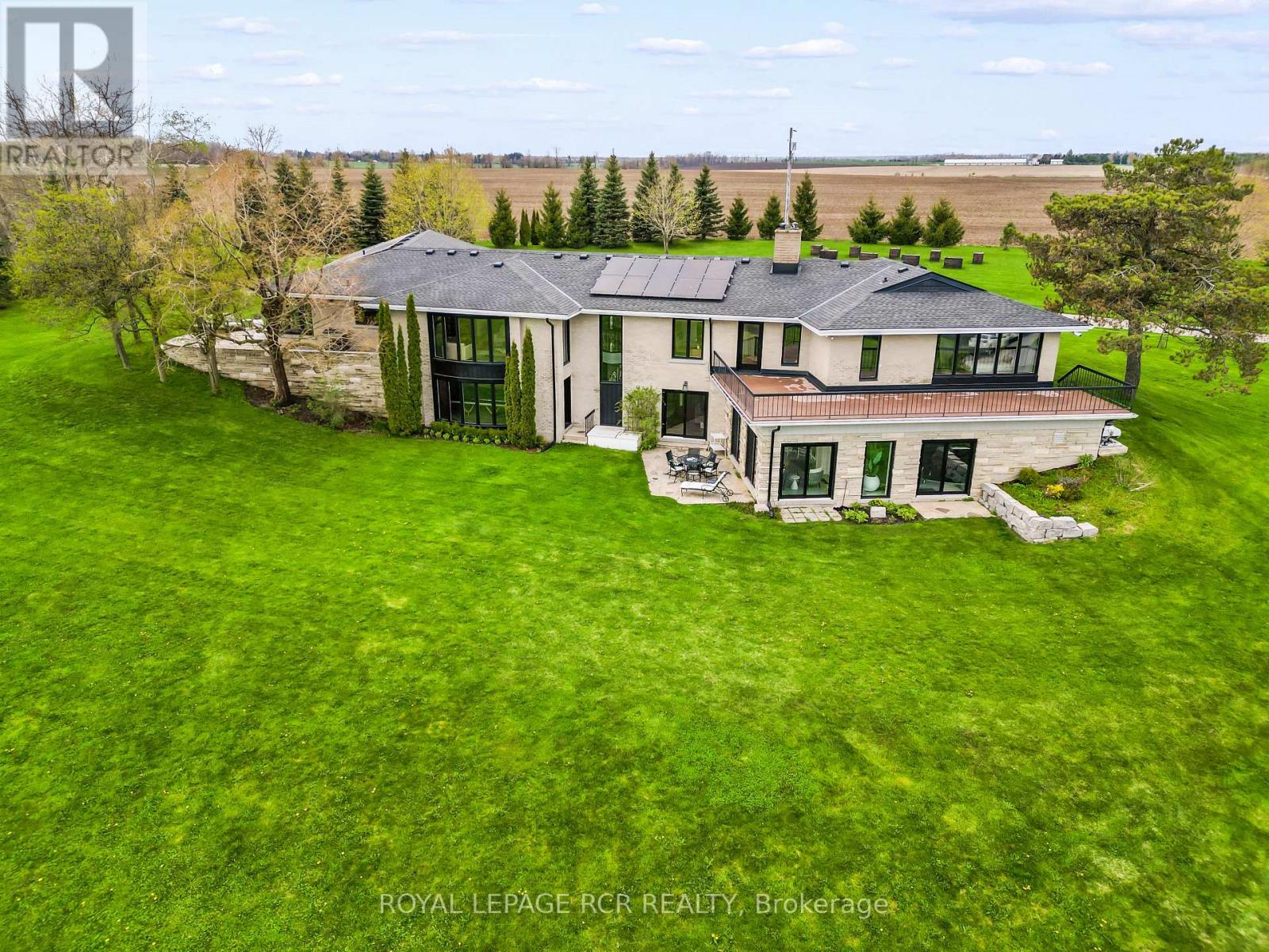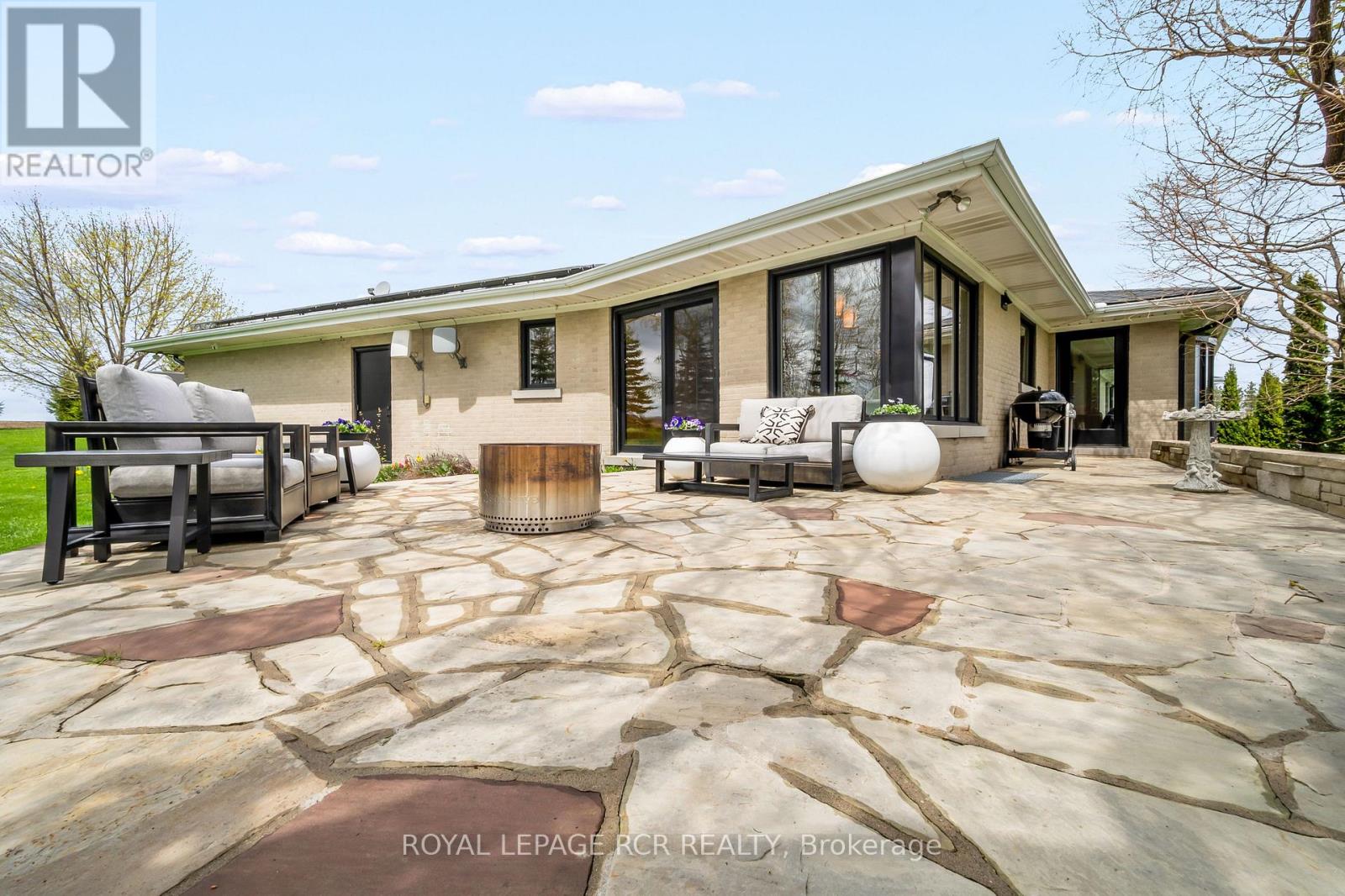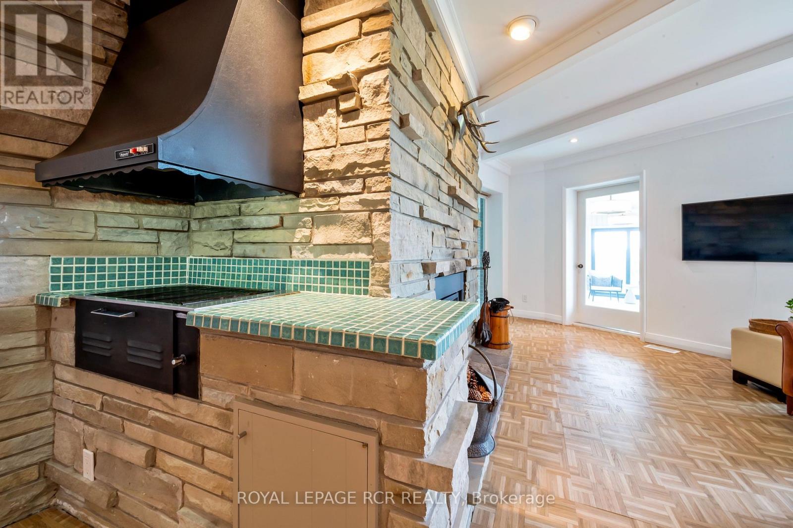 A winding driveway draws you toward The Riverlands, a spectacular top-of-the-line modern estate offering over 7,000 sq ft of total space. Nestled on 3.67 acres with commanding views of the Grand River, this architectural gem underwent an extraordinary full-scale renovation from '20 to '22. Today, it stands as a seamless fusion of timeless design and forward-thinking sustainability, boasting carbon- neutral, net-zero-ready systems. The main level features a stunning chef-inspired kitchen with quartz countertops, custom cabinetry, and an impressive suite of appliances. Sliding doors lead to a stone patio with a fireplace and BBQ, perfectly positioned to enjoy the sights and sounds of one of Ontario's premier fly fishing destinations. The open-concept living and dining area is enhanced by natural light, bespoke walnut built-ins, and sweeping river views. The primary suite is a private retreat, complete with a five-piece ensuite, custom dressing room with integrated laundry, and access to a versatile den or office with a wood-burning fireplace and access to the rooftop terrace. Two more bedrooms offer walk-in closets and share a beautifully updated bath. A curved staircase leads to the lower level featuring a second kitchen with an indoor charcoal grill, a family room with fireplace, a billiards room, a guest suite, a wine room, and a walk-in fridge. Thoughtfully designed to function seamlessly as a multi-generational home, this level offers independent yet connected living spaces ideal for extended family or guests. The showstopping indoor saltwater pool has dedicated HVAC and solar-powered heating, plus a sauna, change room, and adjoining sunroom with walkout to the backyard. Rooftop solar panels, geothermal systems, upgraded electrical, smart home features, and plans for a detached 3-car garage complete this one-of-a-kind package. Just minutes from Belwood Lake and downtown Elora, The Riverlands is a rare blend of modern luxury, natural beauty, and sustainable living (id:4555)