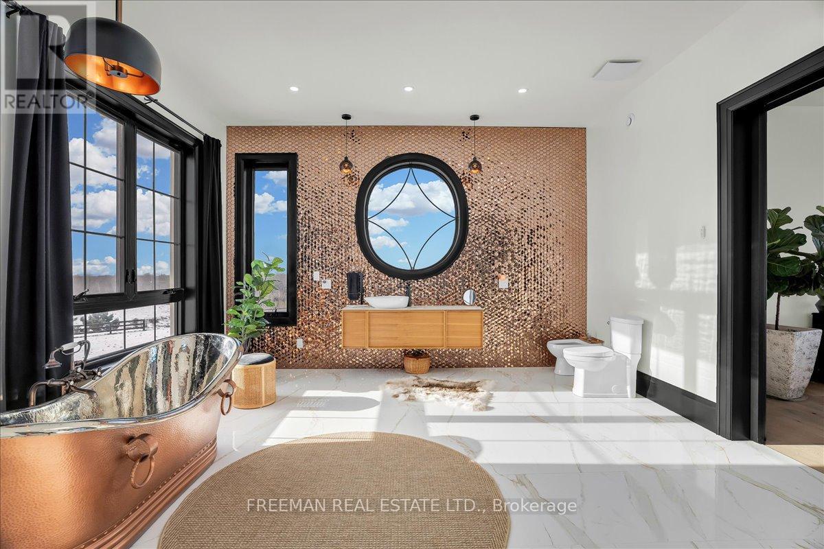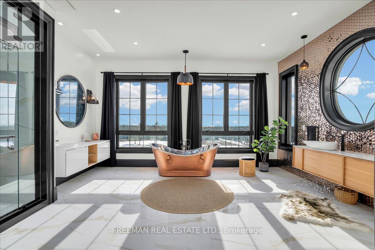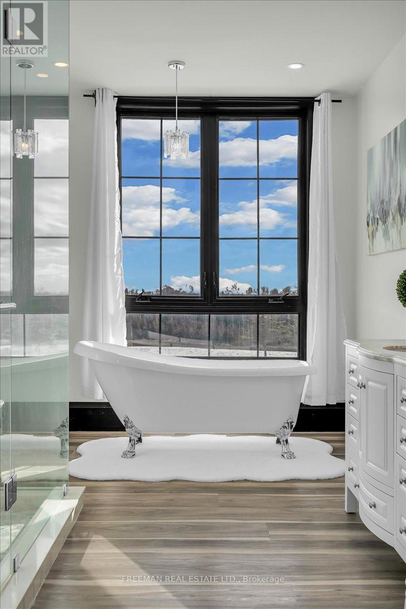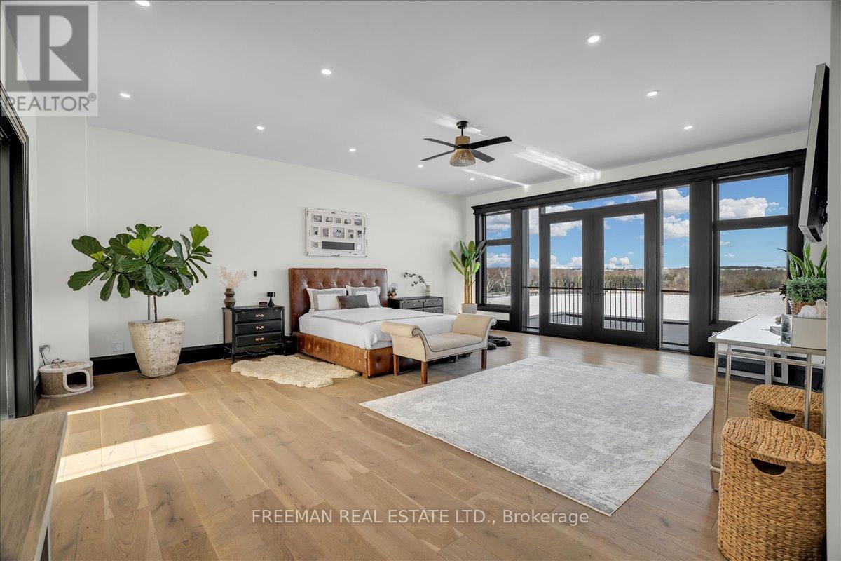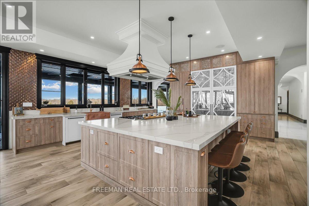 A once-in-a-lifetime opportunity to own one of Durham Region's most remarkable modern country estates. Set on 52 acres of rolling countryside, forested walking trails, & a peaceful pond that glistens in summer, transforming into a skating rink in winter, this architectural masterpiece combines timeless design, privacy, & connection to nature in every direction. Inside, more than 8,500 sq. ft. of finished living space unfolds with soaring ceilings, walls of glass, & sunlit interiors that frame the surrounding landscape like art. Expansive principal rooms flow effortlessly, creating an atmosphere that feels open, refined, & entirely at ease. The gourmet kitchen is a showpiece of form & function with top-tier appliances, designer finishes, & a generous island that anchors gatherings of family & friends. The west-wing primary suite offers a private sanctuary with a dressing room or nursery, large walk-in closet, fitness room, & a spa-inspired ensuite featuring dual vanities, a two-person steam shower, & a freestanding tub perfectly placed to take in serene views of the trees. Upstairs, each bedroom enjoys its own ensuite & walk-in closet, while a self-contained guest wing with a full kitchen, living area & bath provides comfort & independence for guests or extended family. Eight years new, this home was built with lasting quality & modern innovation in mind, featuring geothermal heating, radiant floors, multiple fireplace rough-ins, a pet spa, & a heated three-car garage. The 1,150 sq.ft. covered terrace invites year-round outdoor living & endless sunsets. The lower level adds another 5,700 sq. ft. of potential with exceptionally high ceilings & large windows ready to be finished as a theatre, gym, studio, or wine cellar. Privately situated at the end of a quiet cul-de-sac, yet only minutes from top schools, shops, & community amenities. A rare blend of modern architecture, natural beauty, & quiet sophistication that must be seen to be fully appreciated. (id:4555)