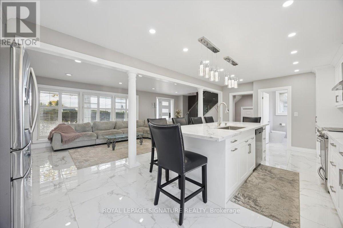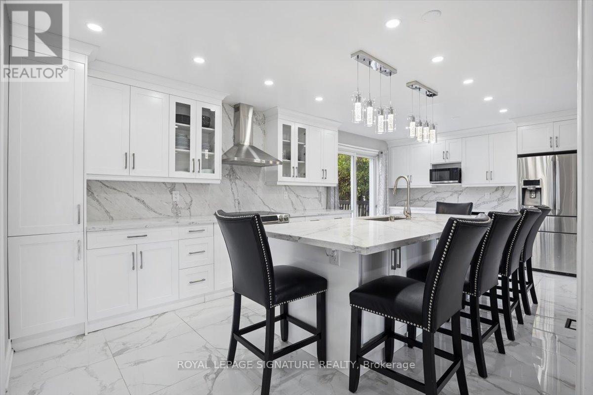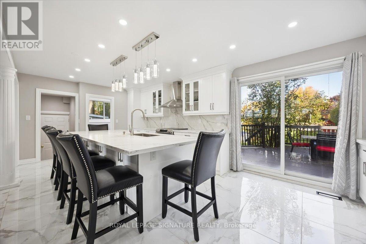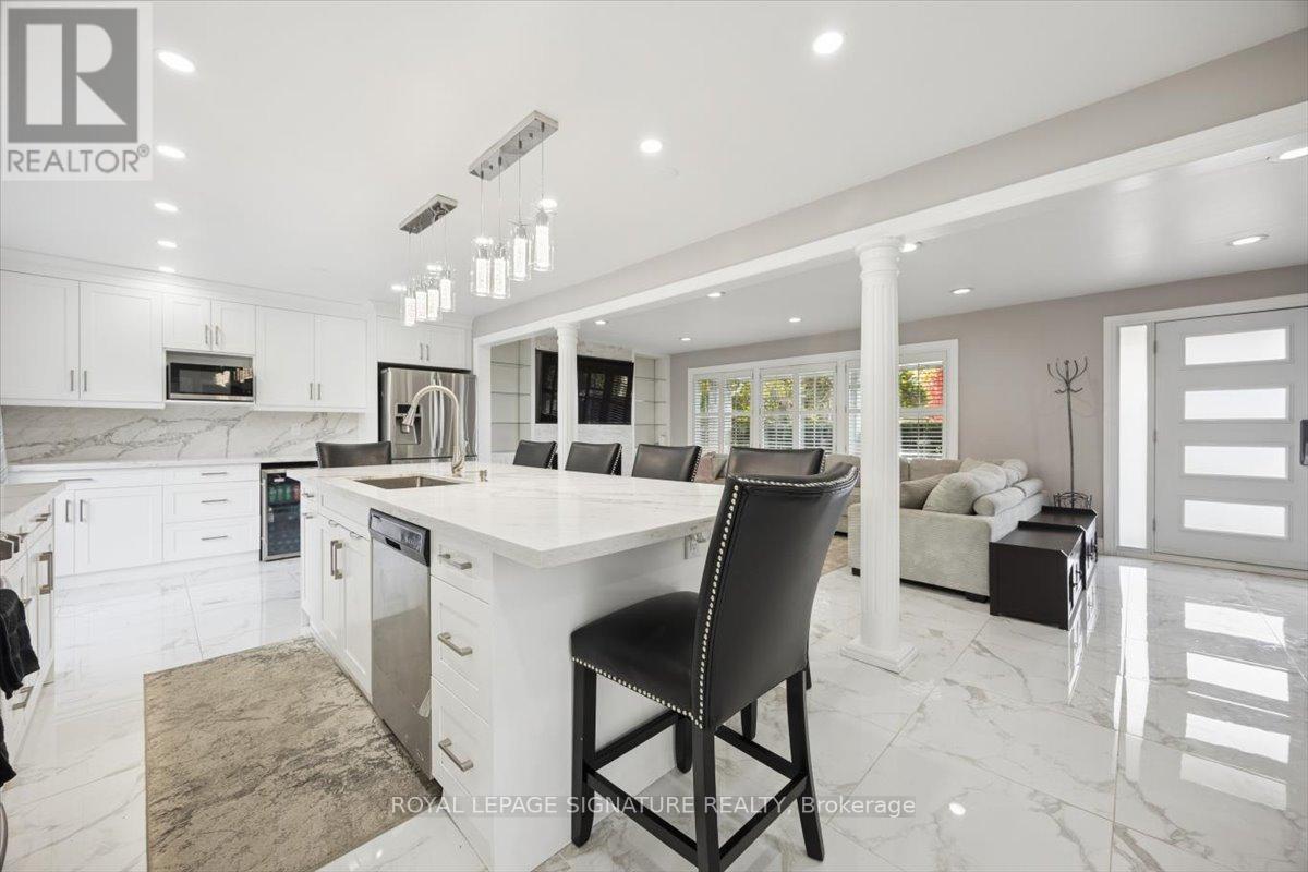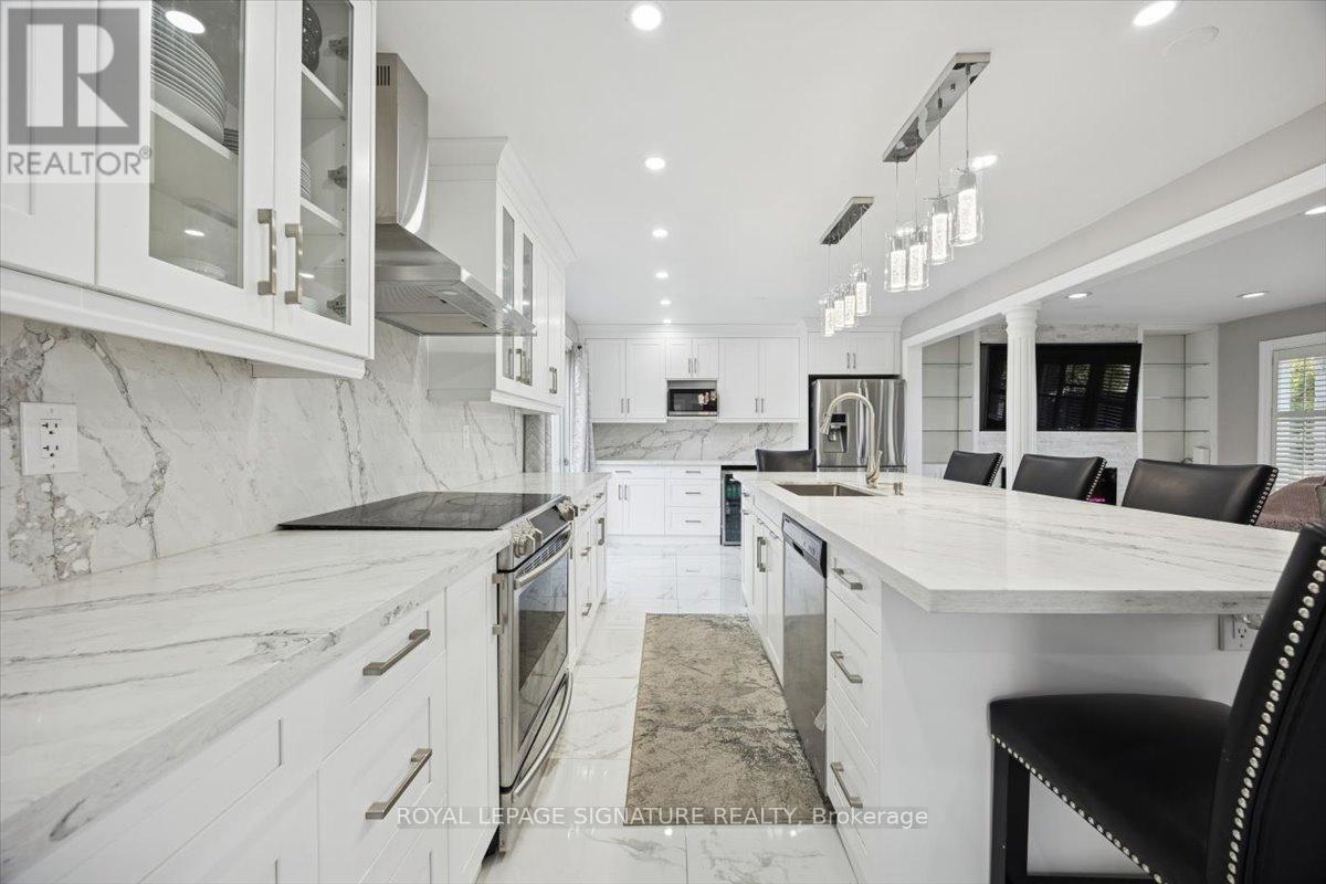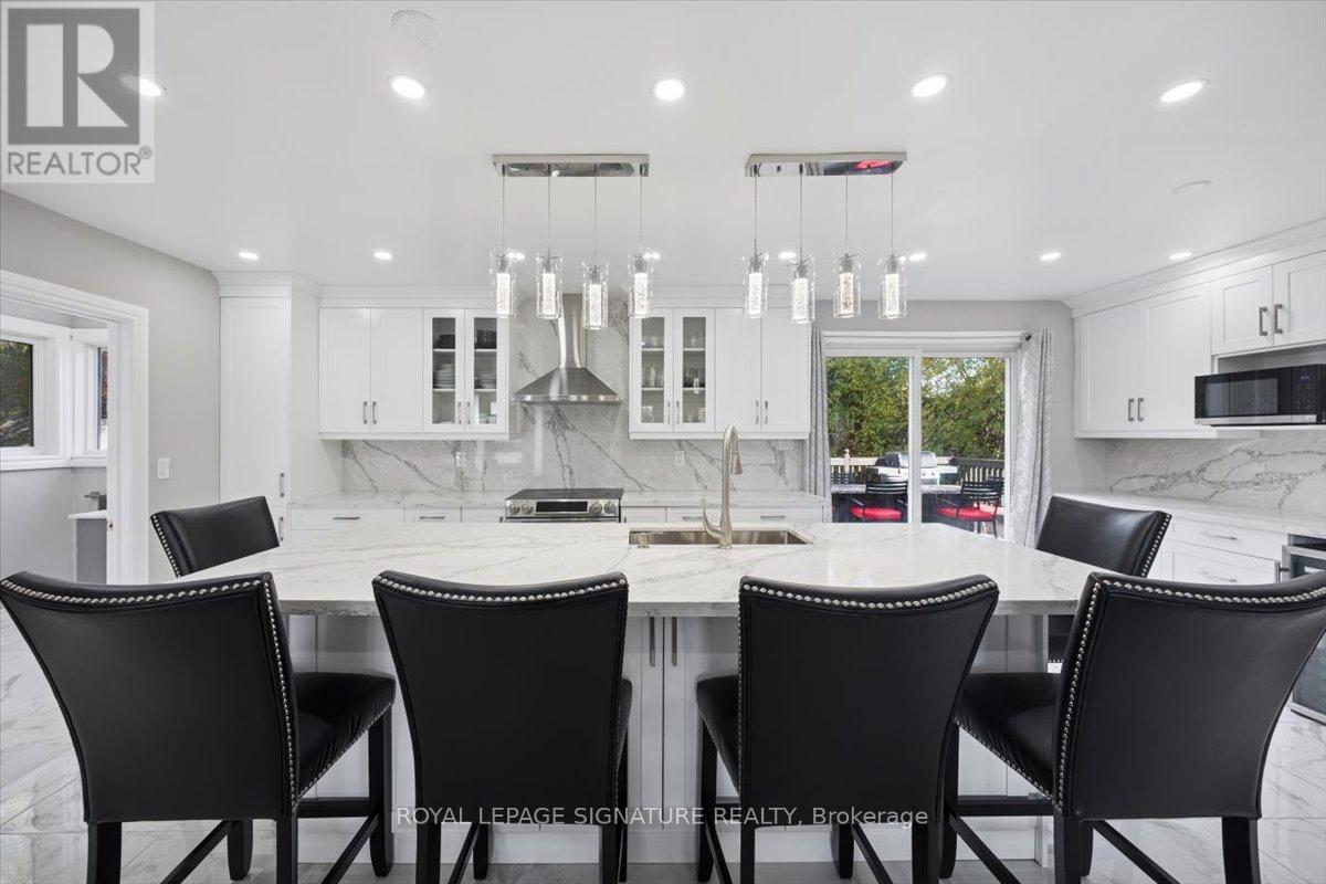 Welcome to Mitchell Corners in the heart of Clarington - where modern luxury meets timeless country charm. This beautifully renovated 5+1 bedroom, 4-bathroom home is tucked away on a quiet side street, offering the perfect blend of sophistication,functionality, and serene living. From the moment you arrive, the oversized wrap-around driveway - with space for 12+ vehicles- and stamped concrete walkway and porch create a warm, inviting first impression. Step inside to discover a pristine, open-concept main floor that seamlessly connects the kitchen, dining, and living areas - ideal for everyday living and effortless entertaining. At the heart of the home is the brand-new (2025) chef's kitchen, a true showstopper featuring an oversized quartz island with seating for eight, matching quartz countertops and backsplash, soft-close cabinetry with glass display panels, a built-in beverage centre and microwave, and sleek pot lighting to accent every detail. The spacious dining and living areas are anchored by a custom-designed TV wall unit, while 24x24 luxury tiles flow throughout the main level, transitioning to new vinyl flooring in the fully finished basement - offering style and durability. Upstairs, a striking glass-panel staircase framed by a fluted accent wall and crowned with a grand chandelier adds a touch of refined elegance and warmth. All four bathrooms have been thoughtfully renovated with contemporary fixtures and quality finishes, and a fresh coat of paint throughout enhances the home's bright, airy ambiance. Enjoy peace of mind with a new furnace and AC (2022), upgraded lighting throughout the home,convenient upper-level laundry, and ample space ideal for large or multi-generational families. This move-in-ready home is a rare gem in Mitchell Corners - offering the best of both worlds: elevated, modern design in a peaceful, country setting just minutes from highways, amenities, and top-rated schools. (id:4555)