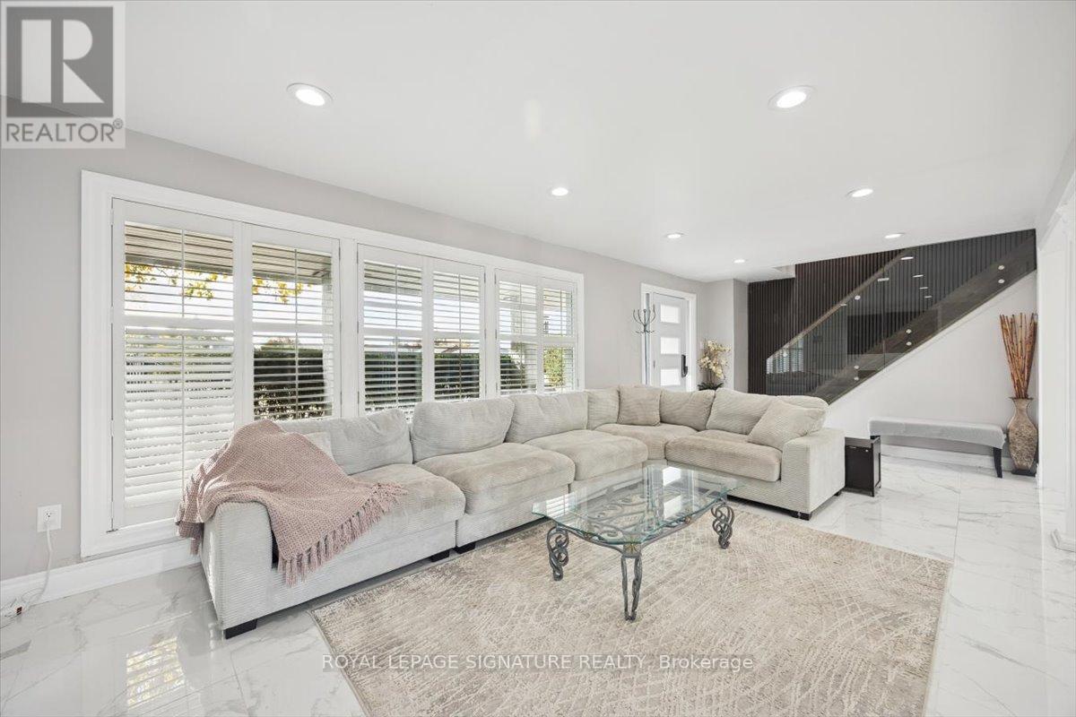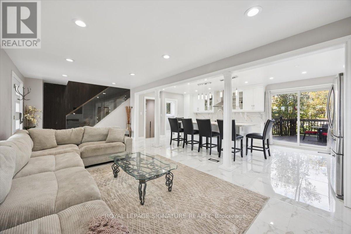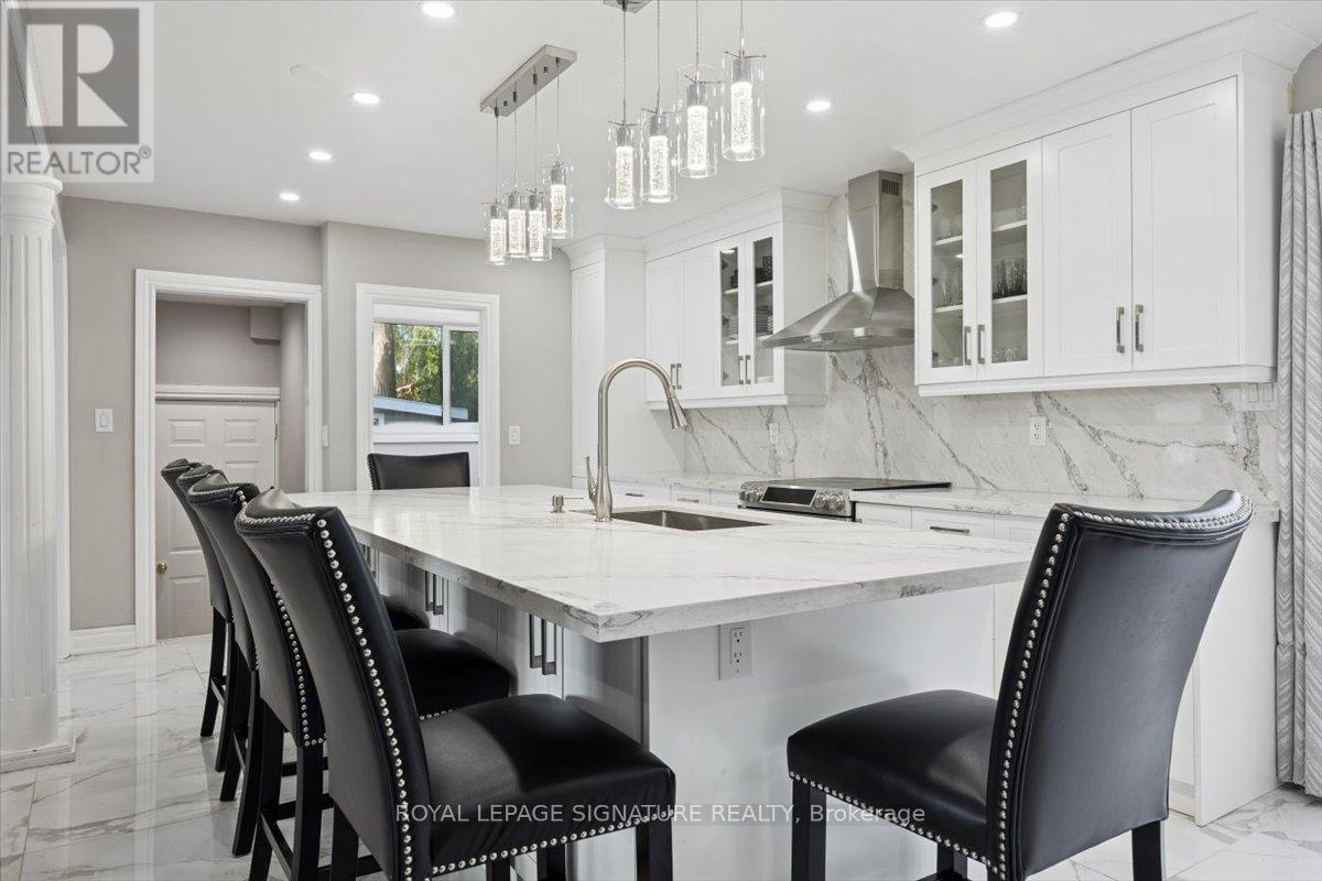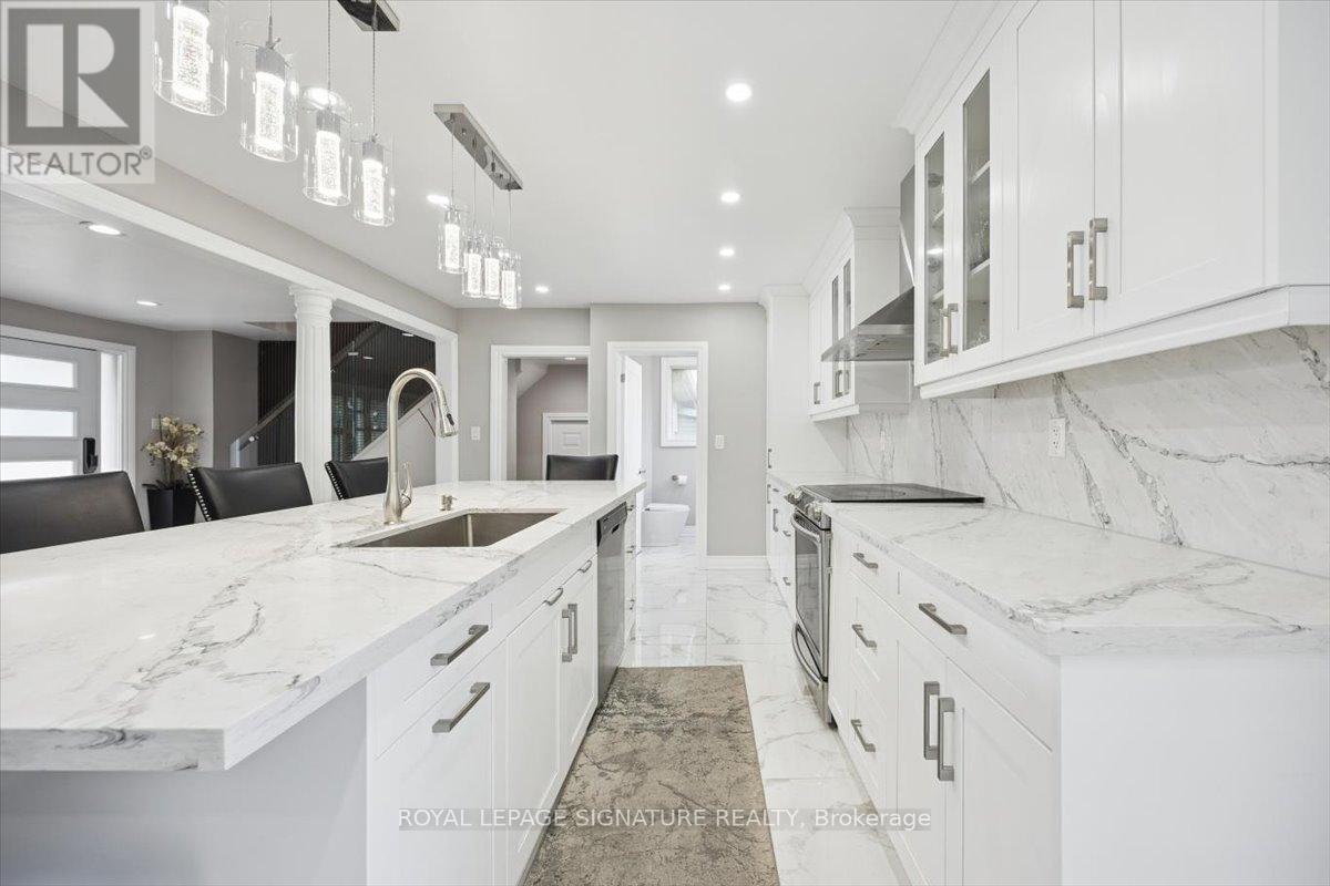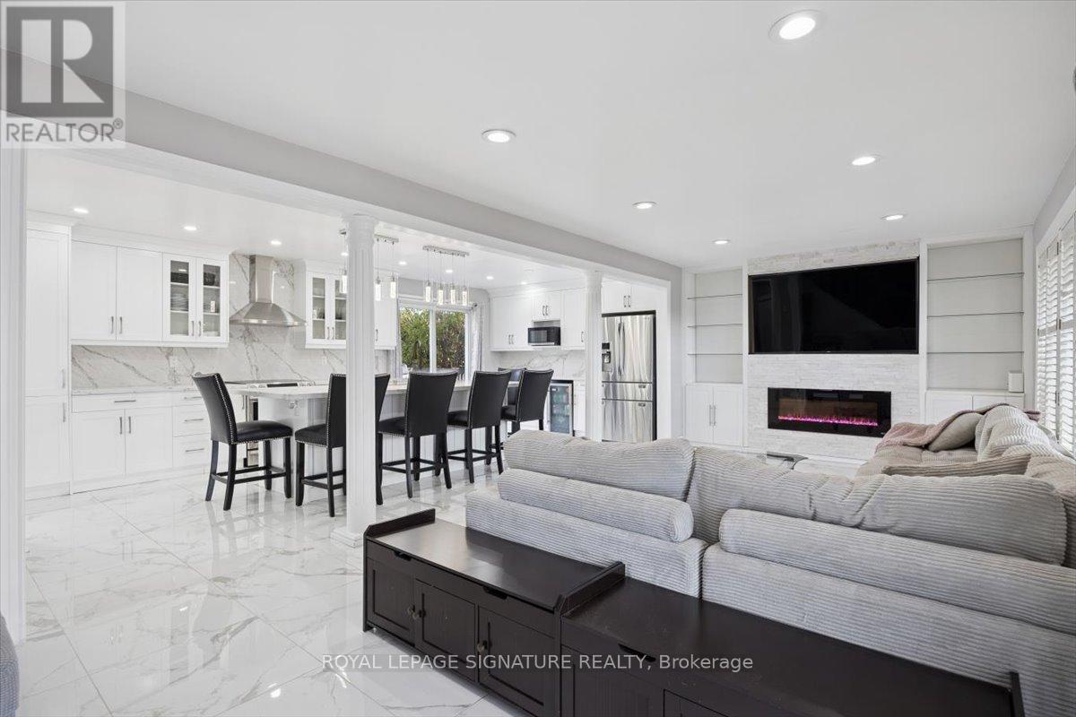 Welcome to Mitchell Corners in the heart of Clarington - where modern luxury meets timeless country charm. This beautifully renovated 5+1 bedroom, 4-bathroom home is tucked away on a quiet side street, offering the perfect blend of sophistication,functionality, and serene living. From the moment you arrive, the oversized wrap-around driveway - with space for 12+ vehicles- and stamped concrete walkway and porch create a warm, inviting first impression. Step inside to discover a pristine, open-concept main floor that seamlessly connects the kitchen, dining, and living areas - ideal for everyday living and effortless entertaining. At the heart of the home is the brand-new (2025) chef's kitchen, a true showstopper featuring an oversized quartz island with seating for eight, matching quartz countertops and backsplash, soft-close cabinetry with glass display panels, a built-in beverage centre and microwave, and sleek pot lighting to accent every detail. The spacious dining and living areas are anchored by a custom-designed TV wall unit, while 24x24 luxury tiles flow throughout the main level, transitioning to new vinyl flooring in the fully finished basement - offering style and durability. Upstairs, a striking glass-panel staircase framed by a fluted accent wall and crowned with a grand chandelier adds a touch of refined elegance and warmth. All four bathrooms have been thoughtfully renovated with contemporary fixtures and quality finishes, and a fresh coat of paint throughout enhances the home's bright, airy ambiance. Enjoy peace of mind with a new furnace and AC (2022), upgraded lighting throughout the home,convenient upper-level laundry, and ample space ideal for large or multi-generational families. This move-in-ready home is a rare gem in Mitchell Corners - offering the best of both worlds: elevated, modern design in a peaceful, country setting just minutes from highways, amenities, and top-rated schools. (id:4555)