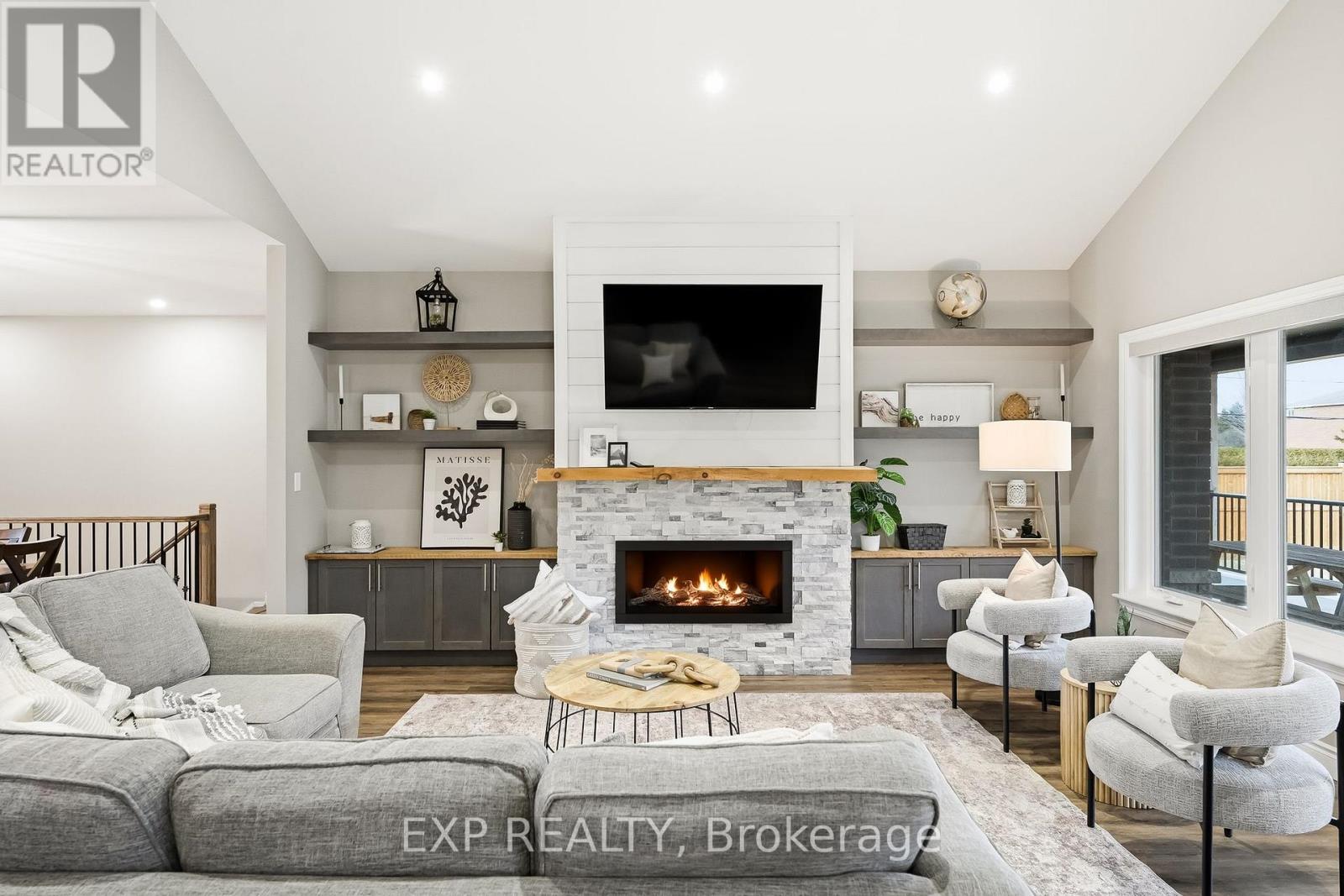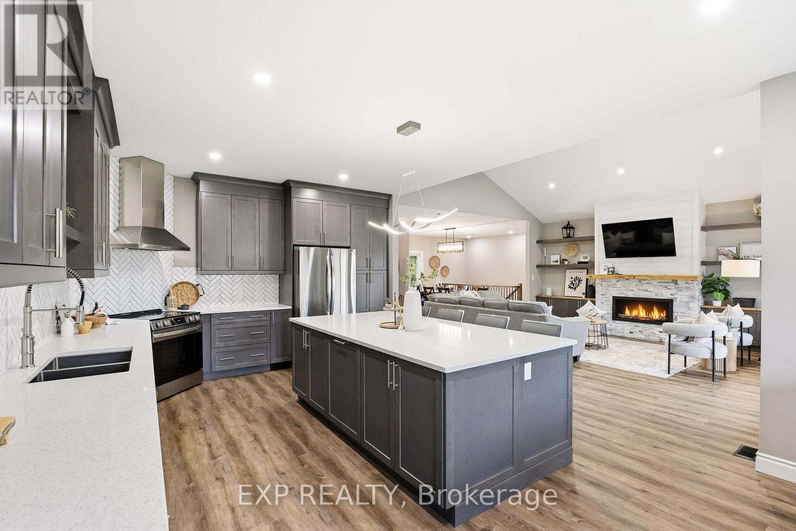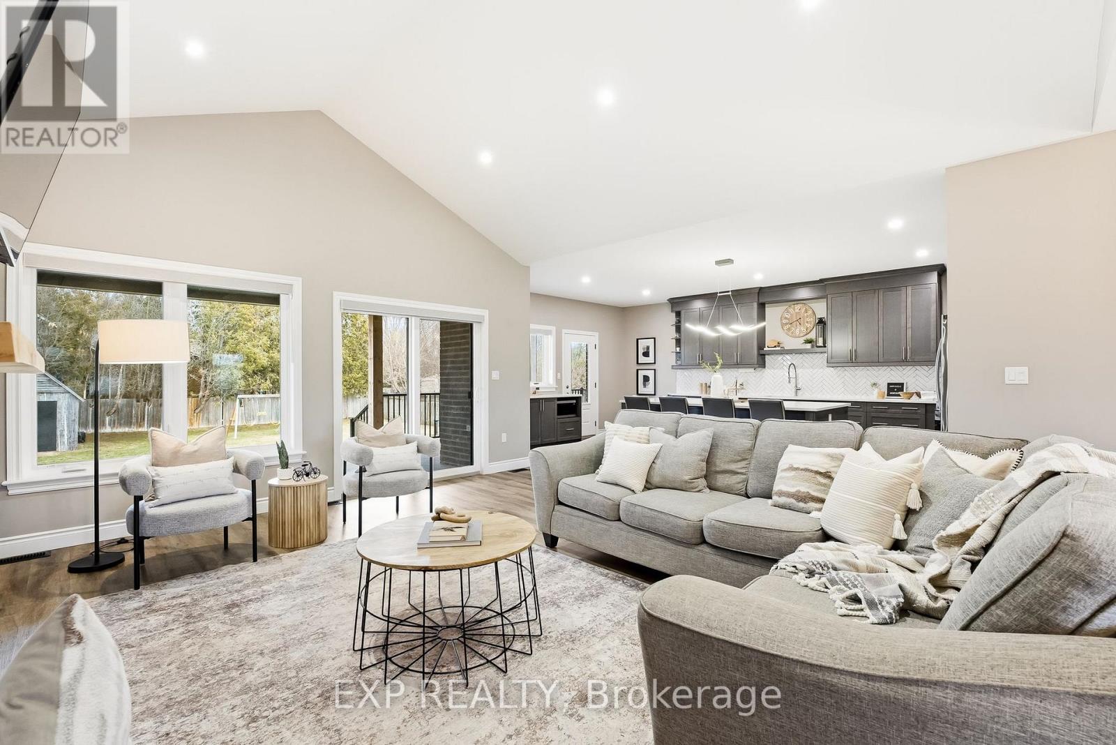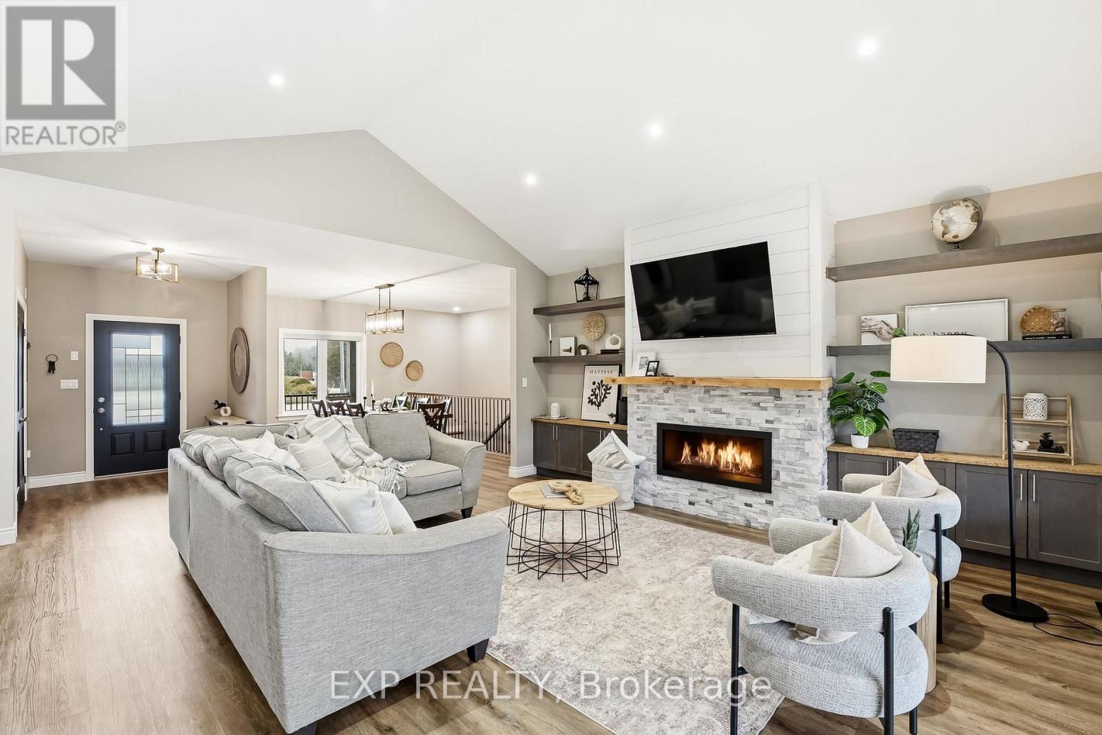 Set on a large fenced corner lot with a quiet rural feel just minutes to town, this brick bungalow offers 3+1 bedrooms, 4 baths, and the breathing room, finish level and flexibility buyers rarely find in one package. The main floor offers approx. 2,483 sq ft per MPAC, soaring vaulted ceilings, a stunning open-concept living room, a gas fireplace with stone surround and built-ins, and a showpiece kitchen with quartz counters, an oversized island for four, stainless steel appliances, a beverage station and walkout to the covered back porch. The primary suite feels like a retreat with porch access, dual walk-in closets and a spa-like ensuite with double vanity and glass shower. Two additional bedrooms, a 5-piece main bath, dedicated office/flex room, main-floor laundry/mudroom and a 2-piece powder room complete the level. Downstairs, the fully finished basement with 9-ft ceilings adds a huge rec room, fourth bedroom and full bath. Outside, enjoy the expansive covered rear concrete porch, oversized double garage, parking for approx. 10 in the driveway, a garden shed and a wide backyard with room to host, play and unwind. Built in 2024 with updated septic and landscaping sod. Do not miss out on this stunner of a home! (id:4555)
