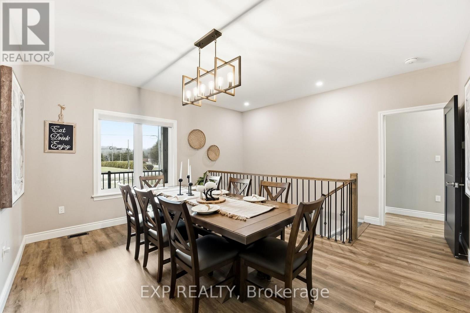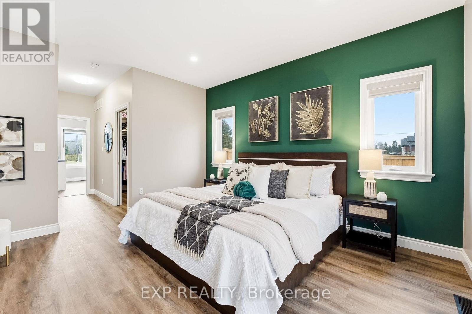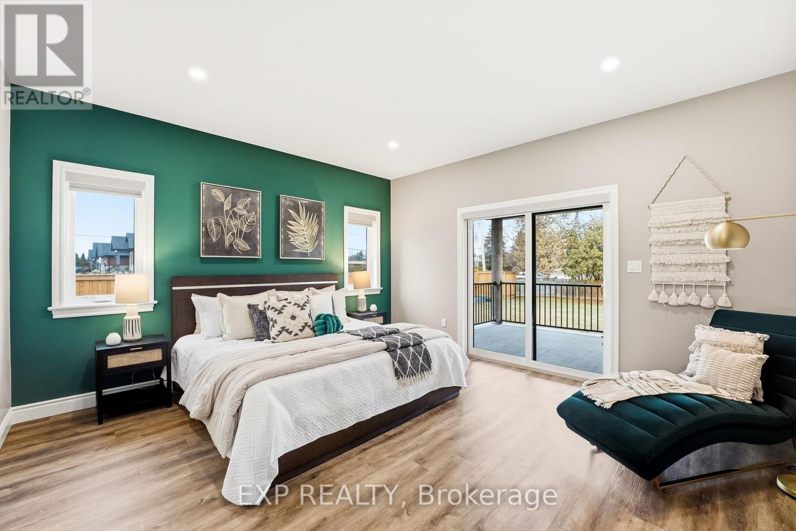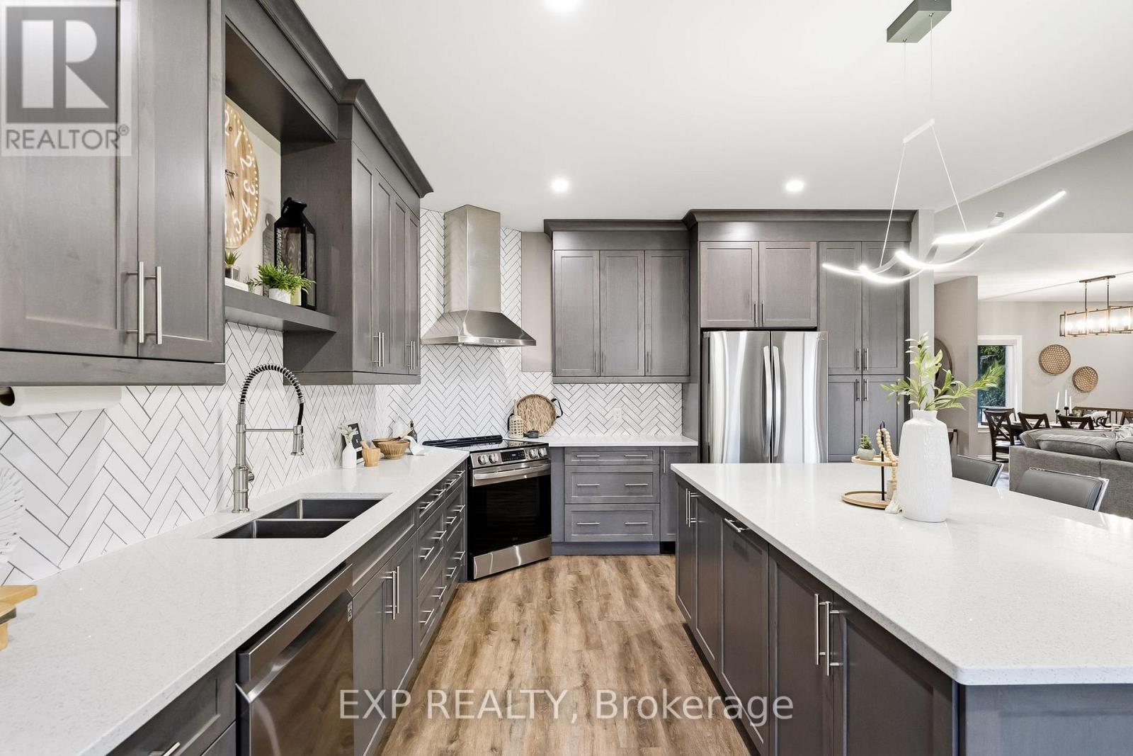 Set on a large fenced corner lot with a quiet rural feel just minutes to town, this brick bungalow offers 3+1 bedrooms, 4 baths, and the breathing room, finish level and flexibility buyers rarely find in one package. The main floor offers approx. 2,483 sq ft per MPAC, soaring vaulted ceilings, a stunning open-concept living room, a gas fireplace with stone surround and built-ins, and a showpiece kitchen with quartz counters, an oversized island for four, stainless steel appliances, a beverage station and walkout to the covered back porch. The primary suite feels like a retreat with porch access, dual walk-in closets and a spa-like ensuite with double vanity and glass shower. Two additional bedrooms, a 5-piece main bath, dedicated office/flex room, main-floor laundry/mudroom and a 2-piece powder room complete the level. Downstairs, the fully finished basement with 9-ft ceilings adds a huge rec room, fourth bedroom and full bath. Outside, enjoy the expansive covered rear concrete porch, oversized double garage, parking for approx. 10 in the driveway, a garden shed and a wide backyard with room to host, play and unwind. Built in 2024 with updated septic and landscaping sod. Do not miss out on this stunner of a home! (id:4555)