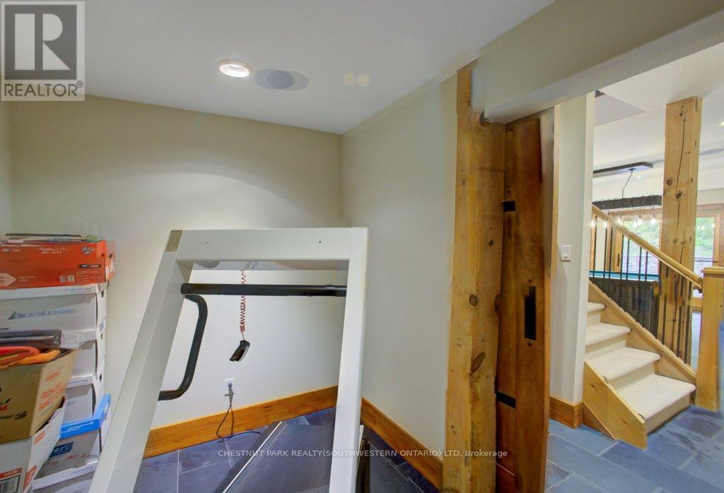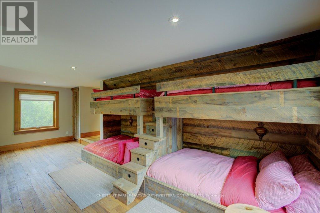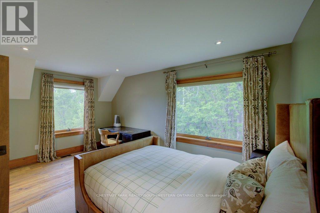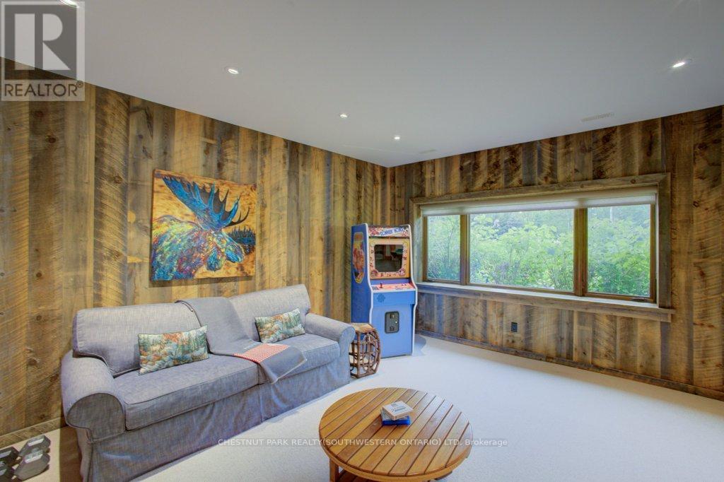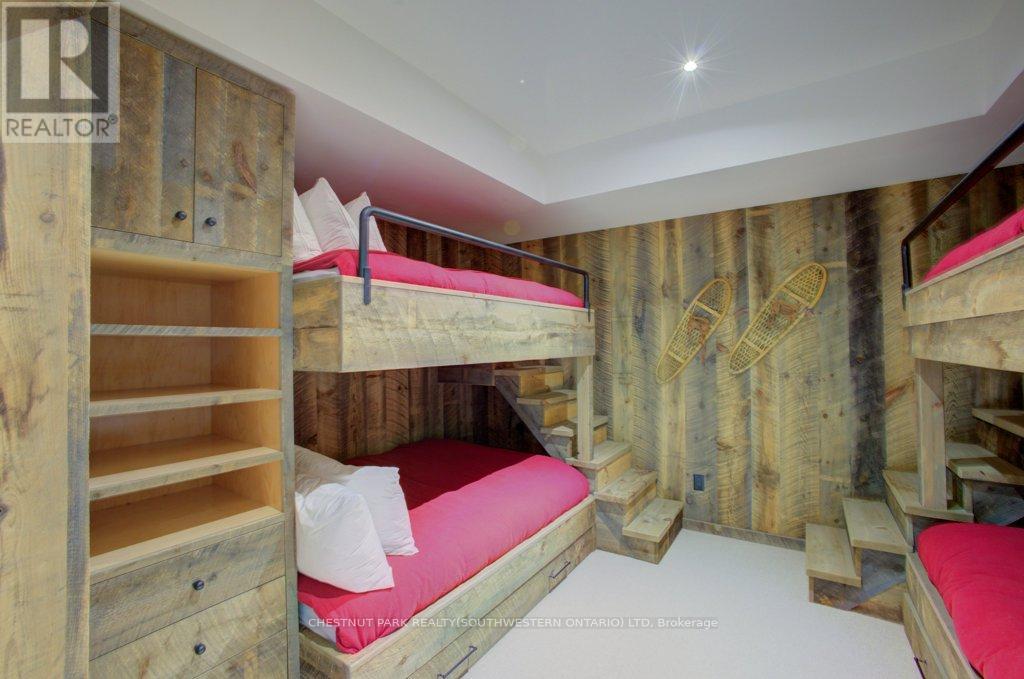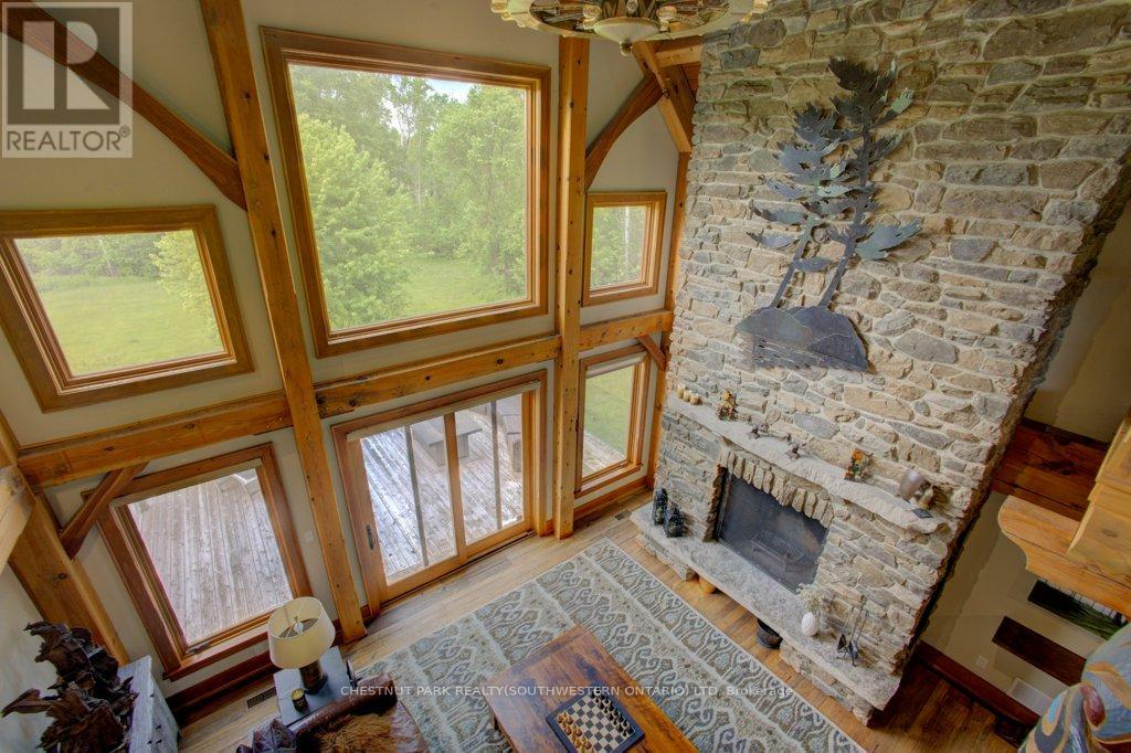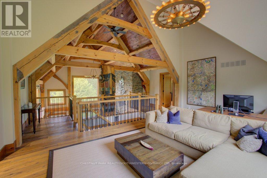 Welcome to The Great Totem House, a stunning reclaimed timber frame chalet set on a private 1.3-acre forested lot, just minutes from Osler Bluff Ski Club, downtown Collingwood, golf, trails, and more. Step inside to discover over 5,000 sq. ft. of beautifully appointed living space. The Great Room features soaring ceilings, a floor-to-ceiling stone fireplace, and the captivating totem pole as its centerpiece. A chef's kitchen awaits, with rare stone countertops, professional-grade appliances, and seating for 16 in the elegant dining area-ideal for hosting après-ski dinners or summer gatherings. The home offers 6 spacious bedrooms and 5 luxurious bathrooms, including a main-floor primary suite with a spa-like ensuite, walk-in closet, and access to the expansive deck with oversized hot tub. The loft level includes an open lounge/TV space, home office, and three additional bedrooms, each with stunning treetop views. Entertain effortlessly on the flagstone patio, upper deck with fire table, or around the custom fire pit tucked into the landscaped gardens. Stone stairways, Douglas Fir pergolas, and multiple seating areas make this property as inviting outside as it is inside. The lower walkout level offers a spacious recreation room with wet bar, a media room, and ample space for a games area or home theatre. Two additional bedrooms complete the lower level, offering generous accommodations for family and guests. Modern comforts include geothermal heating & cooling, radiant in-floor heating, and a mudroom with five custom locker-style cubbies-ideal for active families and winter gear. Professionally designed award-winning landscaping completes this rare offering. Whether you're enjoying ski season, exploring hiking and biking trails, or relaxing with a coffee on the covered peace, privacy, and prestige. (id:4555)