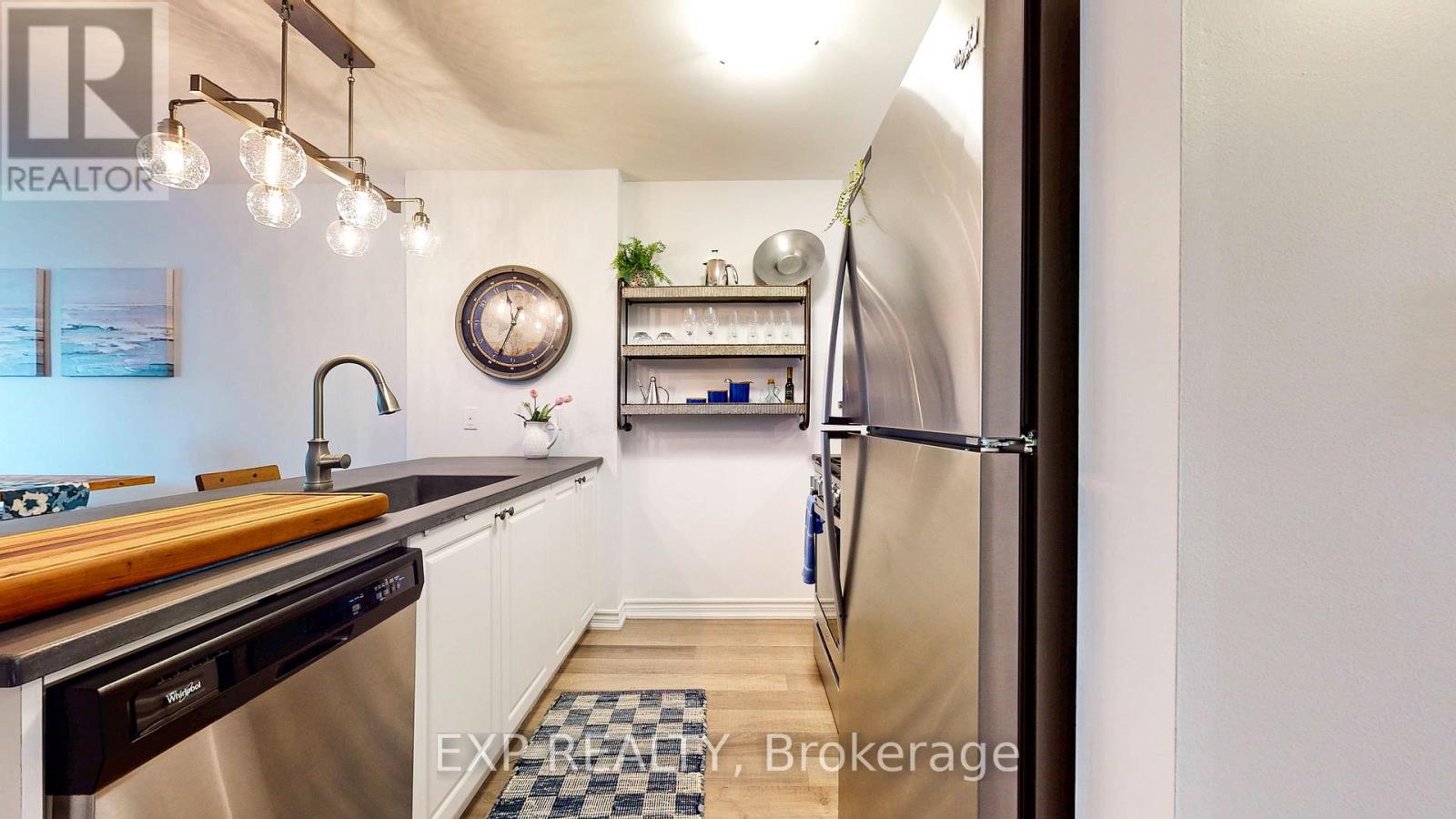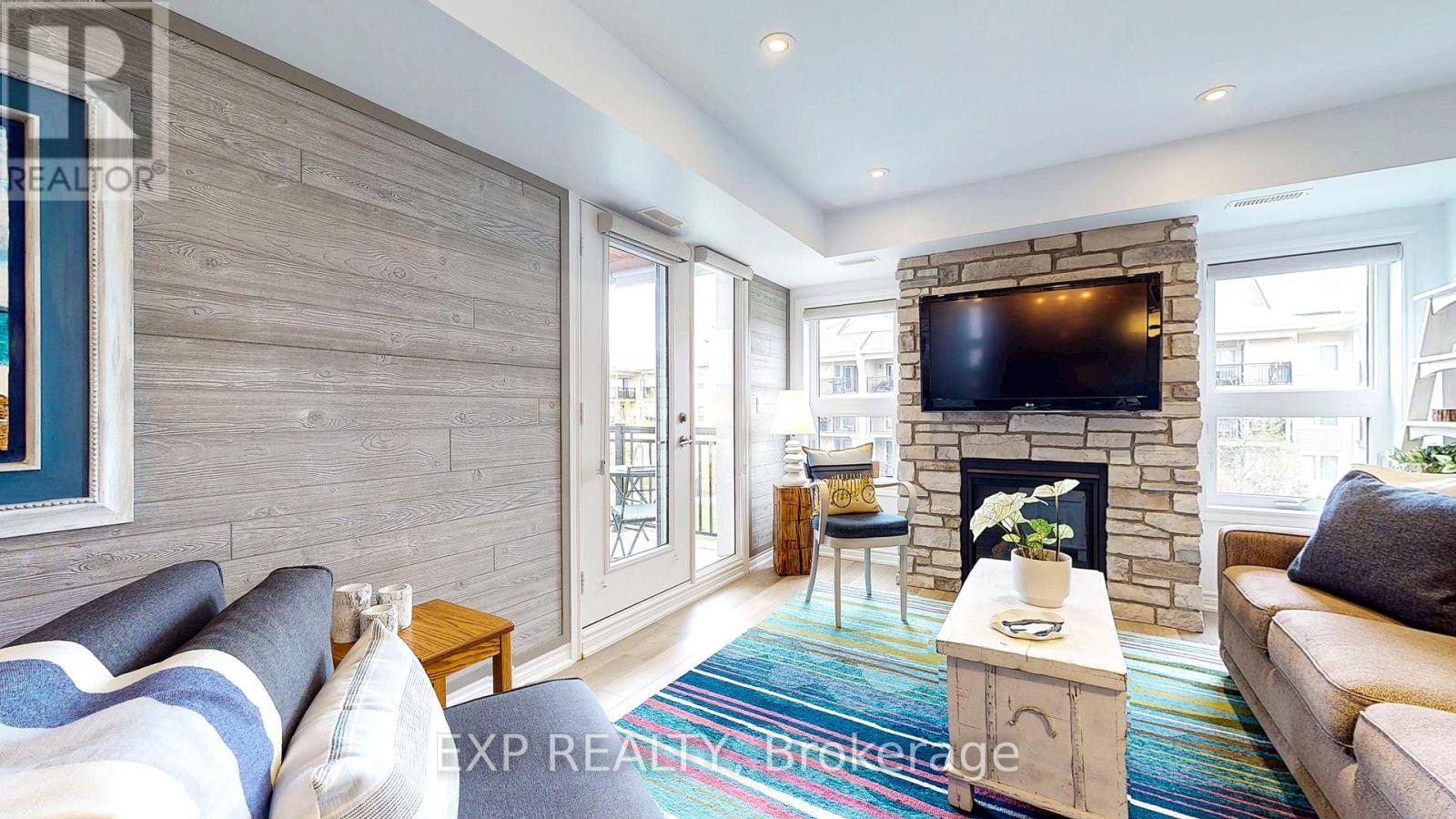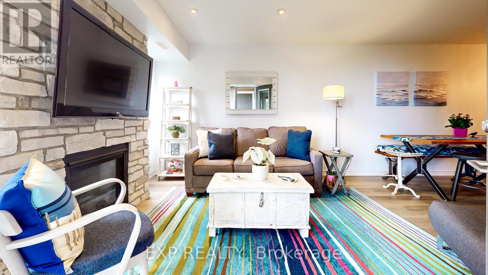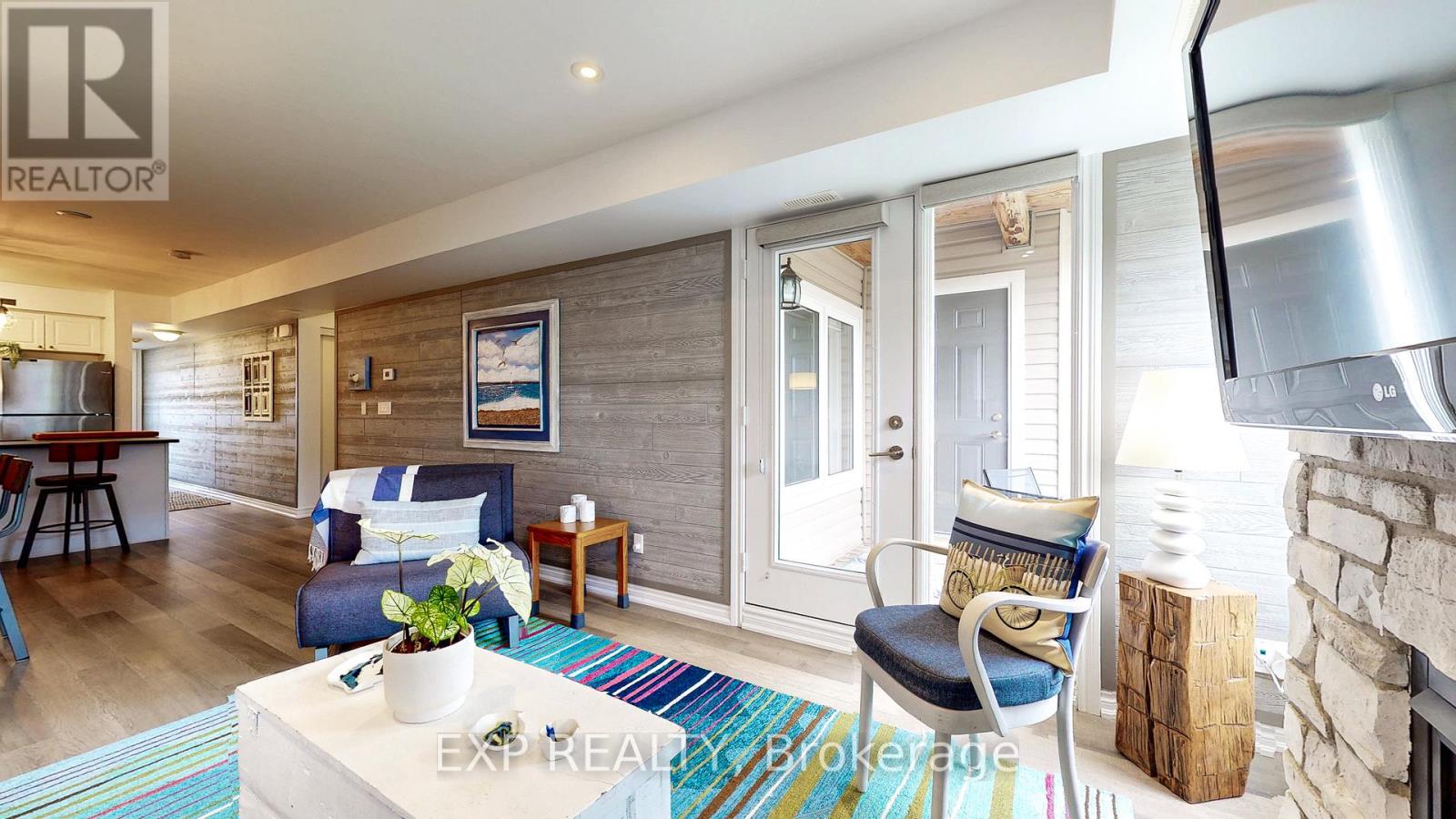 Experience the Georgian Bay lifestyle in the highly sought-after waterfront community of Wyldewood Cove in Collingwood. This bright, extensively upgraded 2-bedroom condo offers 1,081 sq ft of easy, low-maintenance living and one of the largest two-bedroom layouts in the building. With quality finishes throughout, the home features polished concrete countertops, smooth ceilings with pot lights, upgraded flooring, and a striking natural stone fireplace that anchors the living room. Both bathrooms have been beautifully renovated, featuring an oversized walk-in glass shower in one and a bathtub in the other. Step outside to your private patio with water views, complete with custom sunshades and a retractable screen-perfect for morning coffee or evening relaxation. Enjoy low condo fees, a friendly and welcoming community, and excellent amenities, including an outdoor pool, on-site gym, and shoreline storage for kayaks or paddle boards - ideal for sunset paddles. Just minutes from downtown Collingwood and Blue Mountain, this condo is ideal for downsizers, weekenders, or anyone seeking carefree waterfront living. With two exclusive parking spots and a like-new feel throughout, this is a must-see to truly appreciate. (id:4555)
