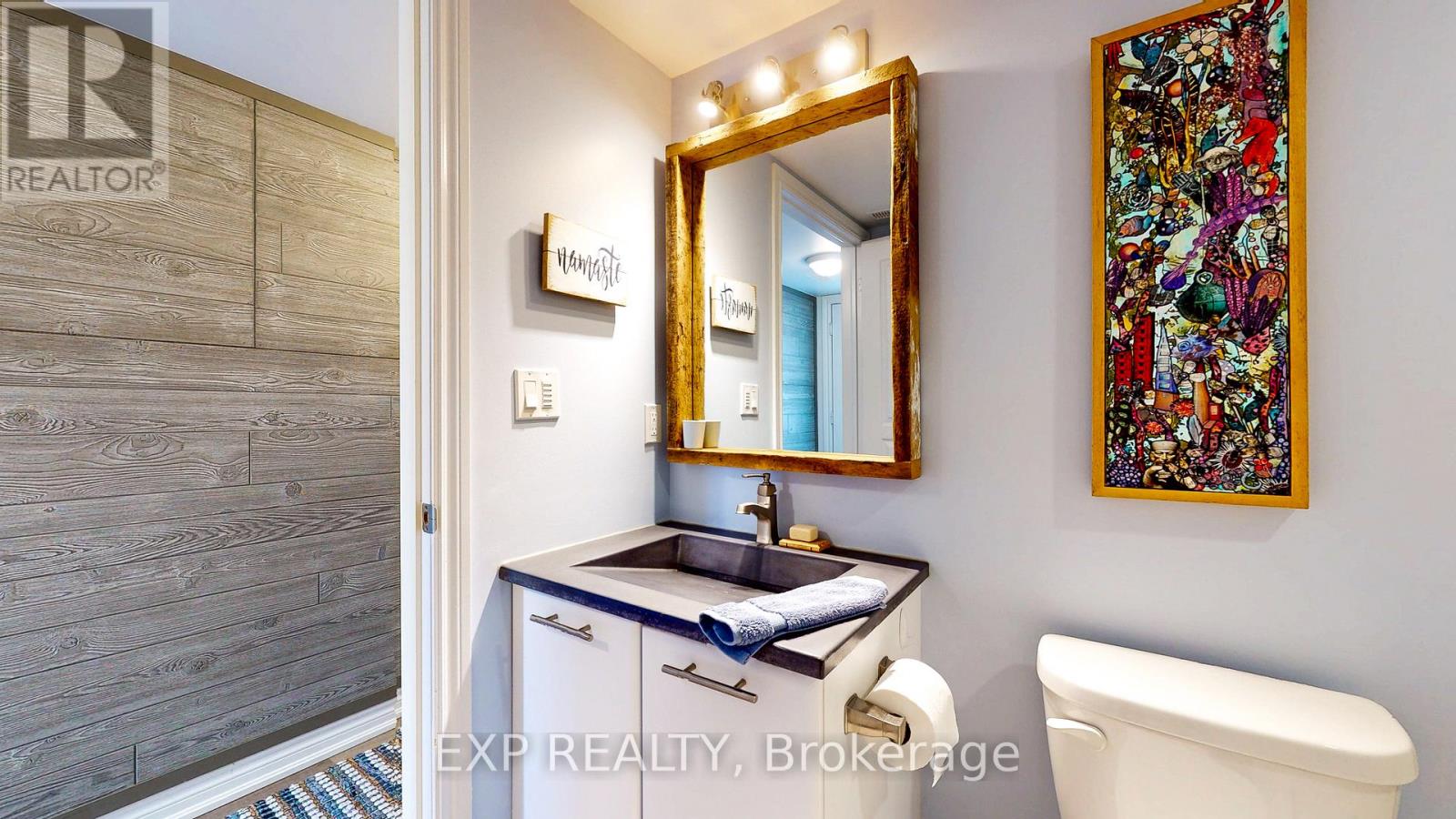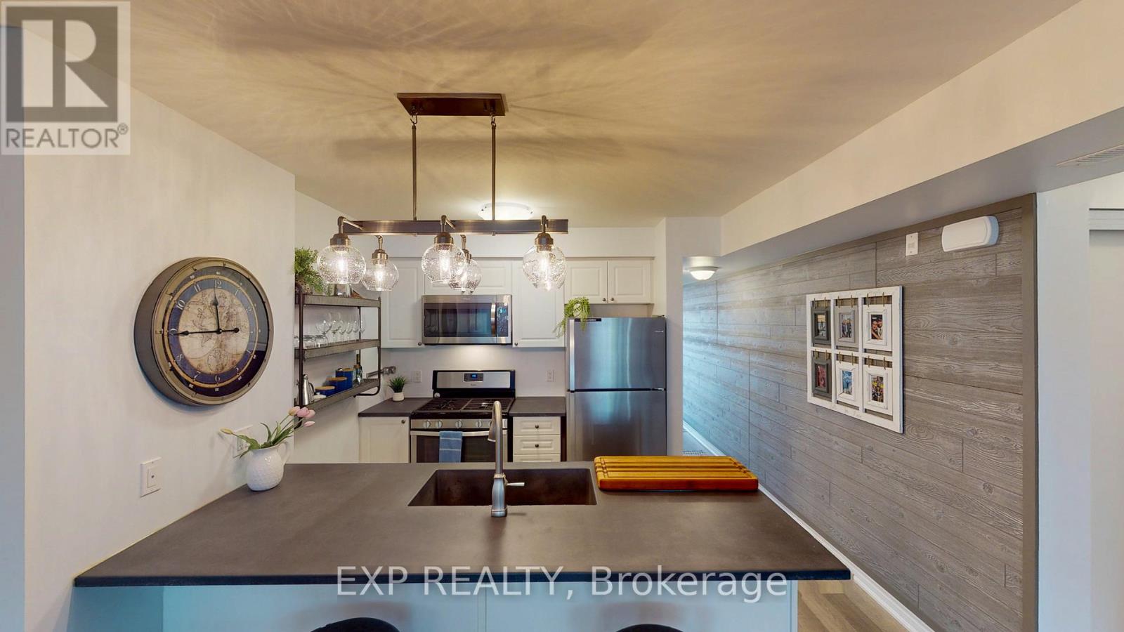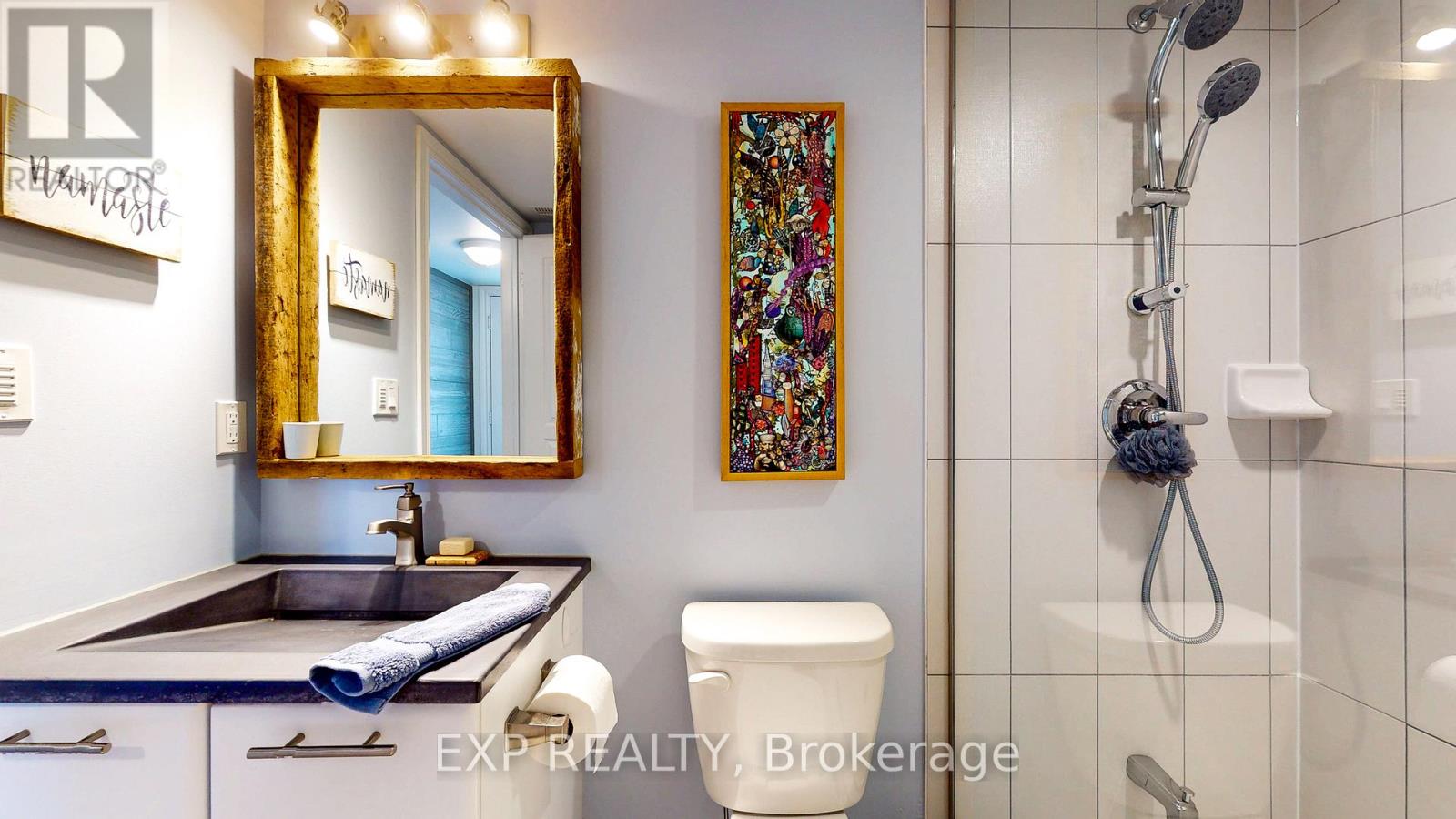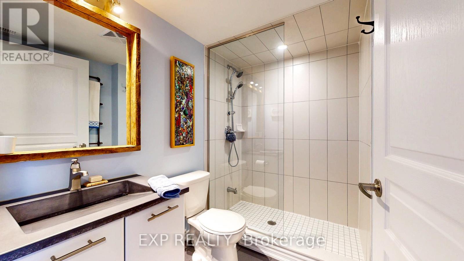 Experience the Georgian Bay lifestyle in the highly sought-after waterfront community of Wyldewood Cove in Collingwood. This bright, extensively upgraded 2-bedroom condo offers 1,081 sq ft of easy, low-maintenance living and one of the largest two-bedroom layouts in the building. With quality finishes throughout, the home features polished concrete countertops, smooth ceilings with pot lights, upgraded flooring, and a striking natural stone fireplace that anchors the living room. Both bathrooms have been beautifully renovated, featuring an oversized walk-in glass shower in one and a bathtub in the other. Step outside to your private patio with water views, complete with custom sunshades and a retractable screen-perfect for morning coffee or evening relaxation. Enjoy low condo fees, a friendly and welcoming community, and excellent amenities, including an outdoor pool, on-site gym, and shoreline storage for kayaks or paddle boards - ideal for sunset paddles. Just minutes from downtown Collingwood and Blue Mountain, this condo is ideal for downsizers, weekenders, or anyone seeking carefree waterfront living. With two exclusive parking spots and a like-new feel throughout, this is a must-see to truly appreciate. (id:4555)