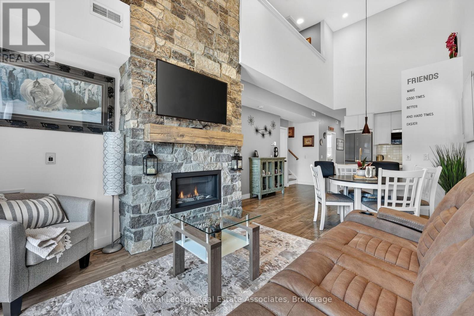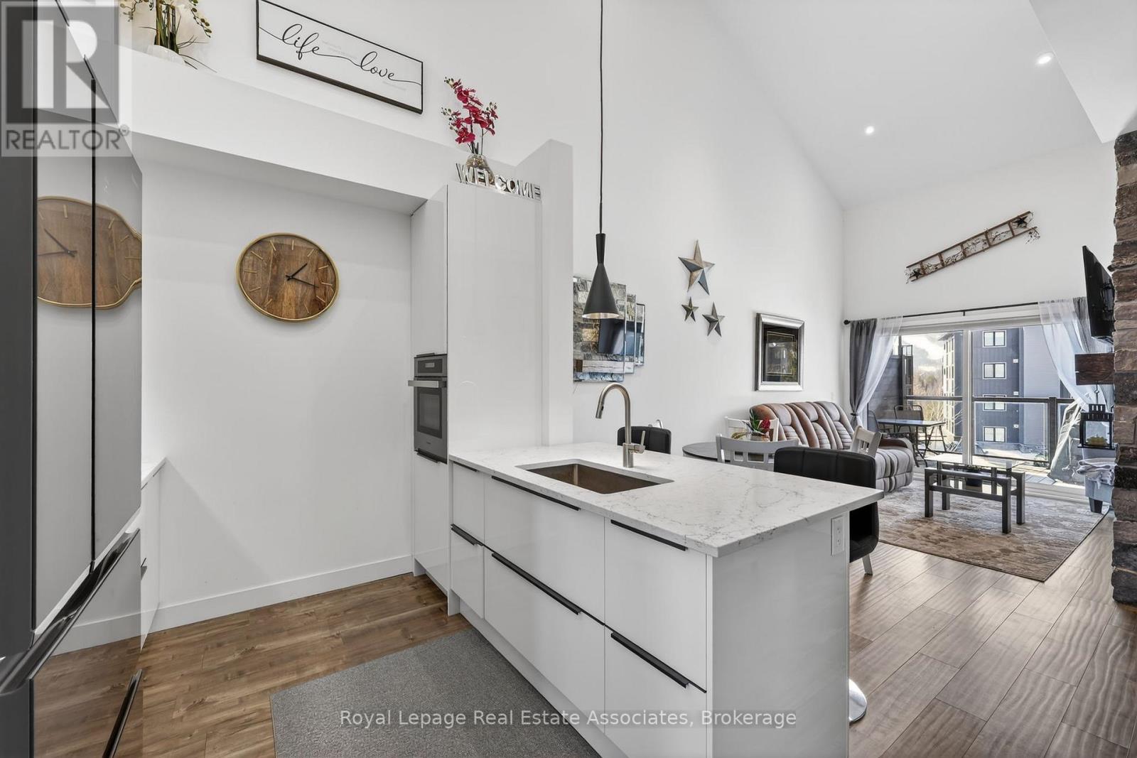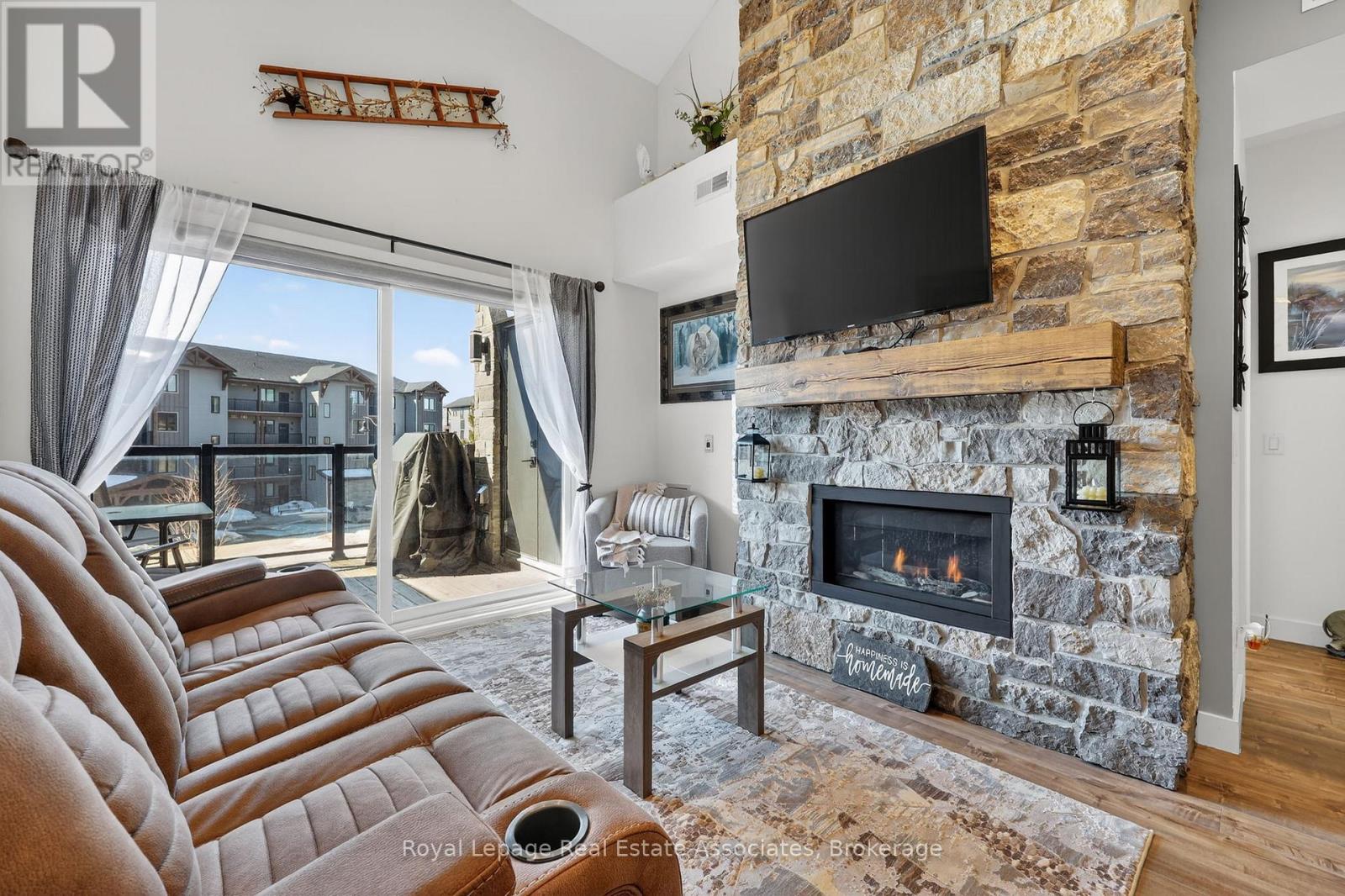 Four-Season Living at Its Finest in Mountain House. Welcome to this beautifully maintained, top-floor loft condo in one of Blue Mountain's most desirable communities. Freshly painted, this turnkey 3-bedroom, 2-bathroom retreat is ready for enjoyment - simply arrive and start living the lifestyle.The bright, open-concept layout is highlighted by soaring vaulted ceilings, expansive windows, and a warm gas fireplace that creates an inviting space to relax after a day outdoors. The modern kitchen features built-in appliances and flows seamlessly into the living and dining areas, while stylish laminate flooring adds a clean, contemporary feel throughout. Step outside to your private balcony and take in partial escarpment views - the perfect spot for morning coffee or evening unwinding.Designed with adventure in mind, the unit includes convenient ski and snowboard storage at the entrance plus the rare bonus of two exclusive-use parking spaces, a standout feature within Mountain House.Enjoy resort-style amenities just steps from your door, including a year-round heated outdoor pool and hot tub, fitness centre with yoga studio, and a welcoming après-ski lounge with gas fireplace. Ideally located along the trail system with easy access to Blue Mountain Village, private and public ski clubs, golf courses, Scandinave Spa, beaches, and downtown Collingwood.Whether you're searching for a weekend escape, full-time lifestyle property, or income-generating investment, this exceptional condo offers comfort, convenience, and year-round appeal. (id:4555)