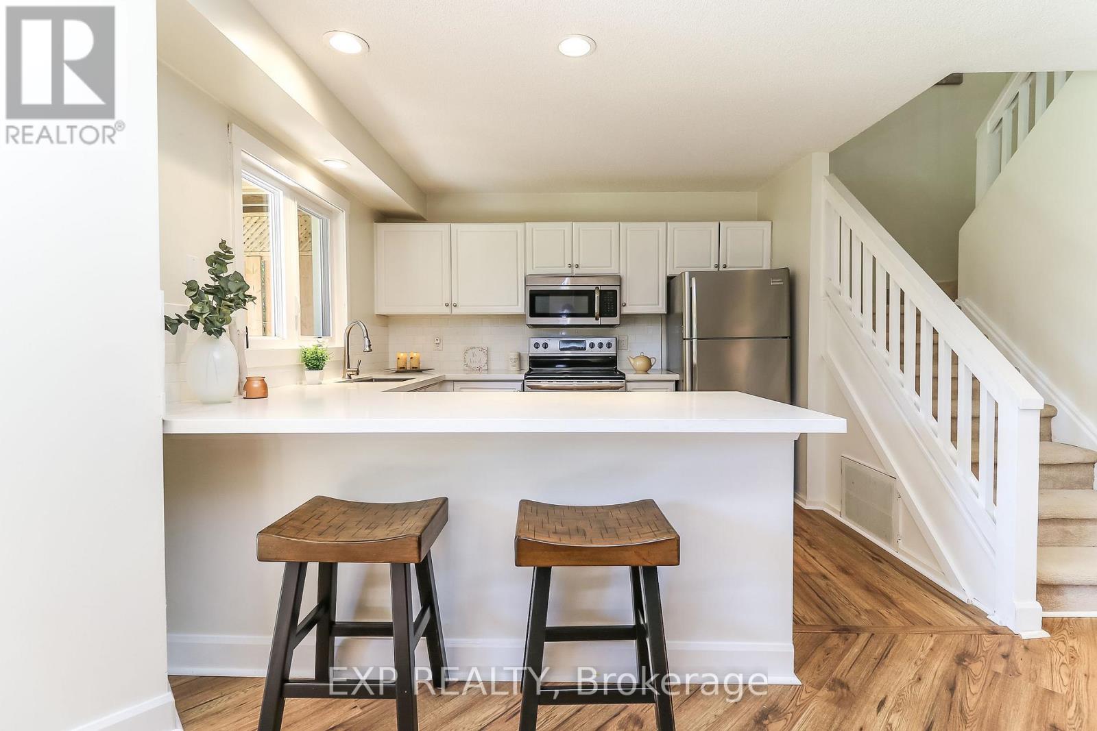 LOCATION! LOCATION! LOCATION! Beautiful corner townhouse backing directly onto Cranberry Golf Course with stunning mountain views from a spacious upper balcony. Located in one of Collingwood's most desirable communities, this home offers the perfect blend of comfort, style, and year-round lifestyle. The main floor features a bright open-concept living and dining area with a custom gas fireplace that creates a warm atmosphere while helping keep energy costs low. The renovated kitchen impresses with an oversized quartz island, stylish backsplash, generous cabinetry, and stainless steel appliances. A walkout leads to a private patio with BBQ area surrounded by mature trees-perfect for relaxing or entertaining. Upstairs, the primary suite offers abundant natural light, a walk-in closet, elegant en-suite, and direct balcony access overlooking the 18th hole. The second bedroom also shares balcony access. Close to trails, downtown Collingwood, Blue Mountain, Cranberry Mews shops, recreation center, and public transit right on Dawson Drive (id:4555)