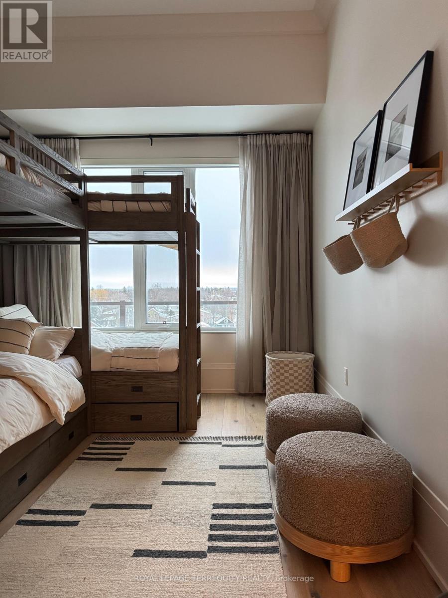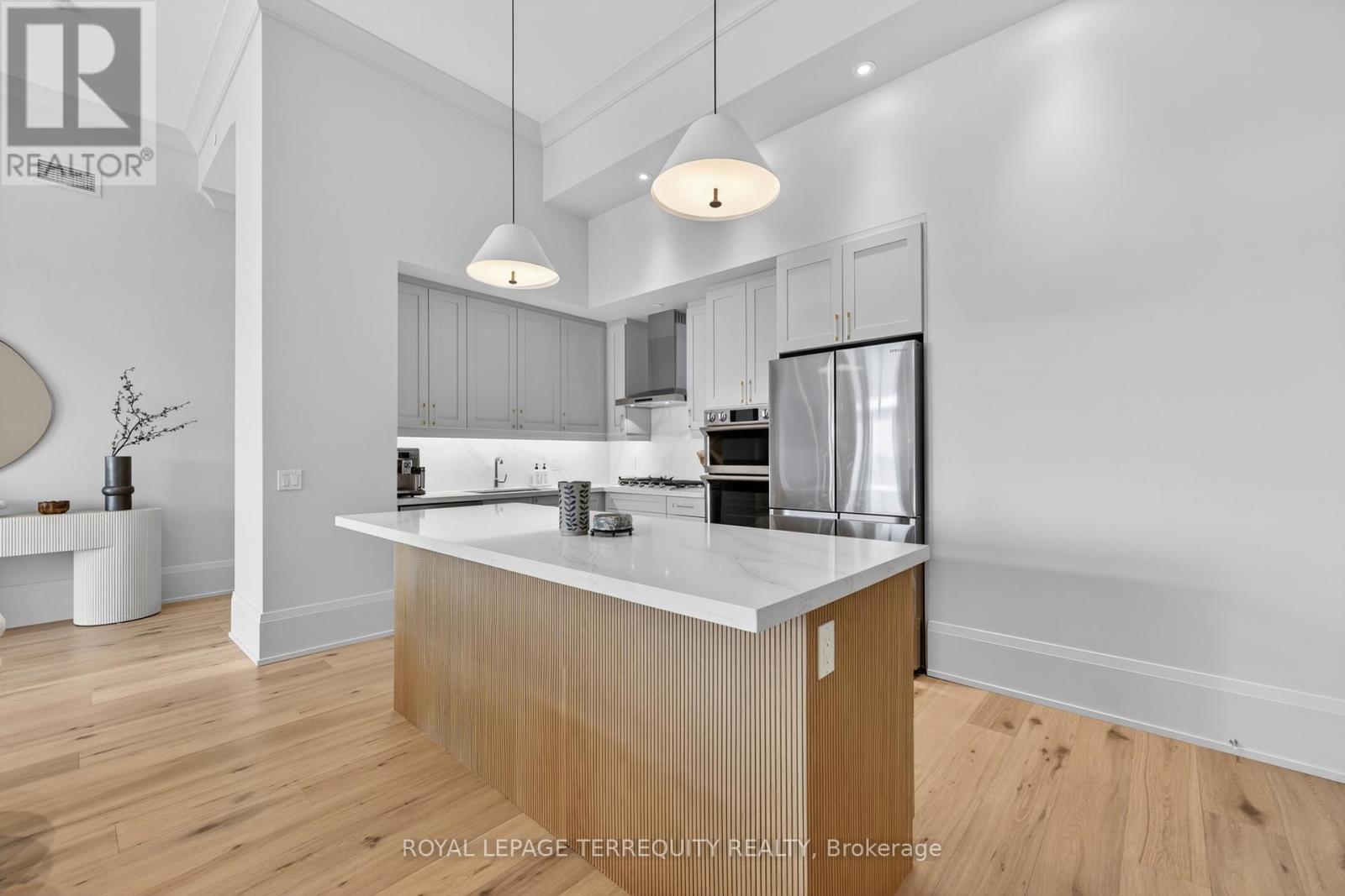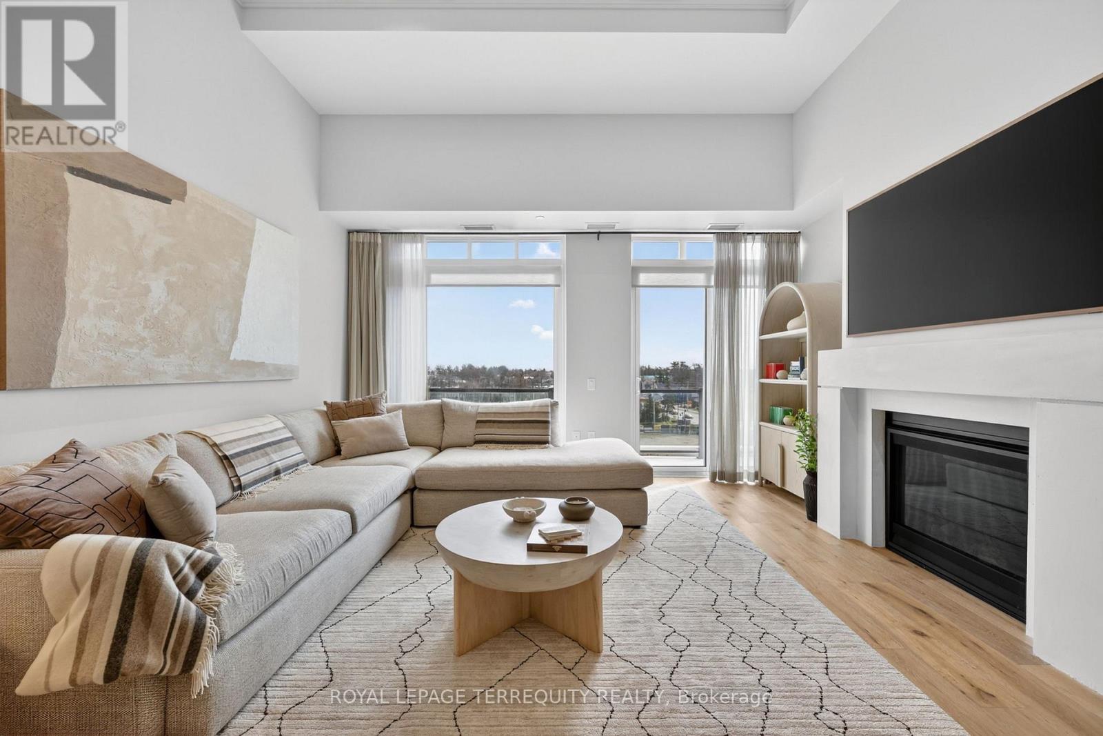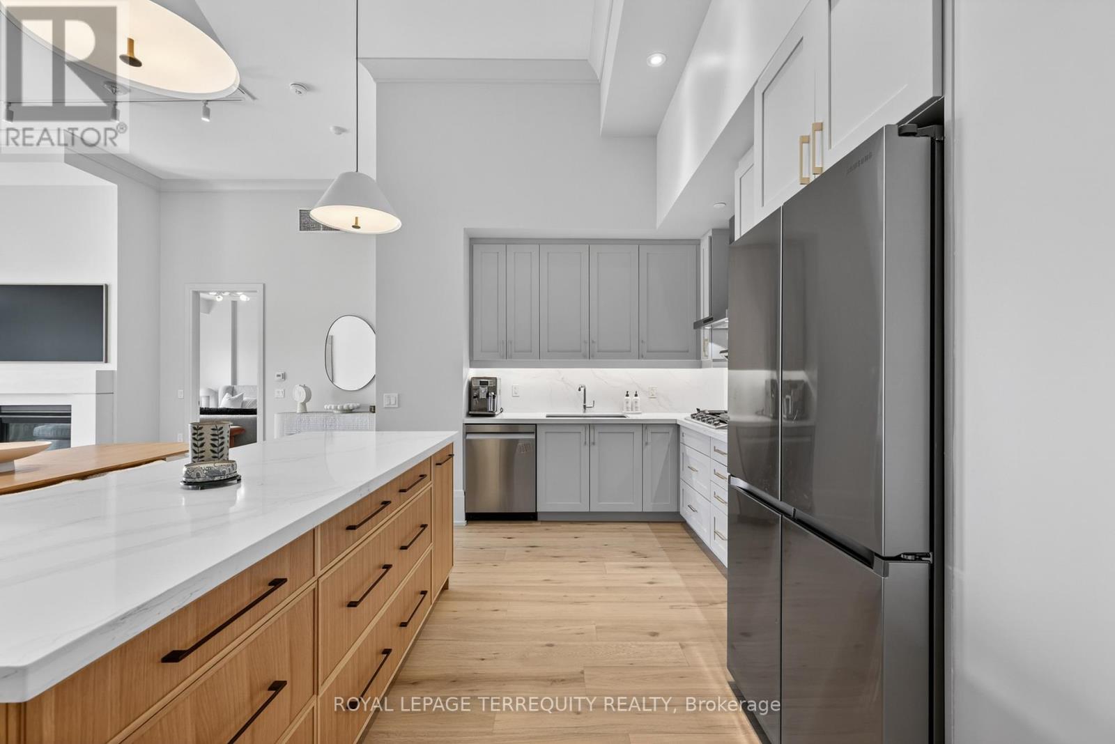 Welcome to Penthouse 615 at Monaco - a landmark of sophisticated living in historic downtown Collingwood! Experience elevated living in this Architectural Digest-inspired penthouse, thoughtfully designed for the most discerning buyer. Spanning 1,545sf., this exceptional 2+1 bed, 2 bath, residence offers a bright, expansive layout with breathtaking panoramic views of the Niagara Escarpment, Blue Mountain, & Georgian Bay. Perched above the heart of Collingwood, this brand-new, never-lived-in suite blends luxury, comfort, and a true 4-season lifestyle. Step inside to soaring 13 ft ceilings, rich hardwood flooring throughout, and upgraded solid-core 8 ft doors that create an immediate sense of grandeur. The open-concept living and dining area is anchored by a cozy gas fireplace and framed by oversized windows, seamlessly extending to a spectacular west-facing over sized terrace with a gas BBQ hookup - perfect for entertaining or enjoying sunsets. The designer kitchen is a showpiece, featuring upgraded cabinetry, premium s/s appliances, a gas stove, stone countertops, & b/splash. Over $120,000 in upgrades include crown molding, pot lights, custom window treatments, designer lighting, dimmers, & refined hardware throughout. Retreat to the primary suite with a spacious walk-in closet and spa-inspired ensuite featuring a freestanding soaker tub, glass-enclosed shower, & elegant finishes. The 2nd bedroom boasts a double closet along with large windows. The den offers the perfect backdrop for your WFH needs or third bedroom. Includes two underground parking spots & a large storage locker. Monaco offers virtual concierge, spectacular lounge, state of art fitness centre, party room, & stunning rooftop terrace. Steps to Collingwood's vibrant downtown with shops, dining, cafés, theatres, farmers' markets, waterfront promenade and marina. Enjoy a 4-season lifestyle: skiing, snowshoeing and trails in winter; boating, hiking, golf and beaches in summer - all of this just mins away! (id:4555)