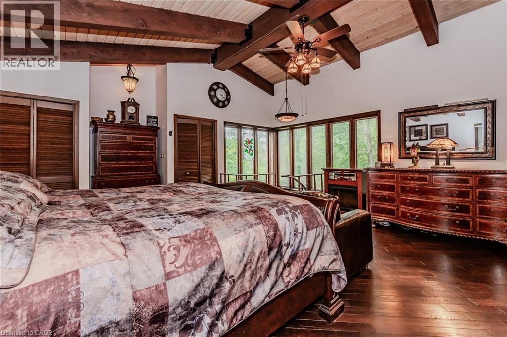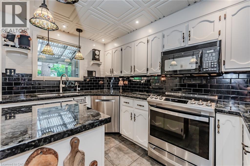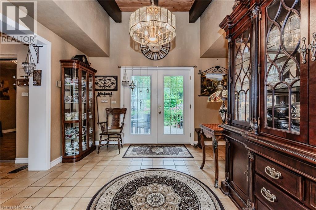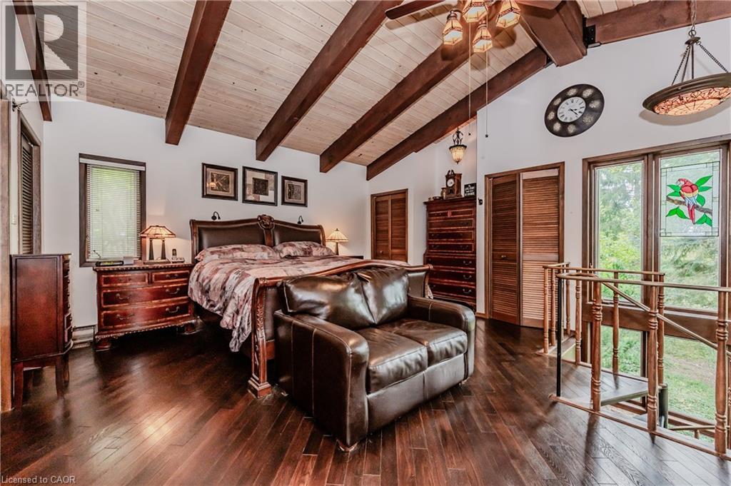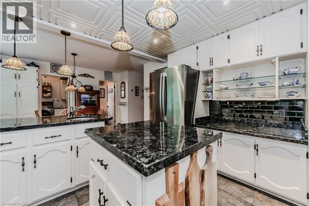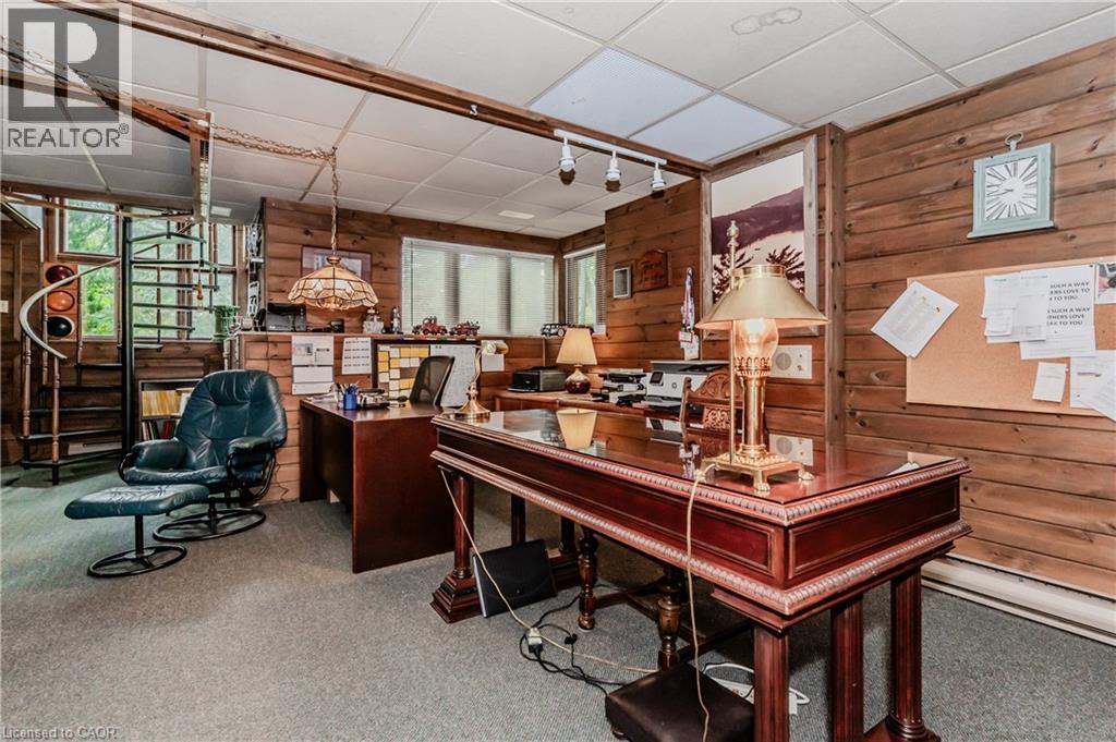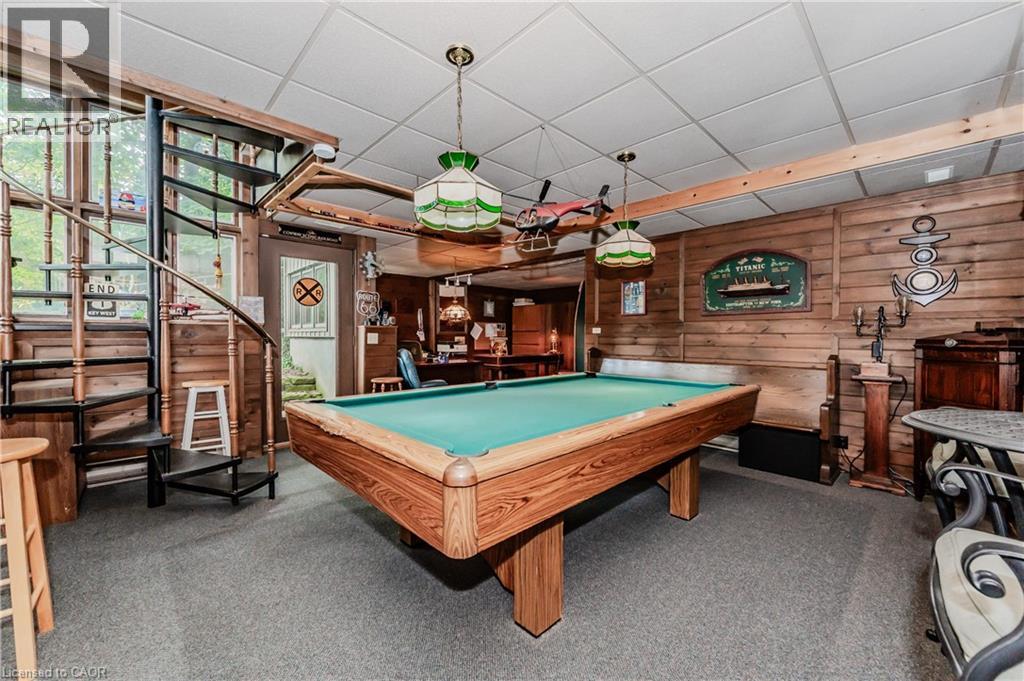 RARE FIND! Located on a stunning 1.11 acre property, this UNIQUE home offers a postcard setting of singing pines, flowering trees, ponds, streams, an inviting inground pool and beautiful gardens. Step into the spacious foyer and to the left you'll find the serene primary suite addition (1983) featuring sloped ceilings, generous closet space, a spa-like ensuite, and a dramatic SPIRAL staircase framed by windows that leads to the finished basement. The warm and welcoming kitchen is the room where your family will head for when they come home. The black granite counters contrast nicely with the white cabinetry, and there's lots of room for multiple people to cook with 2 sinks and a large island—perfect for casual family gatherings. Off the kitchen is a convenient powder room and laundry area. Enjoy garden views from the elegant formal dining room. A few steps up brings you to the large living room with cathedral ceilings and a cozy wood-burning fireplace—ideal for ENTERTAINING. From here, step into the enclosed, wrap-around sunroom deck that overlooks the magnificent yard. Travel up one more level to find three very spacious bedrooms and a full bath. The movie and sports crowd will love to relax in the lower-level family room with a wood stove, large windows, french doors to the patio and pool, and an adjacent full bathroom. The basement offers endless possibilities with space for a games room, home gym, hobbies, and ample storage. A BONUS feature is the huge workshop with its own exterior entrance—great for hobbyists or home-based projects. With FIVE finished levels, this home is ideal for large or MULTI-GENERATIONAL families. You'll love the beautiful architectural details that balance form and function. MAGNIFICENT SUNSETS! (id:4555)