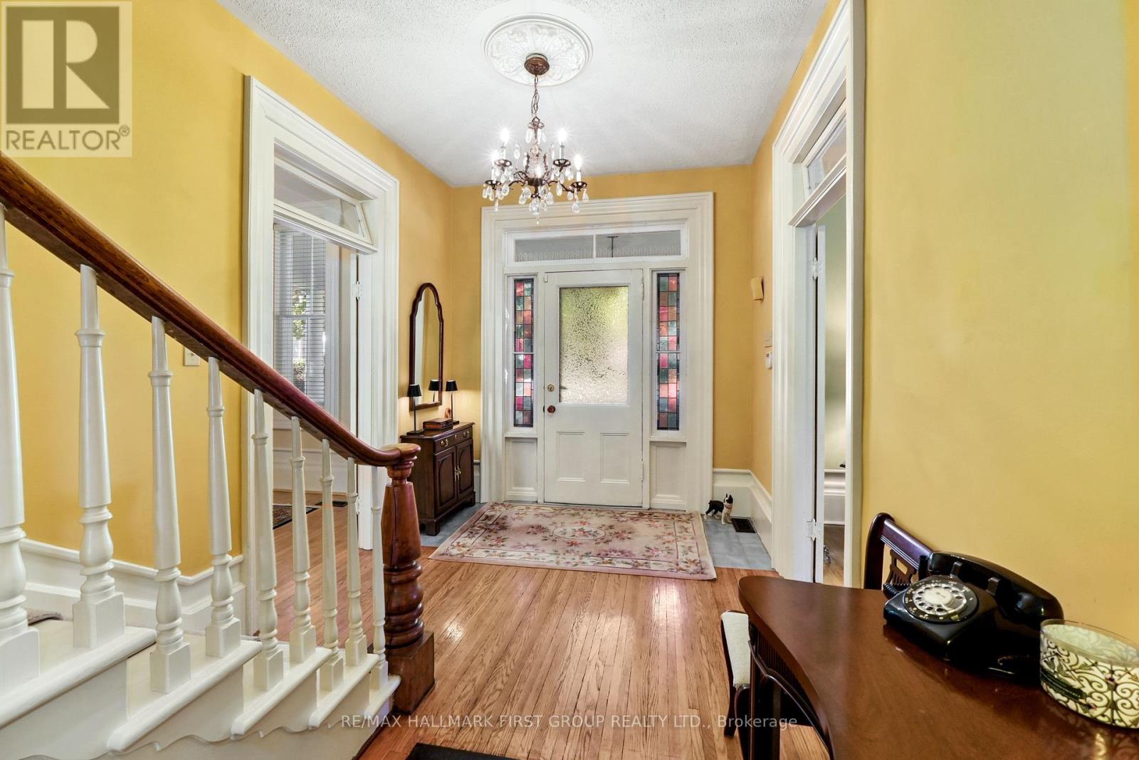 This character-filled two-storey red brick century home, circa 1860s, blends historic charm with generous living space and modern convenience. A covered front veranda, surrounded by meticulously maintained perennial gardens, sets the tone for the timeless elegance found throughout. Inside, the main floor showcases period details including extra-wide baseboards, detailed crown mouldings, and decorative ceiling coins. The sunlit front living room with fireplace flows seamlessly into the spacious formal dining room. A thoughtfully designed kitchen features a central island with pendant lighting and a vintage-inspired cooktop and oven, opening into an informal dining area. A bright family room with a walkout and bar area provides the perfect space for entertaining, complemented by a guest bathroom on this level. The upper floor is anchored by the primary suite, which features an en-suite bathroom and a walkout to a private balcony. Three additional bedrooms, a full bathroom with a separate tub and shower, plus a double vanity, and a cozy den or reading nook complete the layout. The lower level offers ample storage and a separate walkout to the backyard. Outdoors, discover a private retreat featuring a fully fenced yard, tranquil pond, screened wood gazebo, and spacious deck, perfect for alfresco dining. A detached four-car garage provides exceptional parking and storage. Located near schools, amenities, and offering easy access to Highway 2 and the 401, this historic gem is the perfect blend of character, comfort, and convenience. (id:4555)