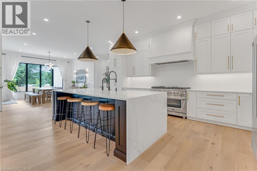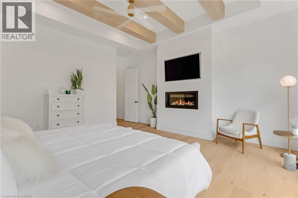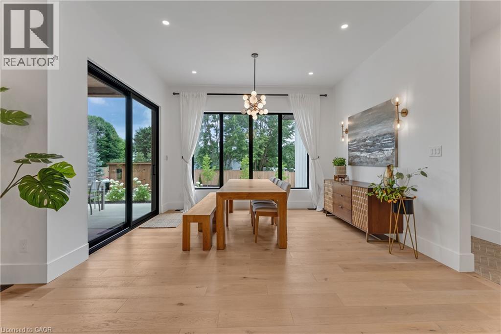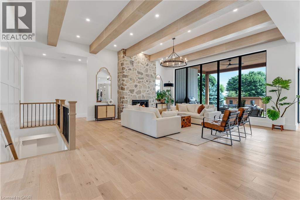 This exceptional custom bungalow, offers nearly 6,000 sq ft of finished living space on a serene country lot under an acre. With 6 bedrooms, 4 bathrooms, and an oversized 3-car garage with parking for 6 more, this home is ideal for large or multigenerational families. Inside, 10' ceilings throughout the main floor and a vaulted 12' great room with a floor-to-ceiling natural stone fireplace create an open, airy feel. White oak engineered hardwood spans both levels, adding warmth and elegance. The chef’s kitchen features a double waterfall island, top-of-the-line appliances, an oversized built-in fridge/freezer, and connects to a stunning walk-through pantry with second fridge, white oak counters, and custom cabinetry. The dining area leads to a covered concrete porch with built in natural stone outdoor BBQ, perfect for entertaining. The primary suite includes white oak beam accents, a gas fireplace, luxurious ensuite, custom walk-in closet, and direct access to the laundry room. A finished basement adds more bedrooms, bathrooms, and versatile space for guests, teens, or recreation. Large windows throughout flood the home with natural light. The backyard has plenty of room to add a pool. Located 12 Minutes to St,Jacobs, 13 Minutes to the Farmers Market, 14 Minutes to Waterloo and 22 Minutes to Kitchener. This is a rare opportunity to enjoy refined country living close to the city. (id:4555)