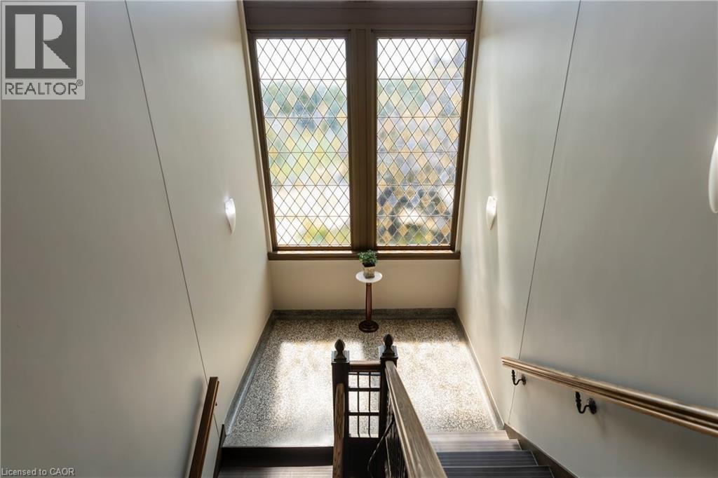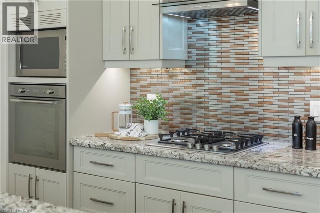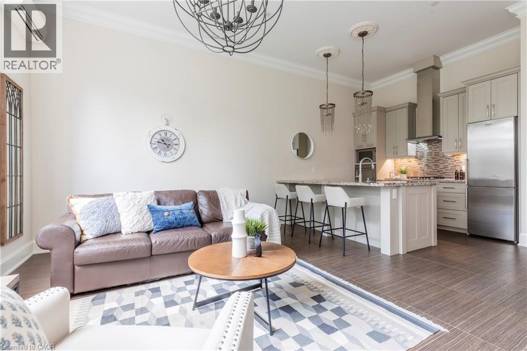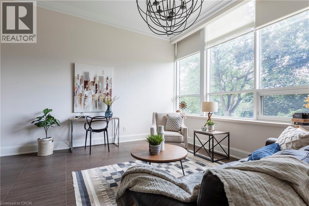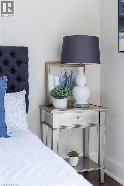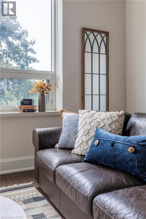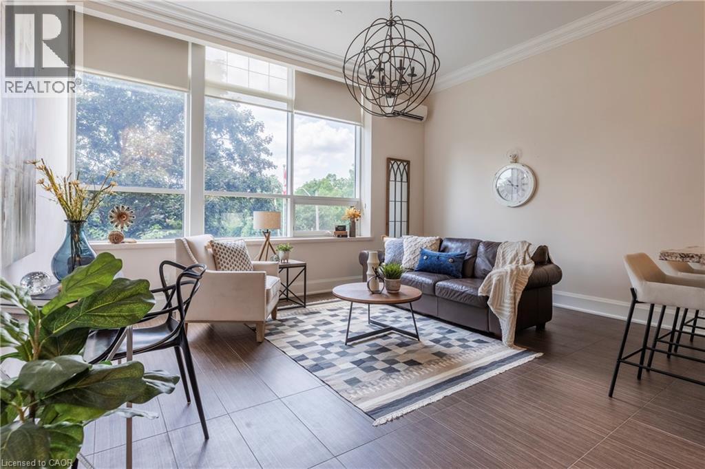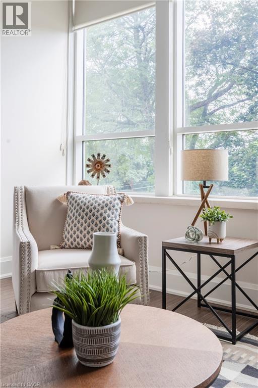 Situated on the West end of Dundas and nestled at the base of the Peak awaits the lifestyle, serenity, & sophistication you've been craving. Seamlessly blending the historical elements of the building with a contemporary & upscale aesthetic, the District Lofts offer a blend of character, charm, & modern convenience. Located in the original part of the building, Unit 207 boasts soaring 12’ ceilings complete with gorgeous crown moulding & upgraded lighting. The south exposure offers exquisite views onto the front gardens & Fisher’s Mill Park, allowing an abundance of natural light through the expansive windows. The open-concept kitchen/living area is at the heart of the unit. The modern fixtures & neutral decor create the perfect canvas to blend your own personal style. With ample cabinetry, granite countertops, stainless steel appliances, contemporary backsplash, & ornate pendant light fixtures, this kitchen is a stunner! The generously sized bedroom with stunning chandelier, a comfortable 4PC bath with soaker tub, & in-suite laundry complete this space. Radiant in-floor heating & two wall-mounted ac units add to the consideration and comfort put into this unit. Also on this level you’ll find the well appointed gym. The upper level offers the rooftop patio, accessible all year long. All this conveniently located just a short drive from West Hamilton & McMaster University. Embrace the ease of condo living in this spectacular one-of-a-kind property. Room sizes/sq ft approx. (id:4555)