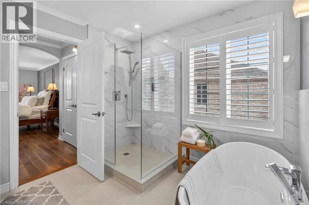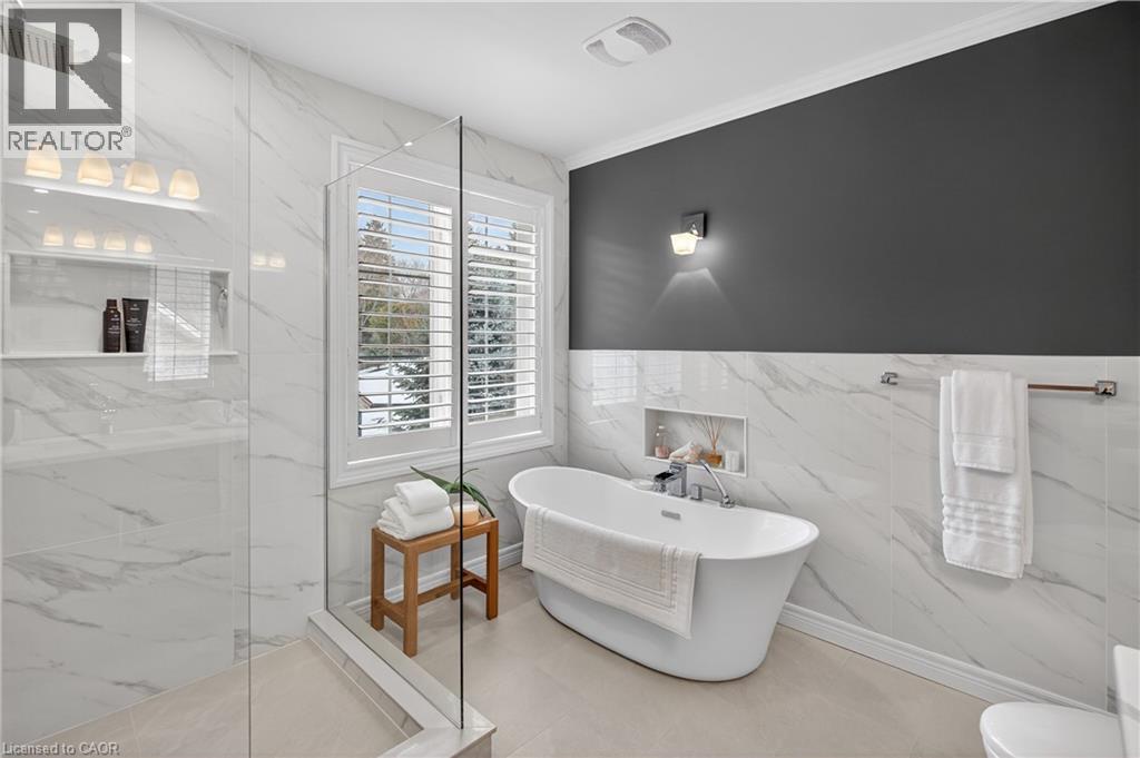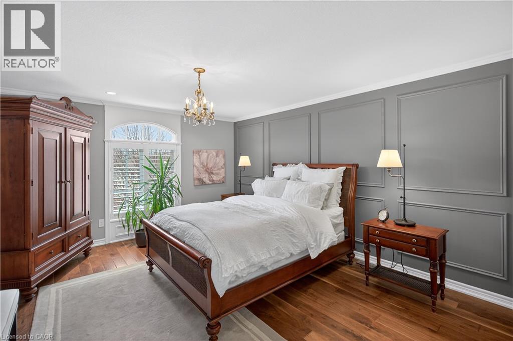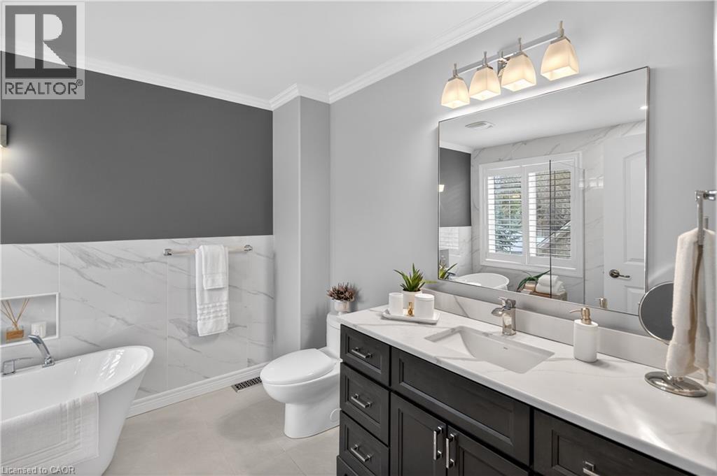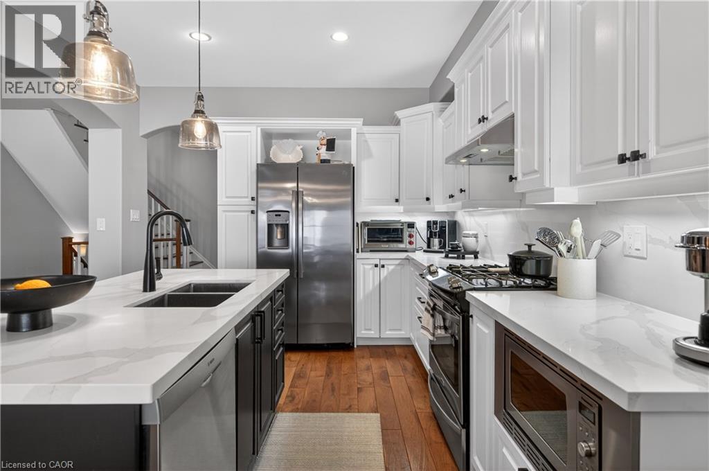 Set within one of Dundas’ most exclusive enclaves in Pleasant Valley, this executive residence offers an uncompromising blend of craftsmanship, privacy, & refined living. Positioned at the rear of the complex - highly desirable for its privacy - this home makes an immediate impression w/ its striking façade, blending stone, brick, a distinctive bell-shaped roof-line & tasteful shutters. The 2-car grg w/ inside entry, surfaced parking for 2 & bonus visitor parking ensure convenience. Main lvl feat incl a spacious foyer, an elegant kitchen w/ white cabinetry w/ crown detail, quartz, S/S app & a centre island w/ breakfast bar seating for 3+, a convenient dinette area, liv rm w/ vaulted ceilings, 2 skylights & a cozy gas FP, a formal din rm providing the perfect backdrop for family dinners & special occasions, main lvl laundry facilities & a well-appointed powder room. Ascending the piano-style wood staircase to the 2nd level, the loft - currently used as a home office - overlooks the liv rm below. The primary retreat feat exquisite wall moulding, 2 storage closets, & a spa-inspired 4-pc ensuite w/ an oversized glass shower, soaker tub, & vanity. The 2nd bdrm enjoys its own private 3-pc ensuite w/ an oversized glass shower. The f-fin bsmt offers a spacious rec rm w/ a corner gas FP, a bonus flex space, a 2-pc bath, & multiple storage/utility areas. The rear yard is designed for exceptional outdoor living, feat an oversized composite deck w/ a patio cover for protection from the elements, a separate terrace area, & picturesque scenic views in every direction. Living in Pleasant Valley means enjoying Dundas’ natural beauty, scenic conservation areas, & walking trails, while being minutes to the charming downtown core filled w/ boutique shops, cafés, restaurants, & community events. Opportunities in this sought-after enclave are rare - an exceptional home in an extraordinary setting. (id:4555)