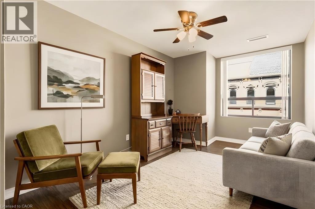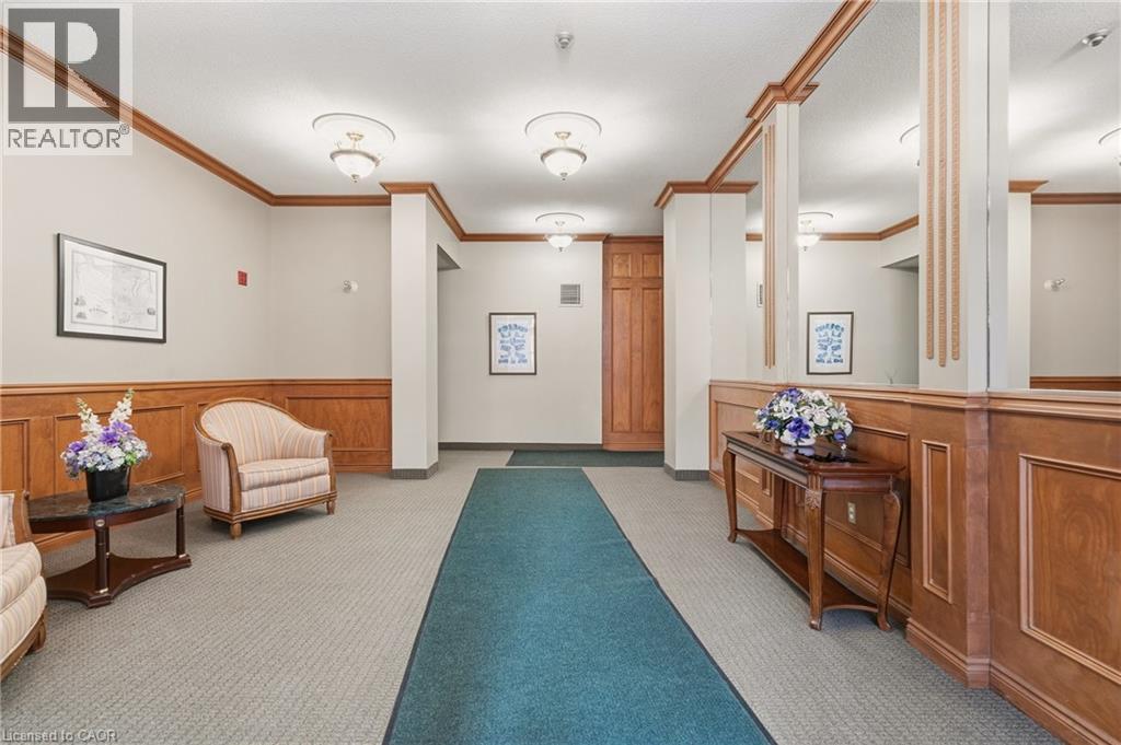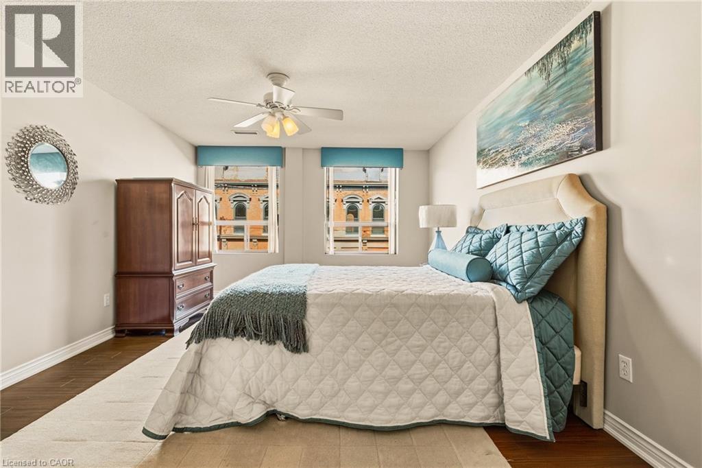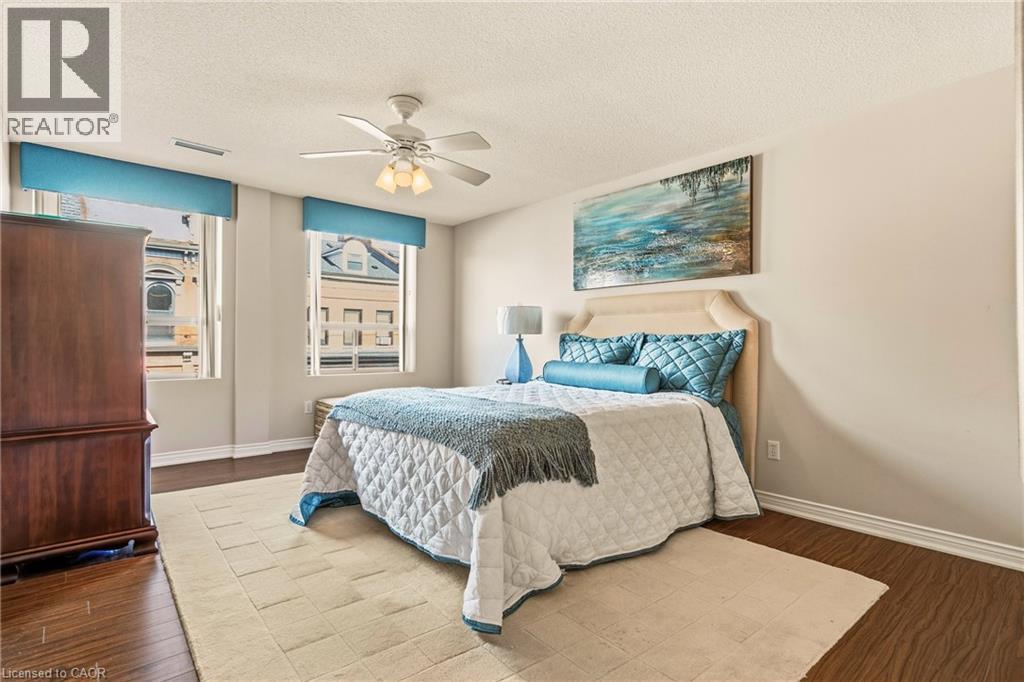 Tucked into the vibrant core of Dundas, Grafton Square Condominium offers an exceptional blend of boutique living and everyday convenience. This impeccably maintained, quiet 21-unit building is just steps from charming shops, cafés, restaurants, the Dundas Art Gallery, grocery store, and library—putting the best of the community right at your doorstep. This bright and inviting 1,174 sq. ft. corner suite is filled with natural light thanks to expansive windows throughout. Thoughtfully designed, it features 2 spacious bedrooms, 2 full bathrooms, in-suite laundry, and a private balcony for relaxed outdoor enjoyment. The open-concept living and dining areas create an ideal setting for both entertaining and comfortable day-to-day living, while the eat-in kitchen, complete with warm wood cabinetry, offers a welcoming space for casual meals. The generous primary bedroom includes its own ensuite with his and hers closets, complemented by a well-sized second bedroom perfect for guests or a home office. Residents also enjoy access to a party room, guest suite, exclusive storage locker, and underground parking with a convenient car wash bay. Just a short stroll away, Dundas Driving Park provides a beautiful natural escape—perfect for walking, unwinding, or enjoying a game of lawn bowling. This is a rare opportunity to experience low-maintenance living in one of Dundas’ most sought-after locations. (id:4555)