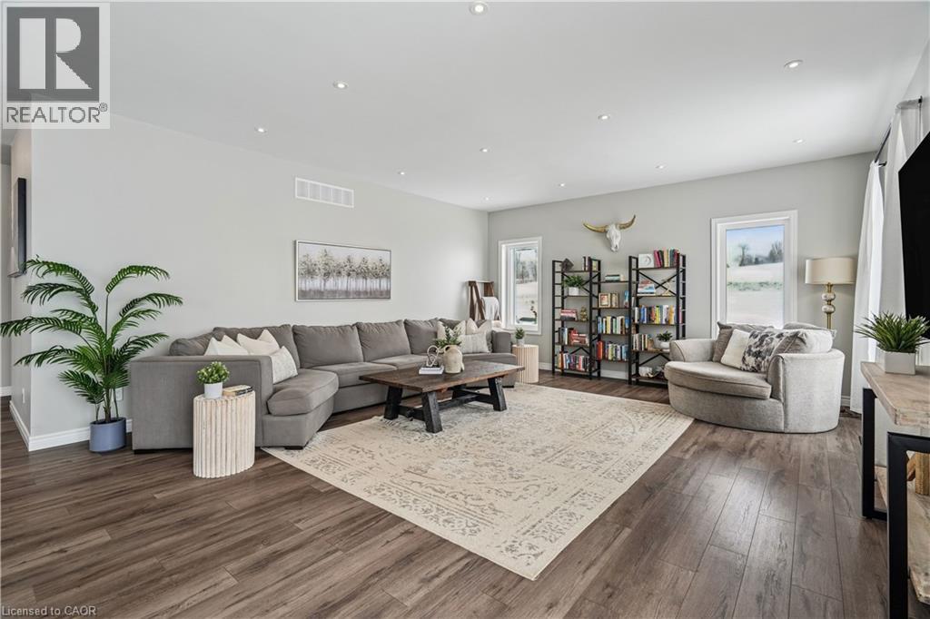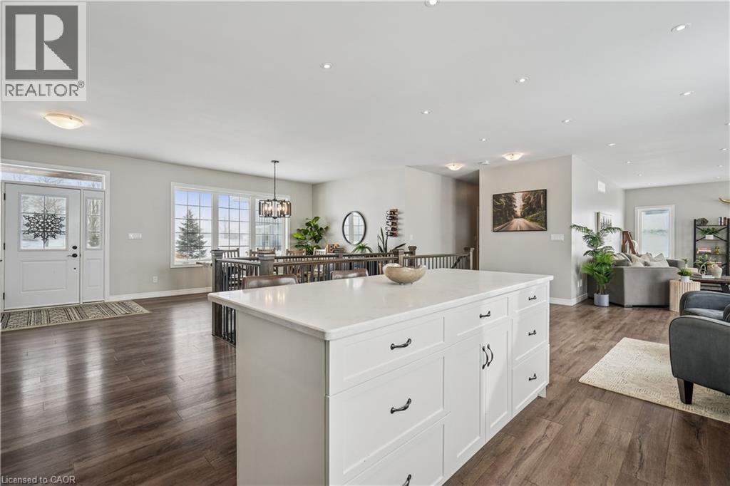 Welcome to 151116 12th Line. Set on 2.06 acres in East Garafraxa, this bungalow blends refined finishes with everyday functionality. A long circular driveway and three-car garage with direct access create a strong first impression while providing ample parking for family gatherings and guests. Inside, the open-concept main floor is filled with natural light and finished with durable vinyl flooring throughout, making it both stylish and family-friendly. The front dining room features large windows, while the chef-inspired kitchen anchors the home with quartz countertops, a centre island, farmhouse sink, stainless steel appliances, extended cabinetry, pantry storage, pot lights, and a window overlooking the backyard. The adjacent living room offers a warm, inviting atmosphere with pot lighting, expansive windows, and French doors leading to the deck, perfect for seamless indoor-outdoor living. The primary bedroom is a private retreat featuring a walk-in closet, and a spa-like five-piece ensuite with heated floors, ideal for unwinding at the end of the day. Two additional main-floor bedrooms include double closets and oversized windows, while a full four-piece bathroom, powder room, and main-floor laundry add everyday convenience. The partially finished walk-out basement extends the home’s versatility with nine-foot ceilings, a fourth bedroom with walk-in closet, and a modern three-piece bathroom. With generous unfinished space, this level offers endless potential for a home office, gym, recreation area, or future in-law suite. Walk-out access leads directly to the backyard. Outside, the property truly shines. The backyard is a private resort, featuring a heated saltwater inground pool installed in 2021. The pool pavilion creates the perfect setting for summer entertaining and late-night gatherings. This home delivers modern comfort without sacrificing rural tranquility. This is more than a house. It is a lifestyle designed for families ready to settle in and stay. (id:4555)