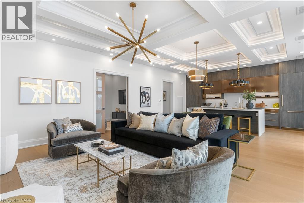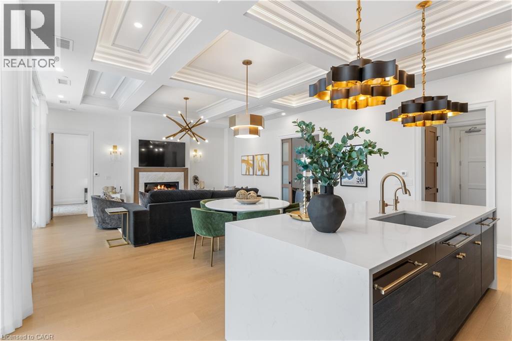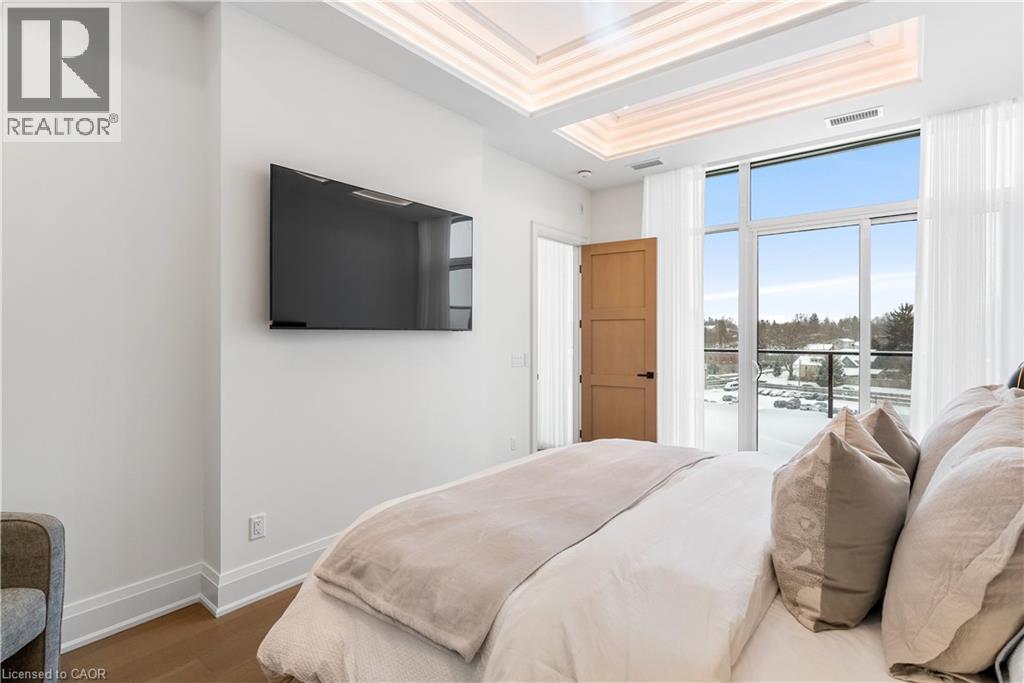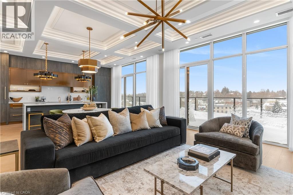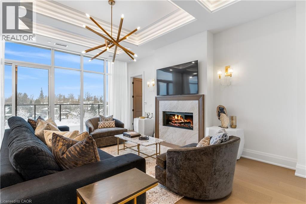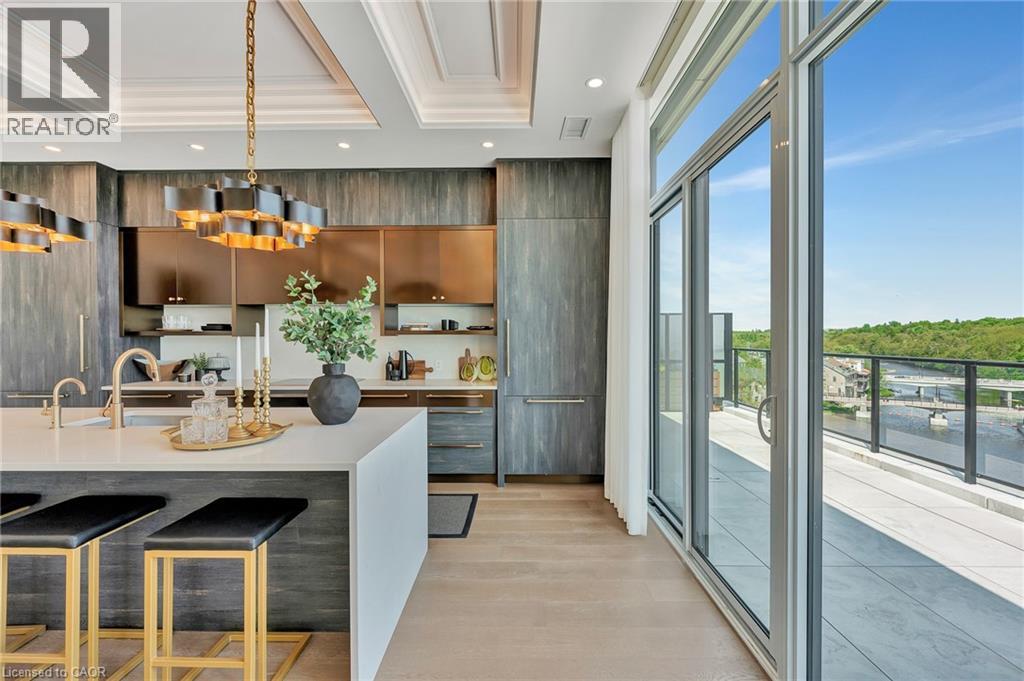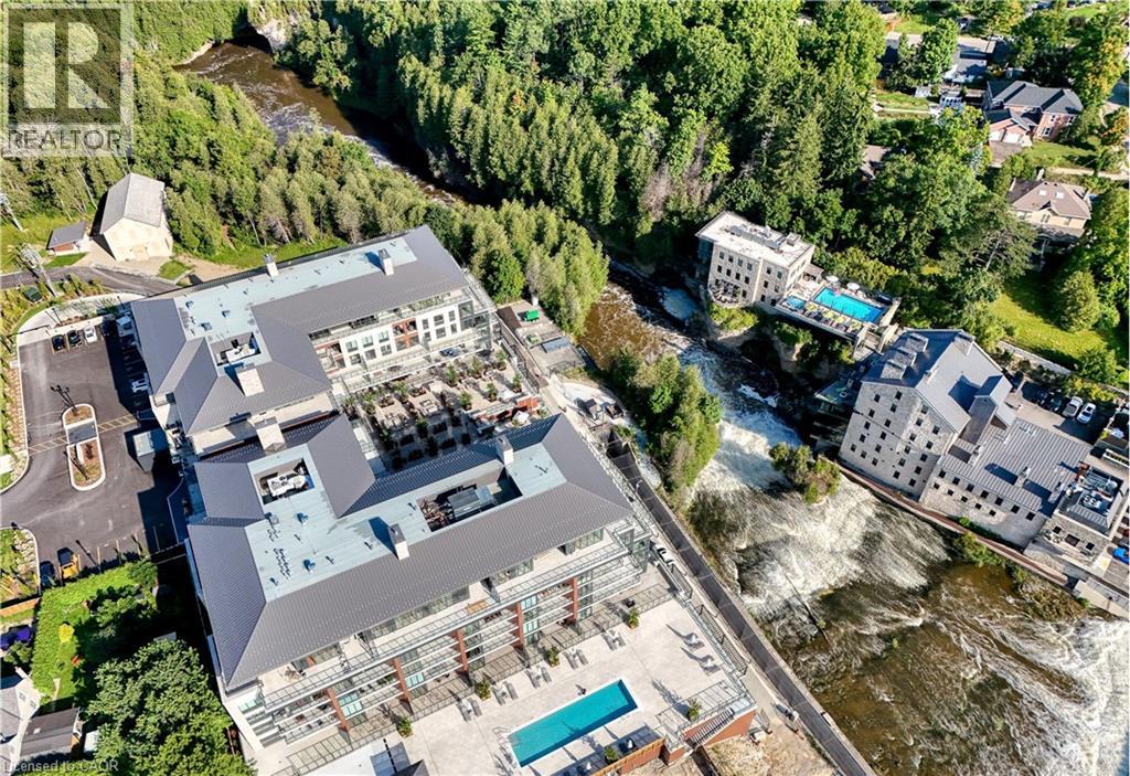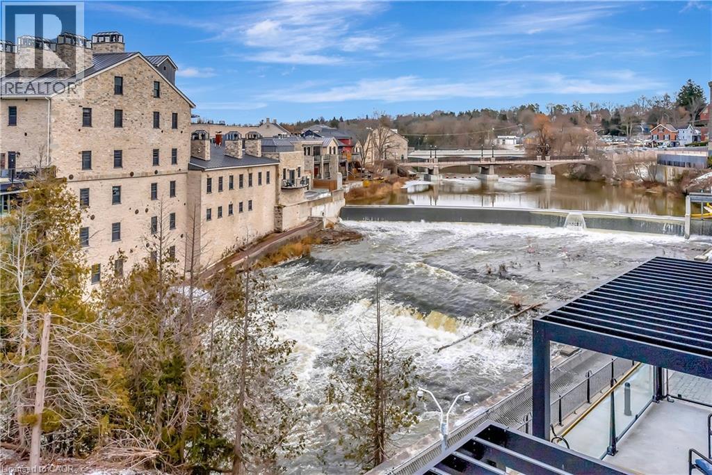 Experience elevated living at its finest in The Mill Penthouse! Set within the coveted Elora Mill Residences, this penthouse redefines luxury with soaring 10-foot ceilings, designer lighting, and curated finishes throughout. A gas fireplace adds warmth and sophistication to the open-concept living space, while the expansive private terrace, boasting over 650 sq. ft., offers a built-in gas line perfect for a custom outdoor kitchen, grill, or fireplace. Glass railings reveal panoramic, unobstructed views of the Elora River and its iconic bridges, with four separate walkouts creating seamless indoor-outdoor living. At the heart of the home, the chef-inspired kitchen impresses with a grand island with seating, full-height cabinetry, and upgraded Miele appliances. The open living and dining areas provide flexibility to design your perfect entertaining space, while a private den with sliding doors is ideal as a home office, media room, or formal dining area. The primary suite is a tranquil retreat, complete with a custom walk-in closet and a spa-like ensuite featuring a deep soaker tub, oversized glass shower, double vanity, and private water closet. A second bedroom, in its own private wing with a dedicated full bathroom, is perfect for guests or family. Residents enjoy exclusive access to resort-style amenities including a concierge, lobby coffee bar, residents' lounge, formal dining room, outdoor furnished riverfront terrace with firepits, and an outdoor pool with spectacular river views. Just steps from Elora's gourmet restaurants, boutique shops, and charming cafés, you'll enjoy living in this picturesque, walkable community. Complete with fully automated blinds, two parking spaces, and a storage locker, an opportunity to own a penthouse suite at one of Elora's most prestigious and sought-after addresses. (id:4555)