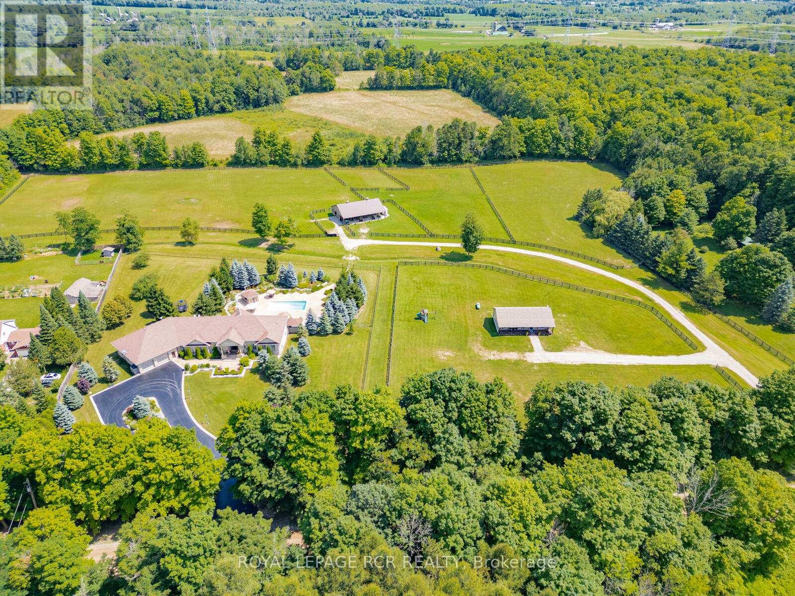 Welcome to this stunning multi-generational country property situated on 44 acres near Acton. Enter the main house through automated electronic front entry gates. Features of the main house include nearly 5000 sq. ft. of luxury living. Maple kitchen w/ granite countertop and backsplash overlooking a large eat-in area with walk-out to large deck overlooking the pool and backyard. Thermador and Miele s/s appliances. Separate and formal open-concept dining room. Open-concept living room w/ cathedral ceiling and wood burning fireplace. Main floor office. Primary bedroom w/ walk-in closet 4 pc ensuite and walk-out to deck overlooking the 18 x 36 heated salt water pool w/ electric pool cover. Main floor laundry and a second laundry in the basement. Huge 9 car attached garage with access to the house and backyard. Fully finished walk-out basement set up as an in-law suite with full kitchen with granite countertop and centre island, large and bright bedroom with 3 pc semi-ensuite bath, , living , dining and games room and tons of storage. Gorgeous backyard with extensive wrought iron fencing. Multiple dining areas. 10 x 10 pool cabana. Approximate 4000 sq. ft. of stone decking with extensive landscaping and stunning gardens. 12 zone, 60 head sprinkler system for front and rear gardens. New roof 2025. 30 x 60 Gara Farm Structures barn with 6 System Fencing stalls, separate tack room and large hay storage area. 5 large oak-board paddocks with room for more and a separate driveway to the barn. Lots of room to add an indoor arena if desired. Updates include new geo-thermal furnace in 2022, new pool pump 2024, new pool heater and chimney 2023, Miele dishwasher 2024, Miele induction stove-top and wine fridge 2023. Generator for the full main house. The secondary dwelling features 3 +2 bedrooms. 2.5 baths, partially finished basement. Main floor laundry. Large eat-in kitchen. Separate septic system and drilled well. Propane furnace & central air conditioning. Built in 2018. (id:4555)