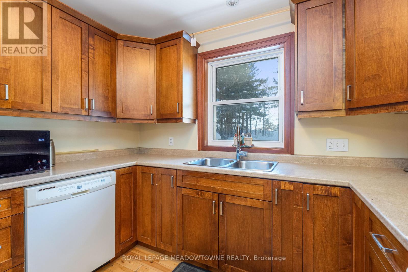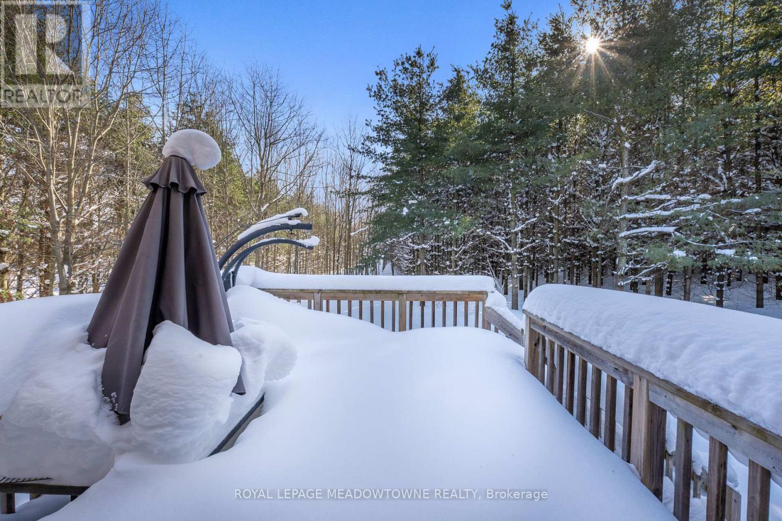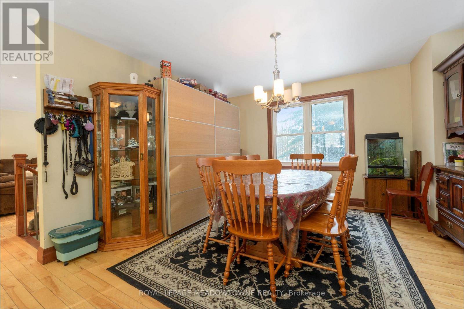Nestled on a private and serene 1+ acre lot surrounded by mature trees, this beautifully maintained 3+1 bedroom, 2 bathroom detached raised bungalow offers the perfect blend of modern comfort and peaceful country living. Built in 2013 and topped with a durable metal roof, this home is set in a quiet rural setting while remaining conveniently close to town amenities.The welcoming foyer opens into a bright, open-concept living room featuring hardwood flooring, pot lights, and a walk-out to the deck. The dining area is seamlessly overlooked by the kitchen, creating an easy flow for gatherings. Hardwood flooring continues throughout, and the kitchen offers ample cabinetry and counter space to meet all your culinary needs.The main level hosts a spacious primary suite complete with a double closet and a private 3-piece ensuite. Two additional bedrooms on this level are generously sized and feature large closets.The finished lower level expands your living space with a massive open-concept recreation room, laminate flooring, two above-grade windows, and a walk-out to the backyard. A convenient fourth bedroom with an above-grade window, ample storage, a mechanical room, and a laundry room with a rough-in for an additional bathroom complete this level.Step outside to a lush, private backyard-perfect for relaxing, entertaining, or enjoying nature. Ideally located just a short drive to all major amenities, including GO stations in both Acton and Georgetown. Additional highlights include a newly added propane forced-air furnace (2024). A fantastic opportunity to enjoy tranquil country living without sacrificing convenience. (id:4555)