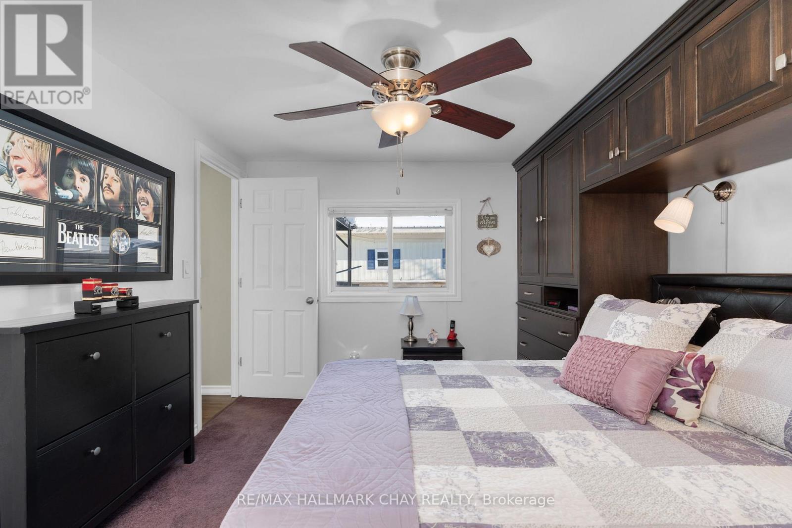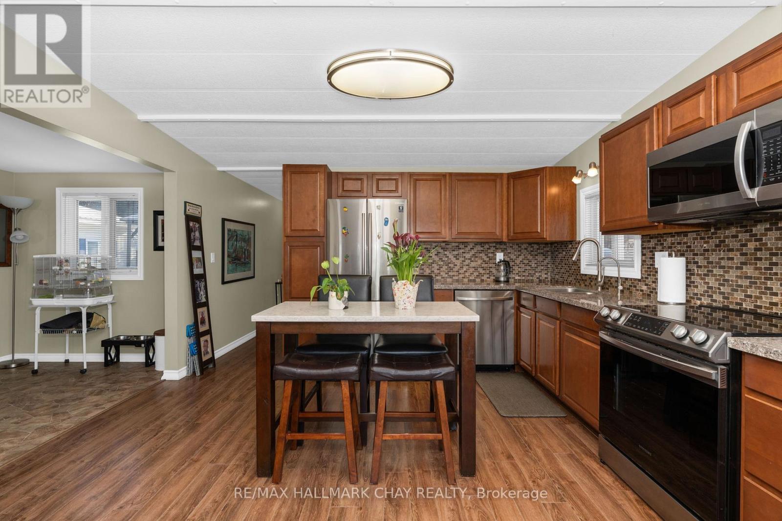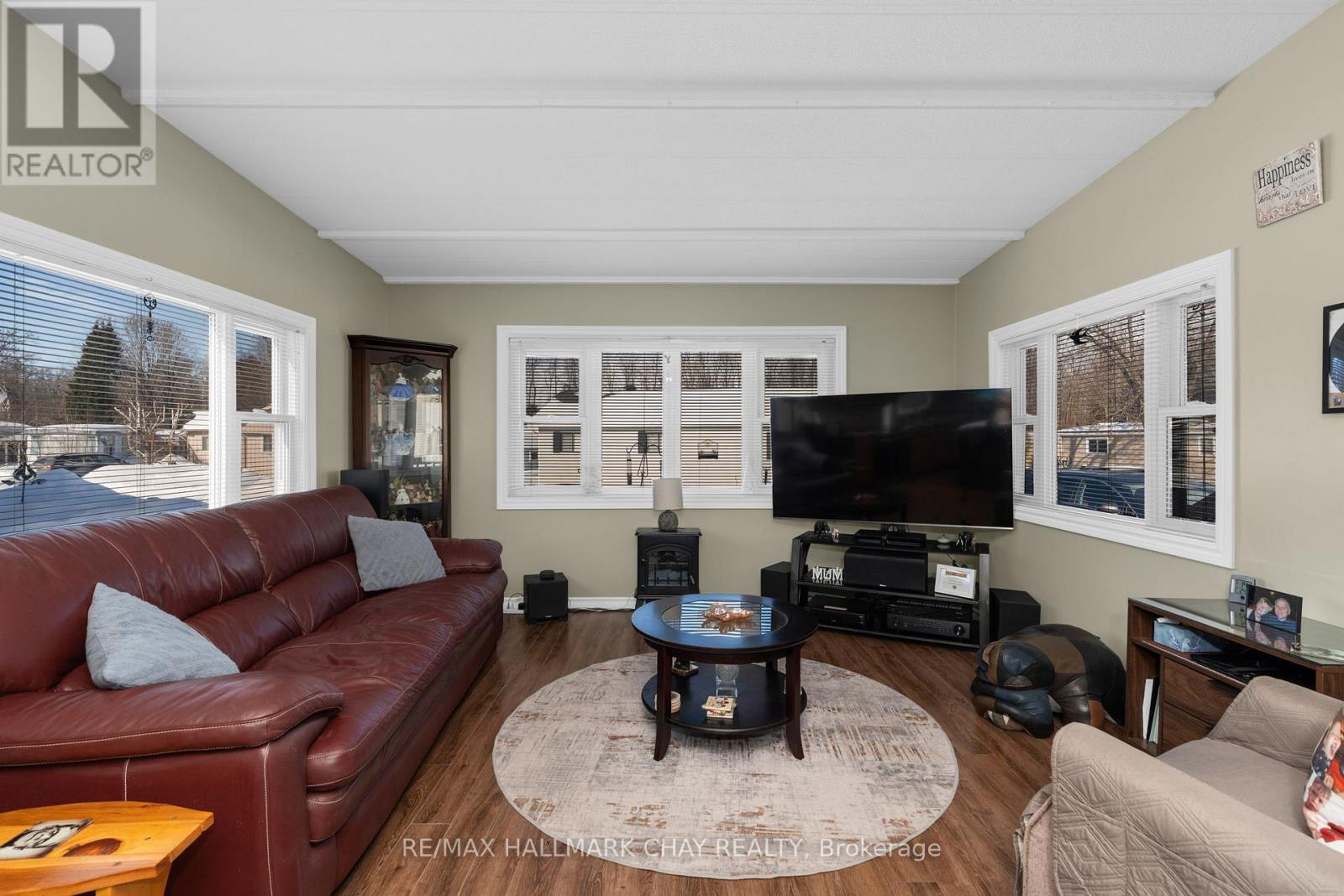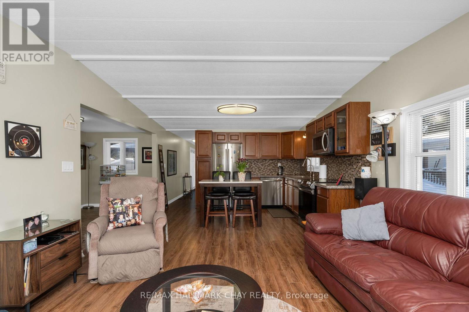 Perfect for first-time buyers or those looking to downsize, this well-maintained 2-bedroom modular home is located in the peaceful Hoe Doe Valley, ideally situated between Barrie, Angus, and Thornton. Set within a 24-acre co-ownership park, this bright, open-concept home features a sun-filled kitchen and living area with abundant windows, updated cabinetry, and newer flooring - making it truly move-in ready. The spacious primary bedroom includes a built-in queen-size bed with ample integrated storage, plus additional storage conveniently located beneath the bed. A functional mudroom provides extra space for organization, while two outdoor storage sheds offer even more room for your seasonal items. Step outside to enjoy an oversized deck complete with a gazebo - perfect for relaxing or entertaining. Additional highlights include a Generac generator for peace of mind during power outages, a tankless hot water heater, steel roof, and connection to the park's municipal water and sewer systems. Affordable monthly costs of $523 (including $200 allocated to the sewage system reserve fund) and an annual share of property taxes of just $373 make this an exceptional opportunity for affordable, low-maintenance living in a tranquil setting. (id:4555)