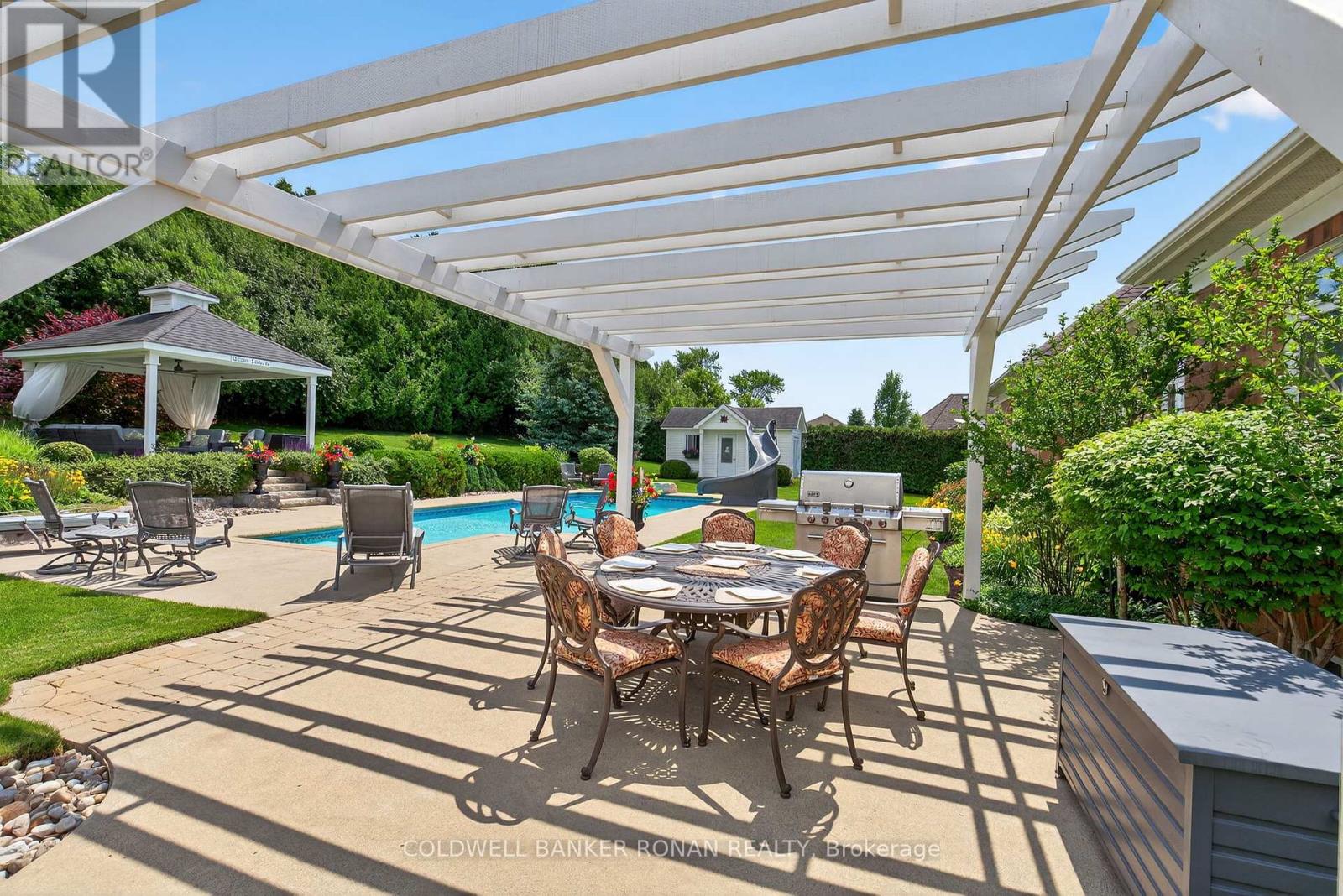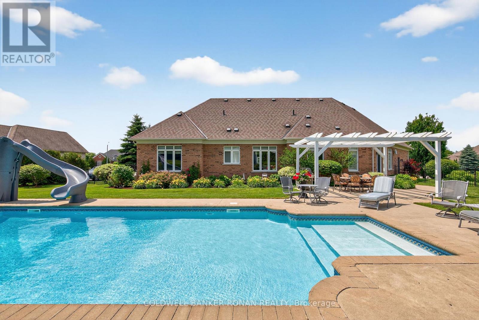 Welcome to Ridgehill Estates, located in Alliston, Ontario, where homes are rarely offered for sale. Just 45 minutes to the GTA, Alliston provides for tranquil living with all the amenities. Situated on just shy of an acre, this all brick & stone bungalow boasts luxury, elegance & beauty beginning at the tree-lined driveway that can accommodate many vehicles & boasts the most serene and completely private backyard oasis, surrounded by beautiful perennial gardens & offers an in-ground salt water pool, an elevated gazebo, a cabana/gardening shed & dining pergola. Fully fenced with privacy hedge plus in-ground sprinklers. The main floor of this bungalow has been completely renovated with high end finishes & lighting, including stunning kitchen with porcelain counters, an expansive eat at island, pantry, formal dining room with coffered ceiling, a cozy family room, a front living room /office, all three bathroom makeovers are a must see, upscale main floor laundry & mudroom off the 3 car garage & hardwood & beautiful modern porcelain tile flow throughout this sprawling 2382 sq ft home. On the lower level, you'll find another 2382 sq ft, with about half finished with an amazing rec room with kitchenette & bathroom, leaving plenty of room for a media room & nanny/in-law suite should you desire & is equipped with a backup generator. This lovely neighbourhood has 26.7 acres owned by the community & features many kilometres of exclusive forested walking trails & a social committee that organizes fun events throughout the year. Located just outside Alliston & only 10 min to Hwy 400. Award-winning golf is 5 min away, & ski hills & beaches are just a short drive. Perfectly suited for retirees or a young family looking to grow. (id:4555)
