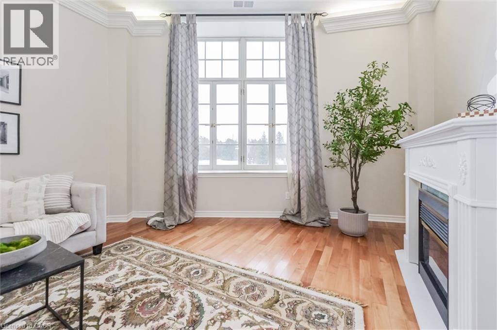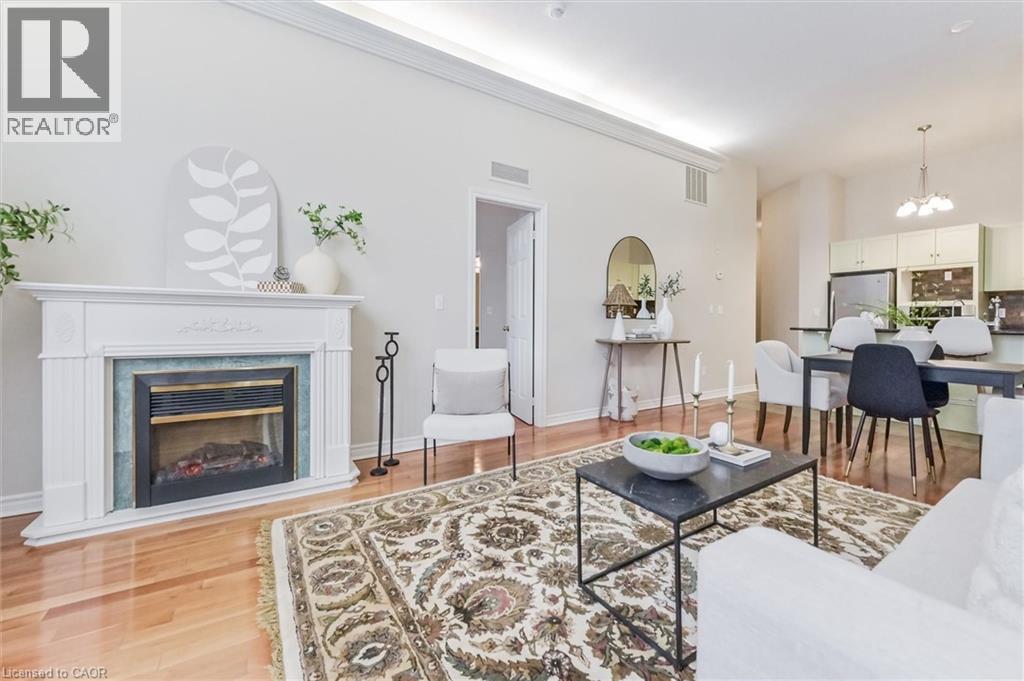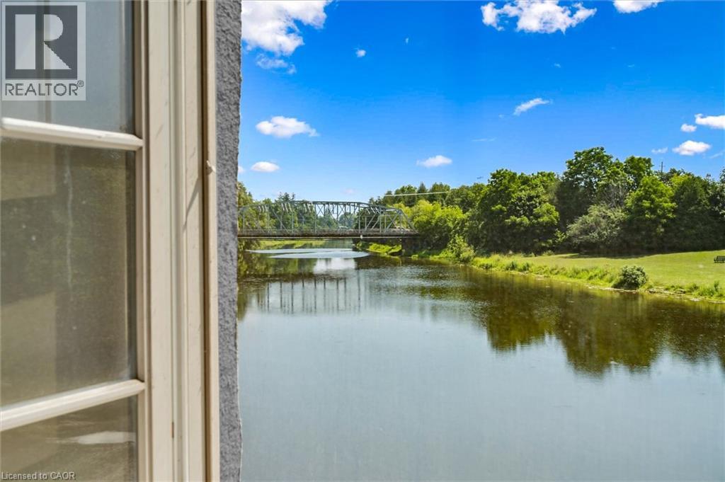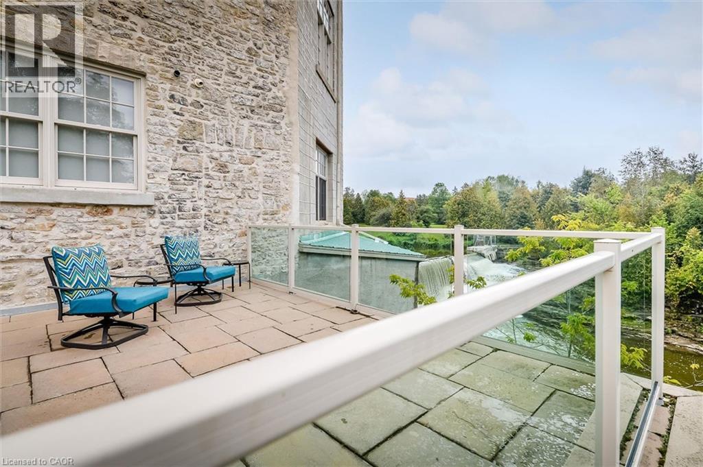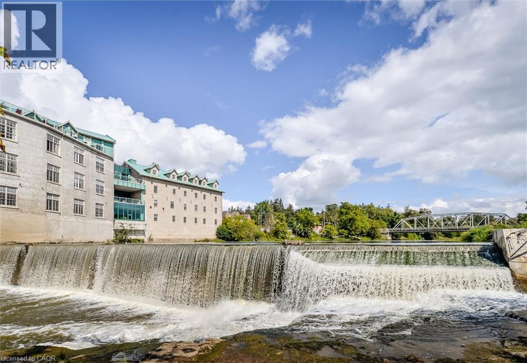 Heritage Charm Meets Riverside Serenity. A rare opportunity to downsize without compromise: Suite 104 at the Fergus Mill offers unmatched value with **6 months of condo fees included in the purchase**, giving you a worry-free start to homeownership. Set in one of Centre Wellington's most iconic buildings, this ground-level condo blends historic character with modern comfort. It features soaring ceilings, hardwood floors, and oversized windows that frame breathtaking views of the Grand River Falls. Thoughtfully designed for ease and elegance, the spacious 1-bedroom-plus-den layout includes two full bathrooms, a beautifully updated kitchen with high-end appliances, and a cozy fireplace perfect for quiet evenings. Enjoy direct access to scenic walking trails, patios, and tranquil waterfront views. Located just steps from downtown Fergus with its cafes, shops, and restaurants and minutes from the lively village of Elora. Explore nearby St. Jacobs and its famous farmers' market, or head into Kitchener-Waterloo for vibrant city life, all within a 30-minute drive. Stratford's acclaimed theatre district and Lake Huron's cottage country are also nearby for easy escapes. With two parking spaces (including a private garage), a personal storage locker, and pet-friendly amenities, this turnkey suite is truly the complete package. Whether you're retiring, rightsizing, or seeking a peaceful pace of life, this is your front-row seat to nature, community, and timeless architecture. (id:4555)