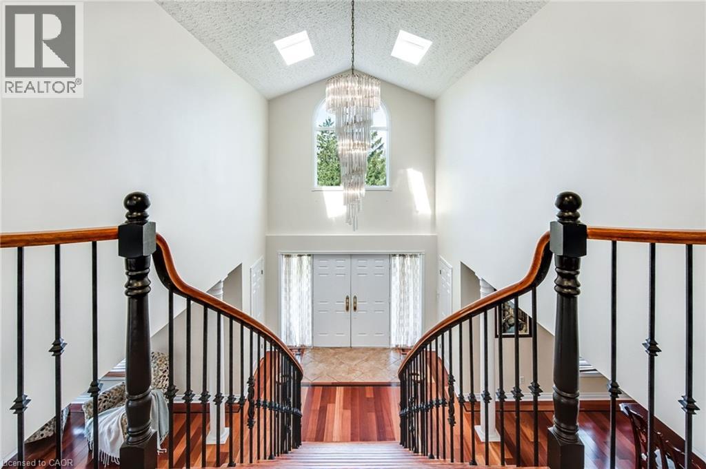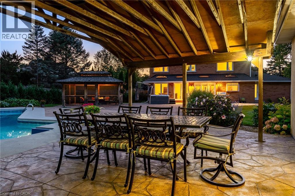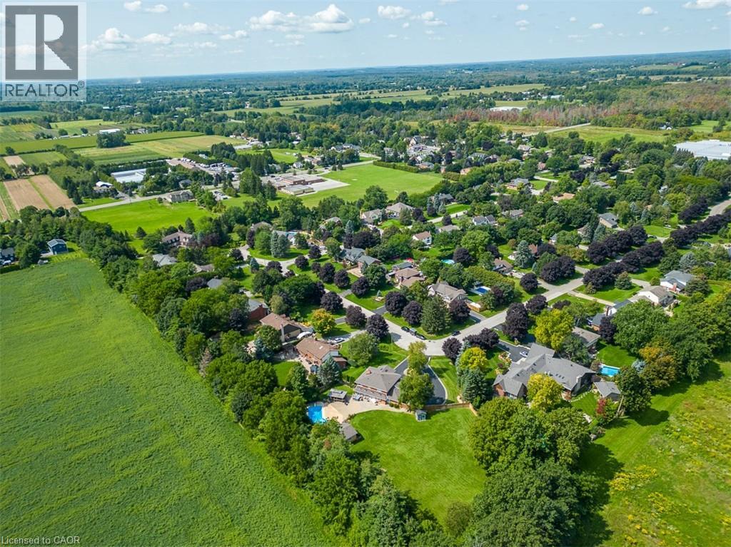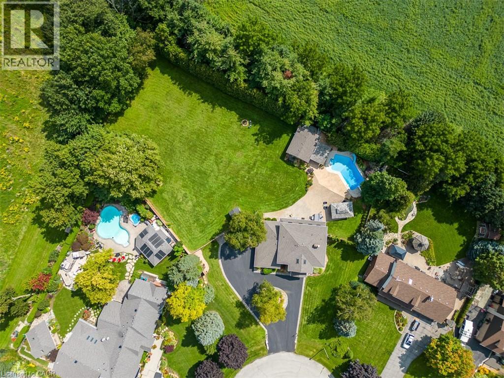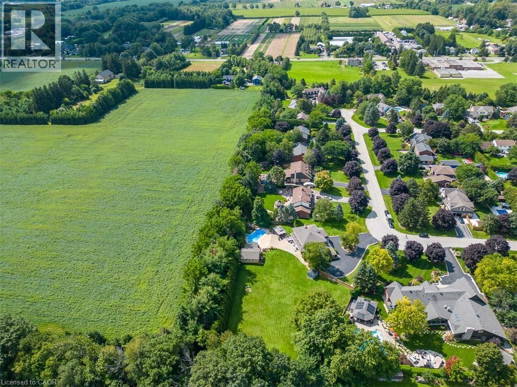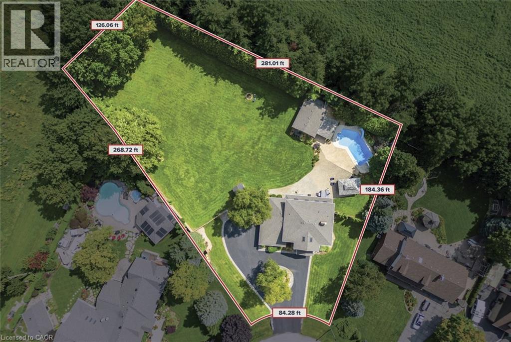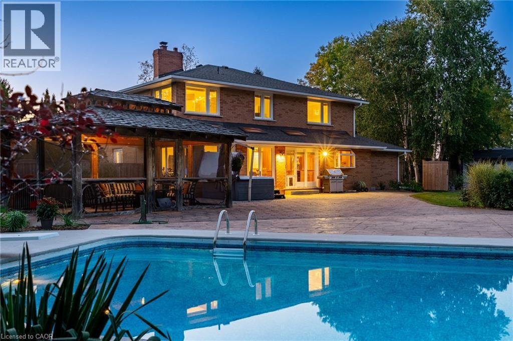 Situated on a quiet, beautifully manicured 0.99-acre lot in one of the most exclusive enclaves in the area, this impressive two-storey brick estate immediately captures attention with its elegant curb appeal, circular driveway, and landscaped centrepiece. This home has it all, offering four bedrooms, four bathrooms and over 4000 square feet of living space. No rear neighbours, an inground pool, hot tub, workshop & gazebo with a natural gas fireplace outside. The backyard is flat, unobstructed and surrounded by trees. Plenty of useable space for entertaining, family games/events and a huge ice rink. Breathtaking foyer illuminated by cascades of natural light and a stunning centre staircase. Exquisite Brazilian hardwood flooring flows seamlessly through the formal dining and entertainment spaces, where a natural gas fireplace adds a warm, ambiance ideal for both grand entertaining and intimate gatherings. The custom kitchen is a masterpiece of craftsmanship, featuring cherry maple oak soft-close cabinetry, under-cabinet lighting, heated floors, granite countertops, skylights, and a toe-kick central vacuum for effortless living. The step-down living room features large windows overlooking the private back yard, pot lights through-out and gleaming hardwood floors. The expansive primary suite impresses with two walk-in closets, custom built-in wall-to wall cabinetry, and an elegant ensuite featuring dual vanities and a walk-in shower. The fully finished basement features a spacious recreation room, a bathroom, a private office, an oversized storage room, and a separate walk-up staircase leading directly to the garage. Nestled in a prime location just five minutes from Waterdown, this location offers unrivaled access to excellent schools, parks, trails, golf courses, and fitness centers, a rare setting where every lifestyle amenity is within easy reach, yet the surroundings remain serene and exclusive. (id:4555)