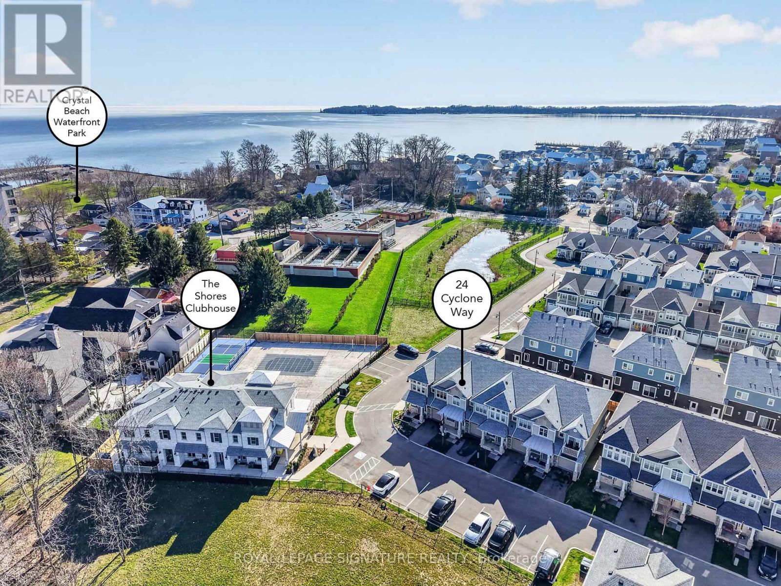 Welcome to 24 Cyclone Way! This freehold town offers 3 bedrooms and 3 bathrooms with approx. 1,575 square feet of above-grade living space. Open concept main floor features luxurious wainscoting detail, a combined modern kitchen and living area, a gas fireplace, and a walkout to the backyard with a gas BBQ hookup. Functional layout with a floating staircase & garage access through the foyer. Upper leve features a primary bedroom with a built-in walk-in closet and an ensuite bath, plus two additional spacious bedrooms. Basement provides extra square footage, future potential, and includes a laundry area. Equipped with central air, a furnace-mounted humidifier w/ whole home humidity control, and wired ethernet ports throughout. Attached garage with slat-wall storage system and retractable hose, plus private driveway parking.Located in Crystal Beach, it is steps from Bay Beach and waterfront access, with close proximity to Ridgeway, local restaurants, cafes, and shops. Easy access to Fort Erie, Niagara Falls, and the Niagara wine region. Residents have access to the Shores Club, which offers an indoor/outdoor lounge, catering kitchen, fitness room, private workspaces, coffee bar, resort-style outdoor pool with a cabana, a sports court, and party/meeting spaces. Suitable for buyers seeking a newer home in a beach-oriented community with added lifestyle amenities. This won't last! (id:4555)